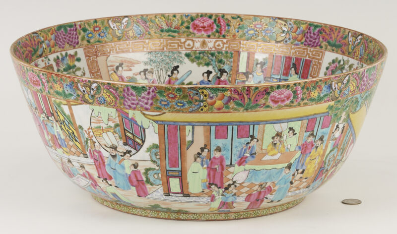 Lot 15: Large 19th C. Chinese Rose Mandarin Punch Bowl, 18″ Dia.