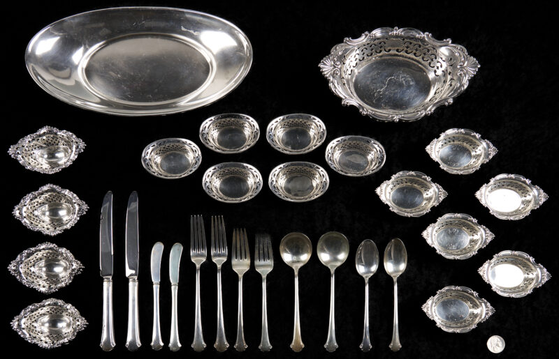 Lot 623: 30 pcs Sterling: Nut Dishes, Bread Tray, Towle Chippendale Flatware