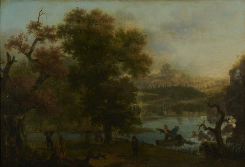 Lot 766: Continental 18th C. Landscape Painting w/ Dogs, Horses & Rider