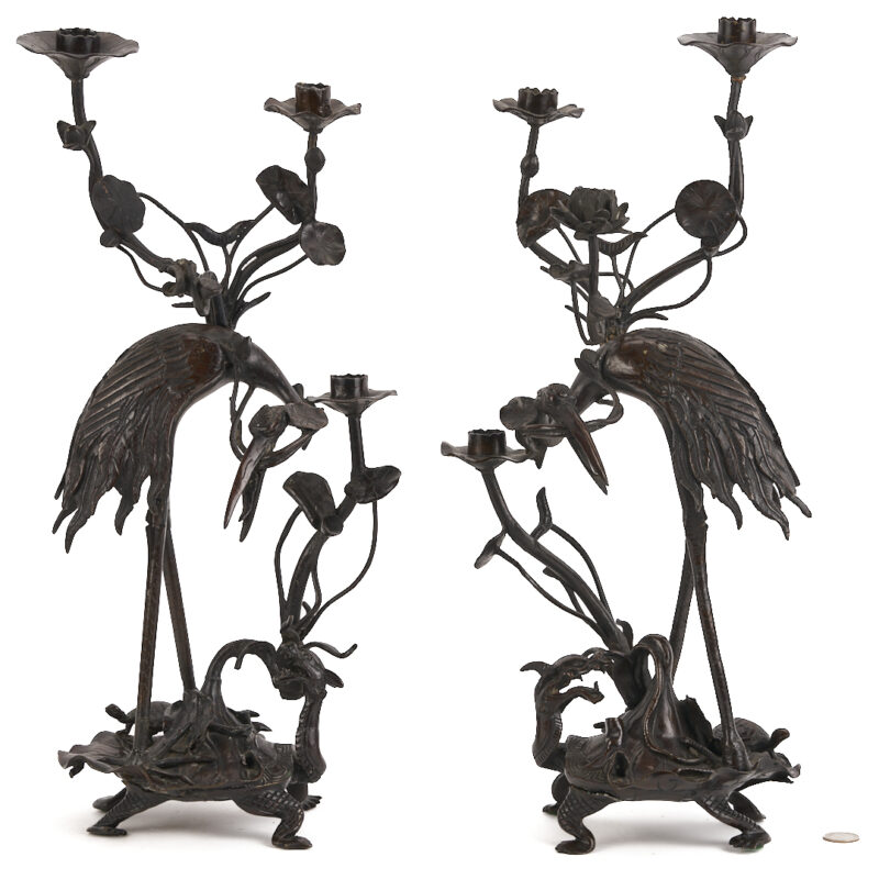 Lot 883: Pair of Japanese Meiji Bronze Crane Candlesticks
