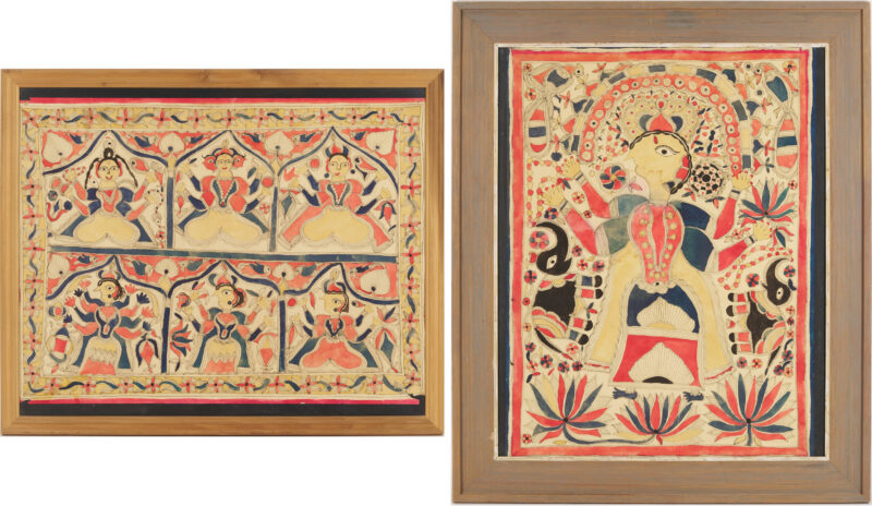 Lot 1187: 2 Madhubani Ink & Watercolor Paintings, Devi Durga