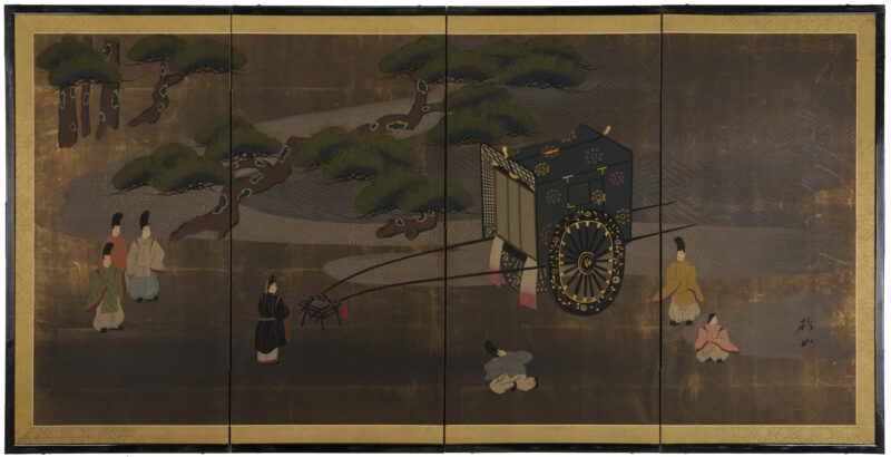 Lot 1193: Japanese Painted Screen, Landscape w/ Rikshaw & Figures
