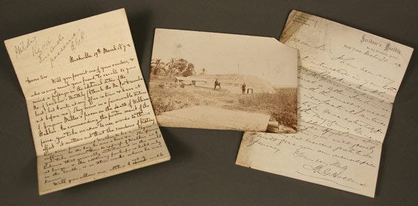 Important portrait of William Walker, “The Grey Eyed Man of Destiny”, by Nashville artist, George Dury (1817-1894). The painting is signed on the back, “Dury 1858”. Oil/gouache on paper. This painting had previously been attributed to artist Washington Cooper in John Edwin Woodrow’s book, “John Berrien Lindsley” (illustrated on page 85). William Walker was a physician, lawyer, and journalist. A Nashvillian, Walker was the only Tennessee born president of another country, the Republic of Nicaragua. At age 14, Walker graduated from the University of Nashville. He was then awarded a medical degree from the University of Pennsylvania at age 19. He became qualified to practice law in New Orleans in 1847 and later became editor of the New Orleans Crescent. In 1848, he became the editor of the San Francisco Herald. The “manifest destiny” vision of the time reflected Walker ambitions. In California, He began the efforts of organizing a filibustering expedition to conquer Lower California and the State of Sonora. He invaded Mexico in 1853 and proclaimed himself President of Lower California, violating U.S. neutrality laws. Later in 1853, Walker organized a small expedition of men to conquer Nicaragua. Within five months, he was made commander in chief of the new coalition provisional government of Nicaragua. In 1856, William Walker was elected as the President of Nicaragua. In the summer of 1856, Guatemala, Honduras, Costa Rica, and San Salvador declared war on Nicaragua. Cornelius Vanderbilt viewed Walker as a threat to his American Transit Company in Nicaragua and aligned Costa Ricans against him, forcing him to surrender to U.S. Naval Authorities. In 1857, Walker planned his return to Nicaragua with a force of 240 volunteers. Elements of the U.S. Navy demanded his surrender for violating U.S. neutrality acts. Walker was brought back to the U.S. where President James Buchanan and several Senators castigated him for his filibustering activities. Walker became bolstered by a wave of Southern support and unsuccessfully attempted subsequent expeditions to Nicaragua. In 1860, The blockade maintained by British and American cruisers in the Caribbean forced Walker to take another route to Nicaragua through the east coast of Honduras. He was pursued by a large force of Hondurans and a British war ship. After surrendering to a British captain, Walker and his men were turned over to the Honduran authorities. Walker was given a trial and executed by firing squad on September 12th, 1860. Note – William Walker was a close friend of Dr. John Berrien Lindsley, and this is the only portrait known painted from life of him. Original frame. Condition – very good condition for age, small tear to upper margin. Dimensions sight 7 1/2″ x 9 1/2″, frame 13 1/4″ x 16 1/4″. Circa 1858. Lindsley Warden estate. Note – Nashville artist, Friedrich Julius George Dury was born in Wurzburg, Bavaria and exhibited at the Munich art Association. He arrived in Nashville in 1850 and painted several prominent Tennesseans including Felix Grundy and Civil War officers including General P.G.T. Beauregard, General William Rosecrans, General George Thomas, Governor Brownlow. He also did bust portraits of Abraham Lincoln and Andrew Johnson. Additional items with this lot – Four books related to William Walker: “The Southern Dream of a Caribbean Empire, 1854-1861” by Robert E. May, 1973 (signed and inscribed to Margaret Lindsley Warden), “Destiny and Glory” by Edward S. Wallace, 1957 (ex-library copy), and “El Filibustero” by Clinton Rollins (paperback, 1976), with author’s signature and inscription to Margaret Lindsley Warden, which reads “The first volume of a set to be enriched by her generous contribution of Walker’s letters to Dr. Lindsley (which will be reproduced in a succeeding volume) — with cordial greetings from the author.”, and “Freebooters must die: The Life and Death of William Walker..” by Frederick Rosengarten. Additional items – a period photo showing two soldiers in a Central American setting standing in front of a fortified building with sandbags surrounding it. Stamped on the back, “MI BOHIO CIENFUEGOS”. Additional item – an eight page letter dated March 1872 Nashville written by J.C. Thompson in which Thompson gives a biographical summary of Walker’s life to Scribner’s Monthly, New York. Last item – a letter from Nicaragua by Dr. Alejandro Bolanos Geyer in 1974 transcribing and translating to Spanish articles written by William Walker.