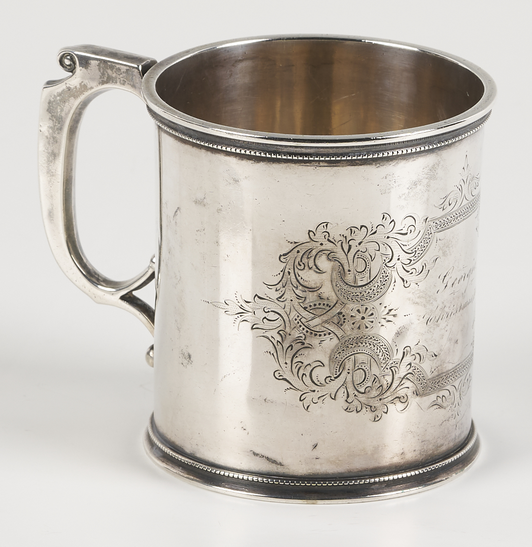 Eight assorted pieces of coin and early sterling silver including Charleston, Baltimore, and Covington, Ky. Includes: one (1) coin silver cup with a beaded rim and foot and engraved foliate cartouche, marked for Duhme and Co. (Cincinnati, 1842-1888) , one (1) coin silver serving spoon marked for R & A Campbell (brothers Robert & Andrew Campbell, working Baltimore, MD ca. 1835-1854), one (1) teaspoon marked “Hayden & Gregg” in rectangle (Charleston, South Carolina 1843-1846), one (1) teaspoon marked “Gregg Hayden & Co” in rectangle (Nathaniel and Sidney Hayden and William Gregg, Charleston, South Carolina, mark used 1846-1852), one (1) teaspoon marked “J. Ewan” (working Charleston, SC c. 1825-1850), and three (3) early sterling teaspoons marked “F. Pieper” (working Covington, KY 1866-1905), all with fiddle tipt handles. 8.77 total coin troy ounces. 1.38 total sterling troy ounces.