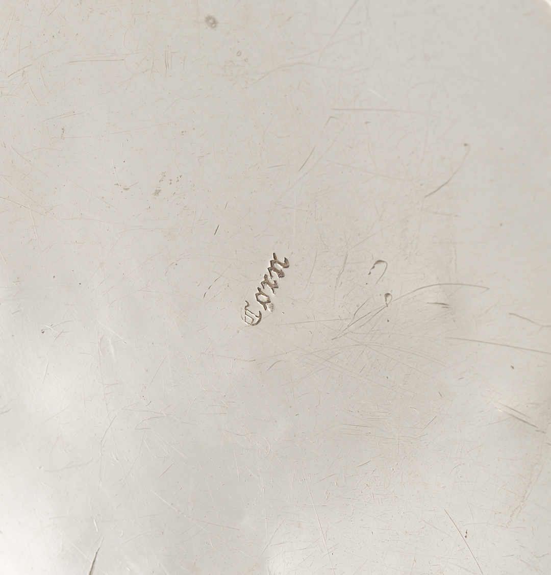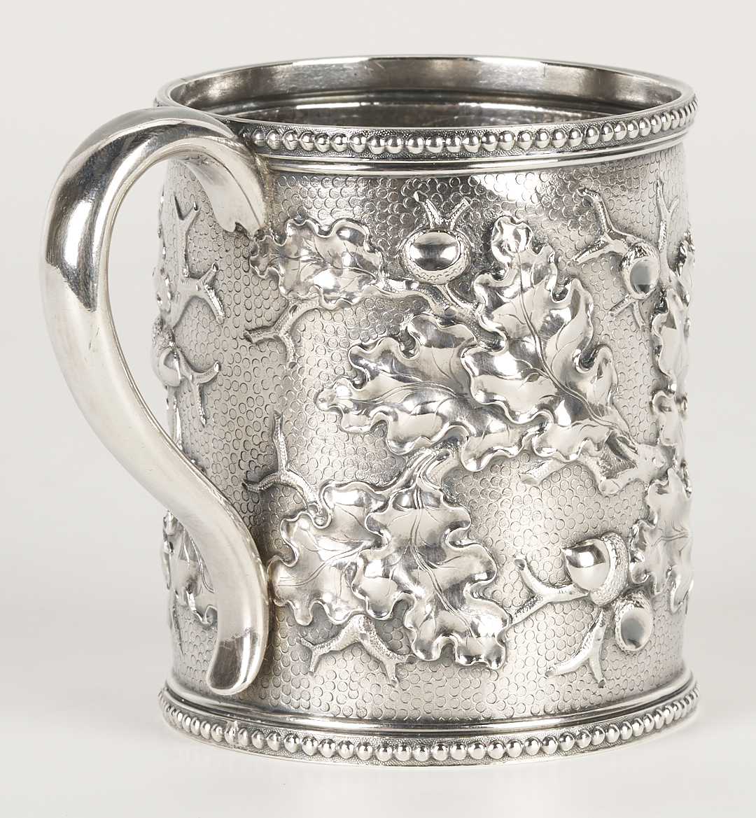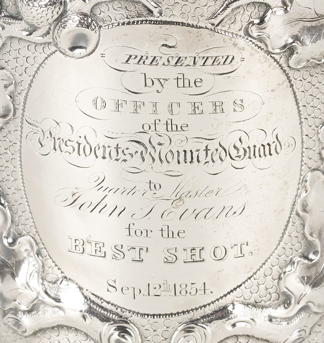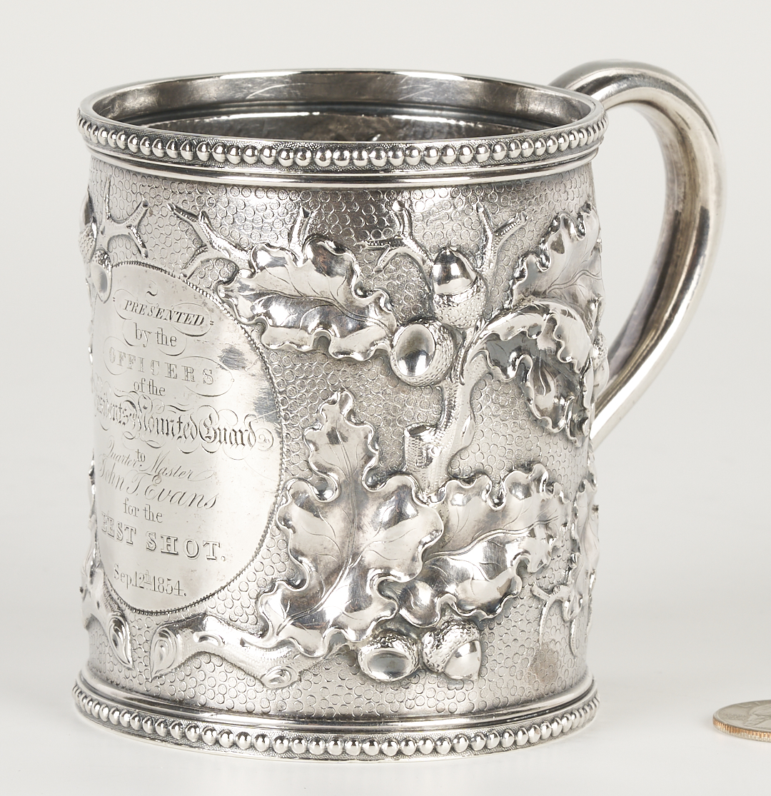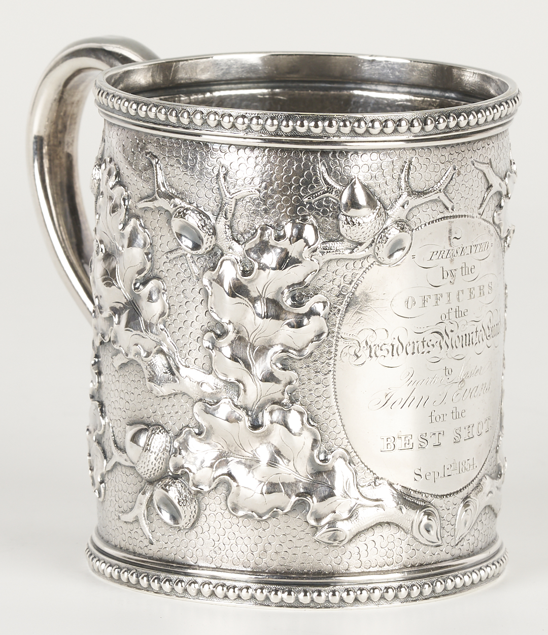 American coin silver repousse cup or mug with militaria inscription: PRESENTED BY THE OFFICERS OF THE PRESIDENT’S MOUNTED GUARD TO QUARTERMASTER JOHN T.(?) EVANS FOR THE BEST SHOT, SEPT. 12, 1854. The circular reserve housing the inscription is surrounded by repousse oakleaf and acorn decoration, on an all-over circular stamped surface, set within beaded rims. Stamped COIN to the underside. 3 1/2 in. H, 5.58 oz troy.