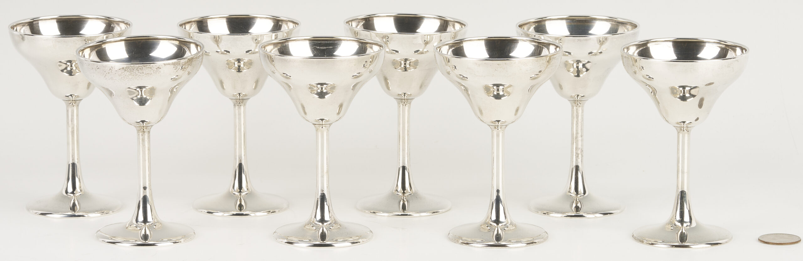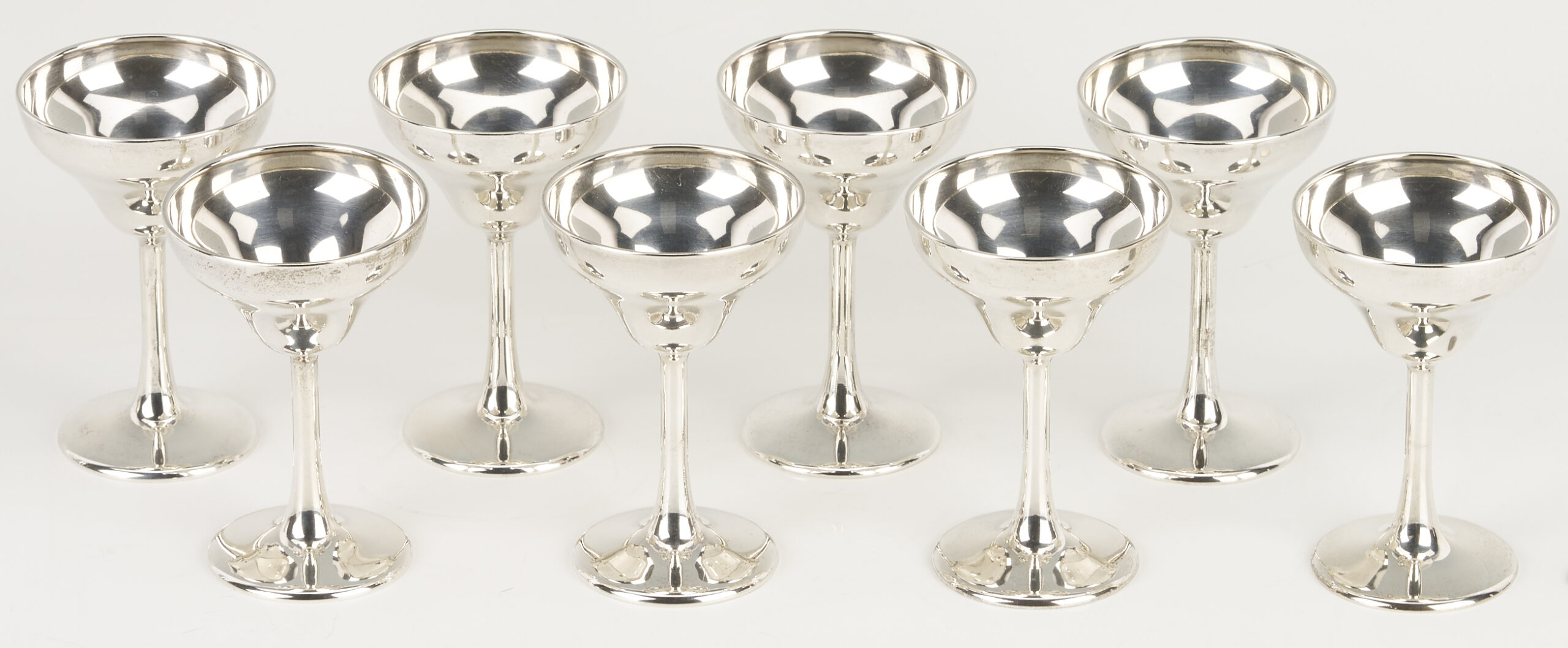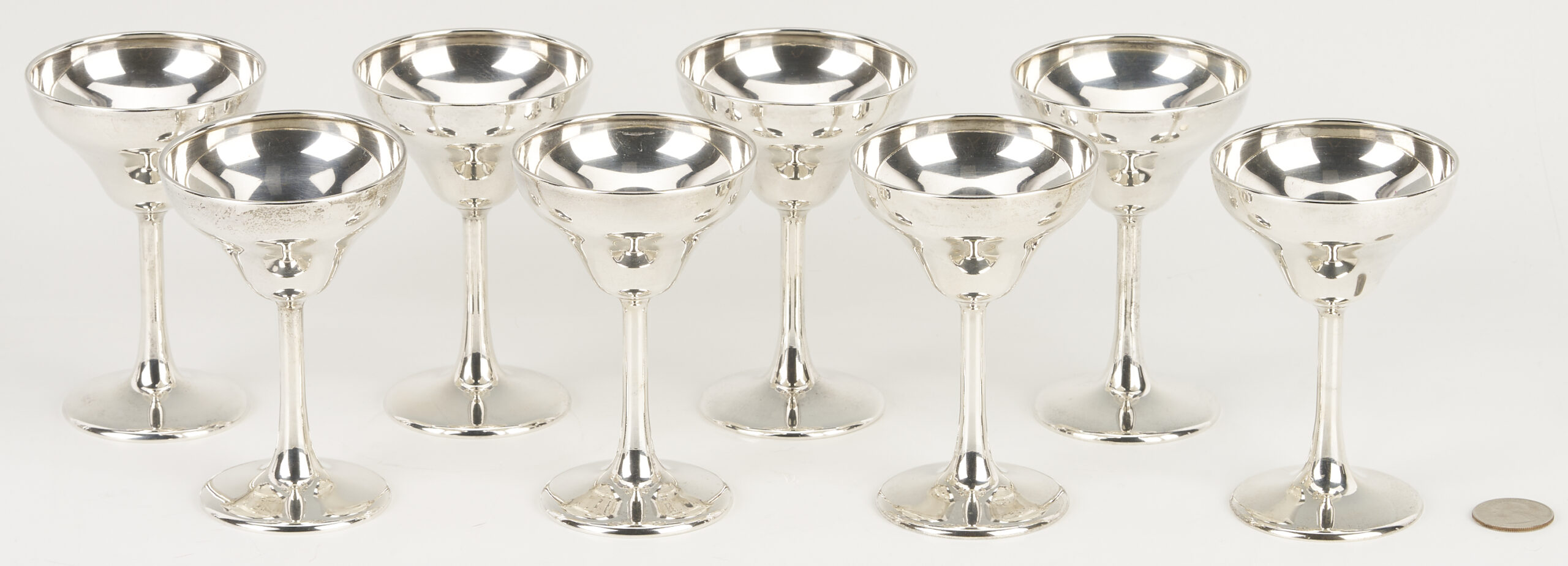 Set of eight (8) Mid Century Modern sterling silver champagne, sherry or cordial cocktail goblets, stamped to underside for maker and pattern number, Frank Smith Silver Company, #3706. Each 4 1/4 in. H. Combined weight 14.91 oz troy.
