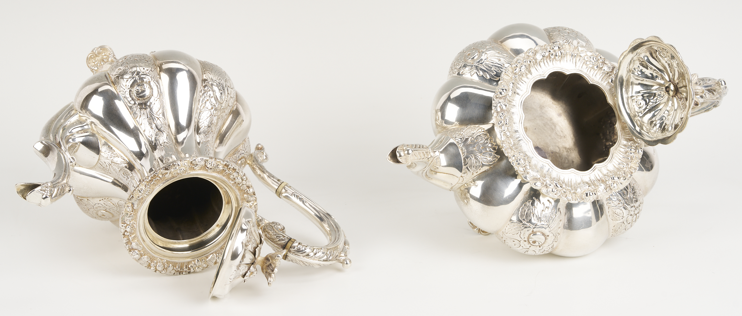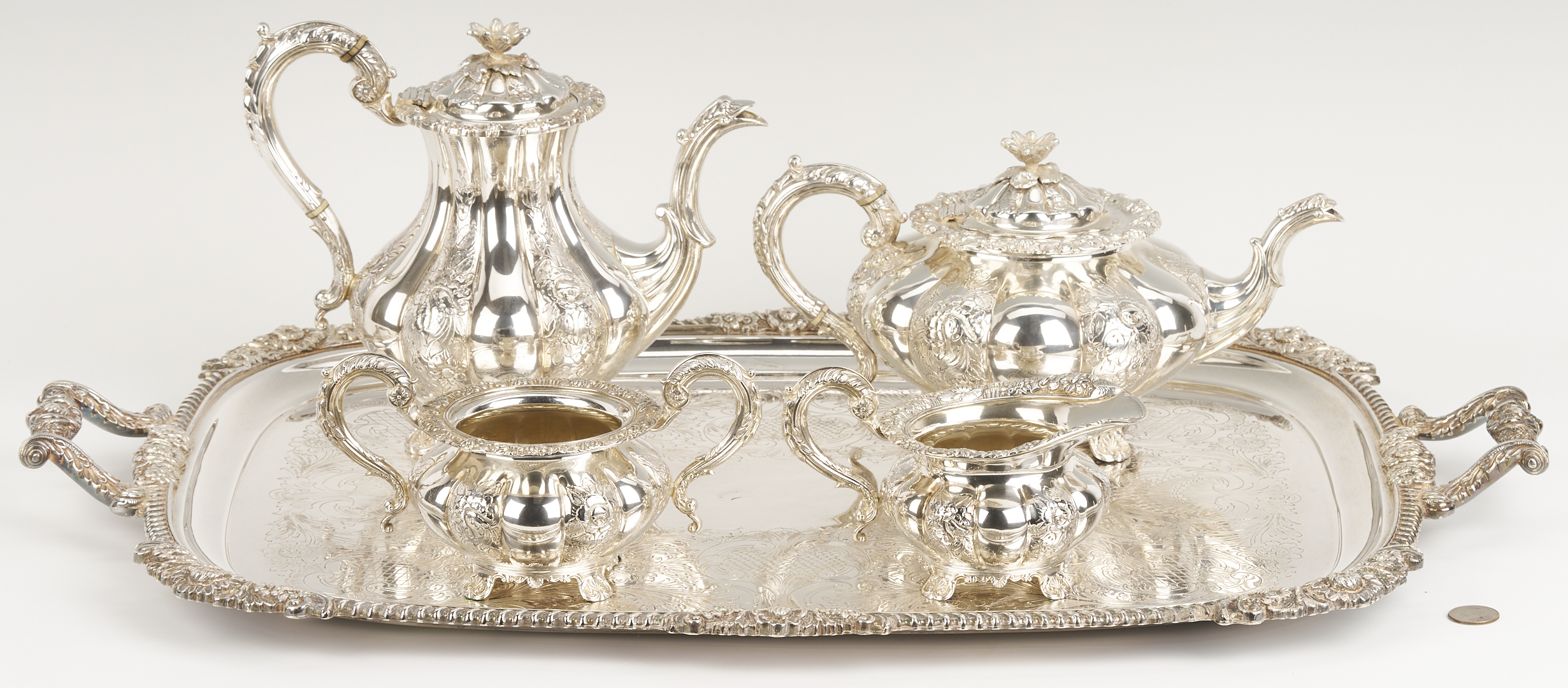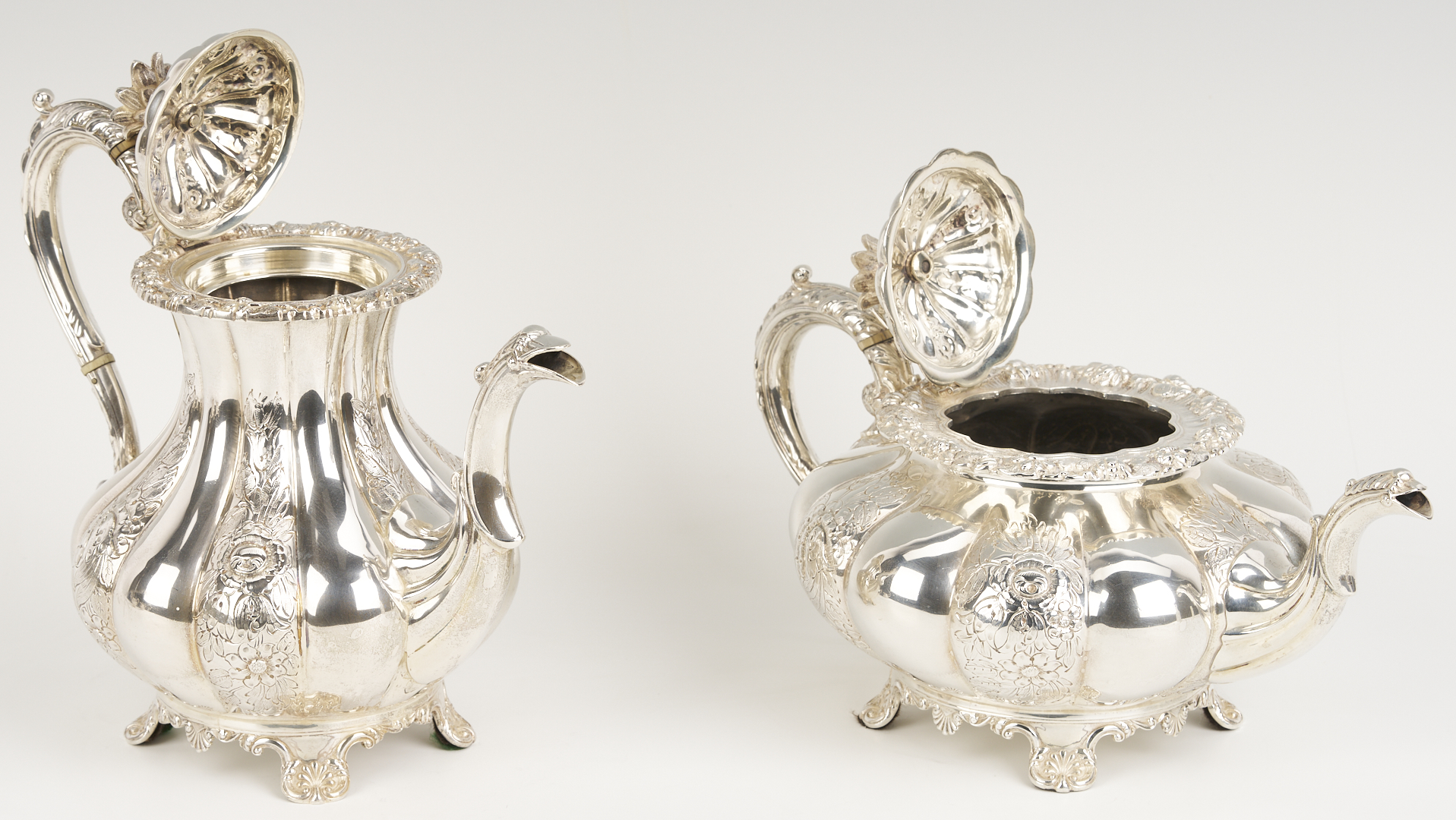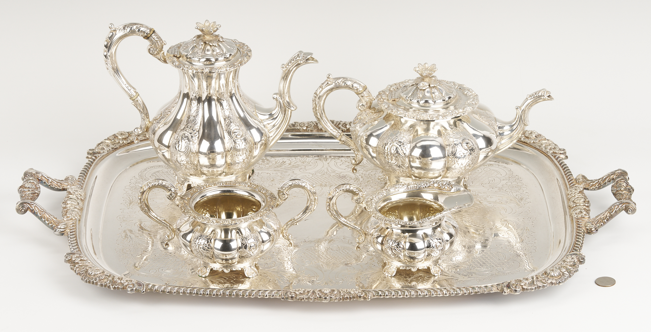 Barker Ellis sterling silver tea service consisting of teapot, coffee pot, sugar bowl, and creamer, each hallmarked for Birmingham, England, 1866. All pieces of melon form with chased and engraved foliate decoration, C-scroll handle, and flower finials. Ranging in size from 4 1/4 in. H x 7 in. dia. to 8 1/4 in. H x 10 1/4 in. dia. Together with a rectangular silverplate tray with similar floral decoration marked for Charles Howard Collins, Birmingham, England. 19 1/4 in. H x 24 1/4 in. W. Tea service – 111.84 total troy ounces.