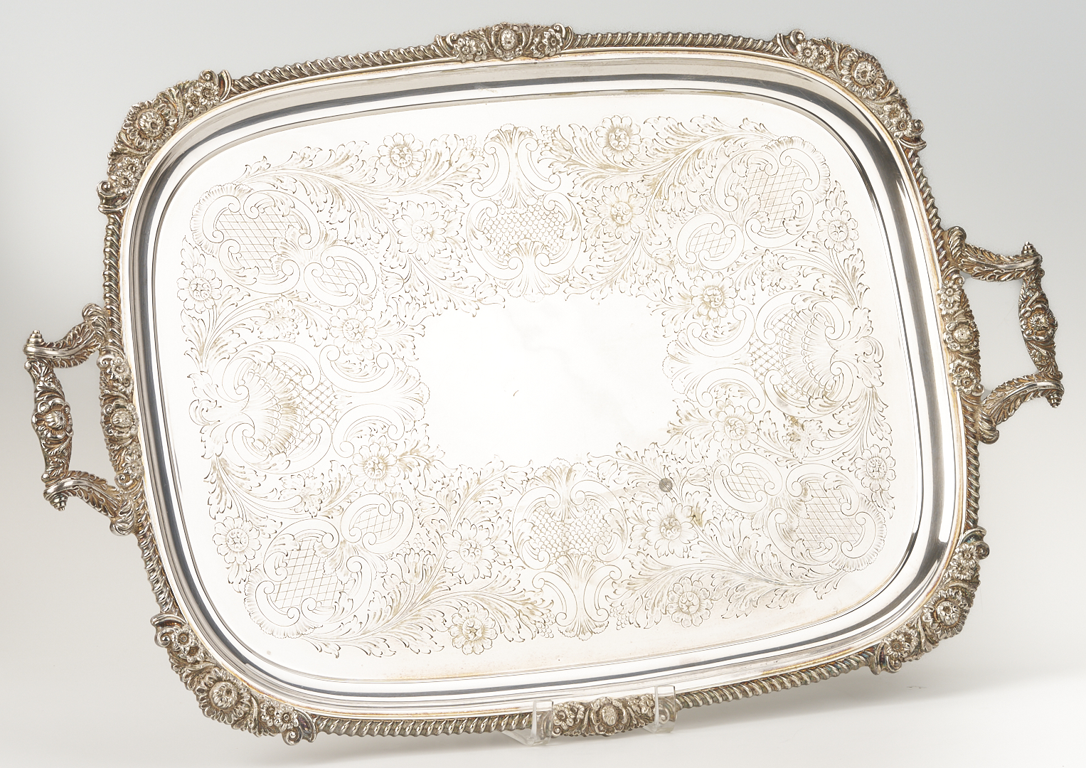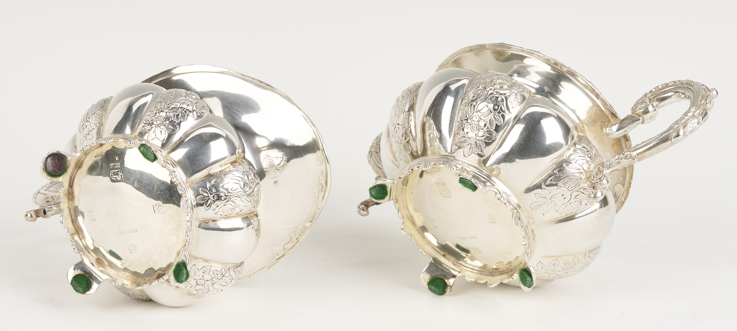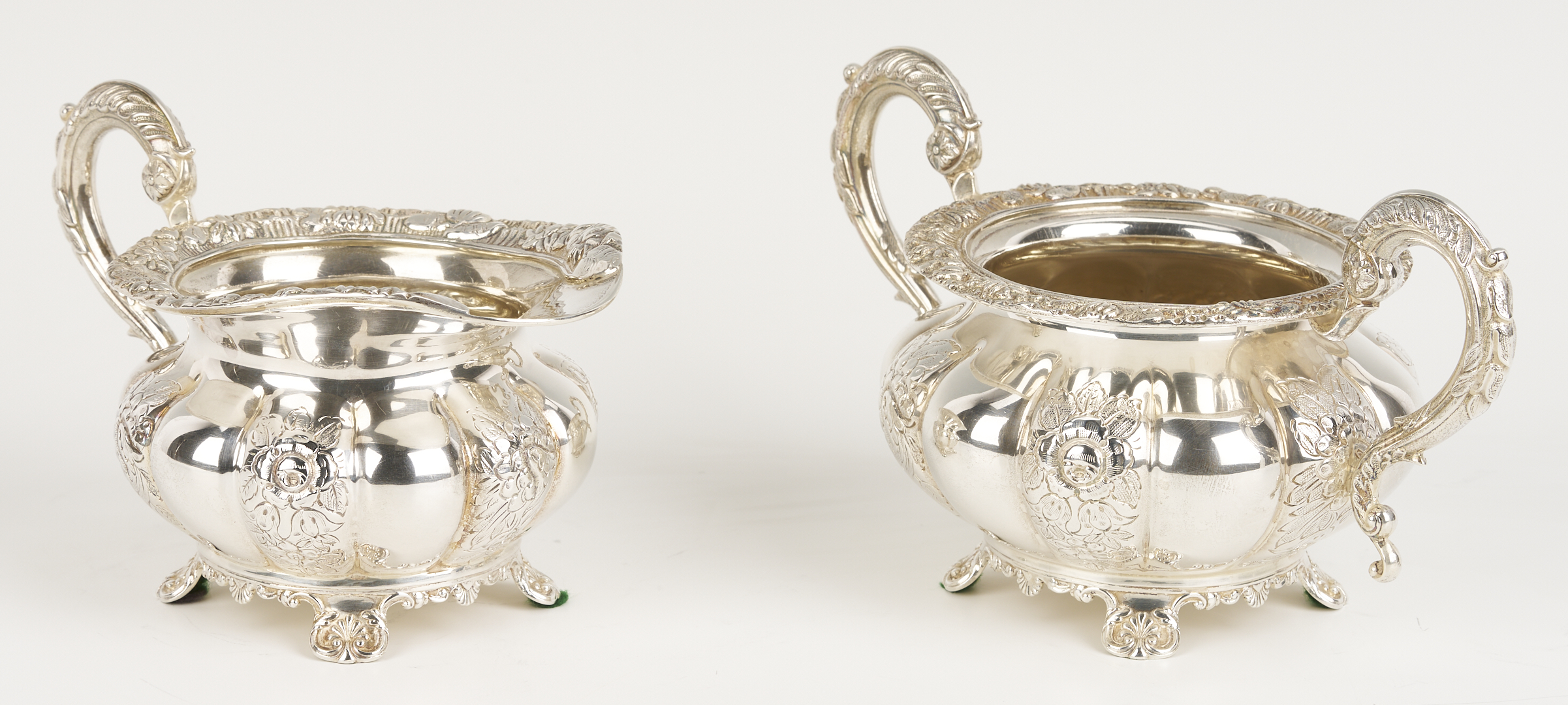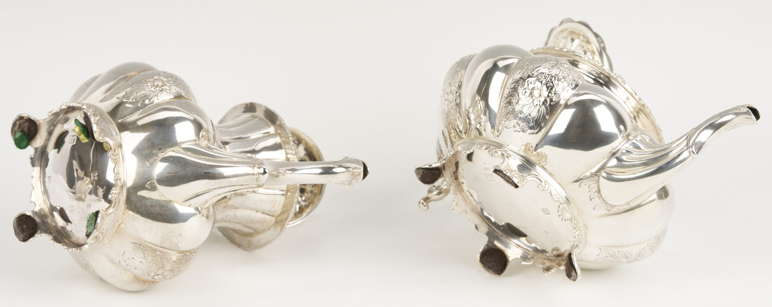 Barker Ellis sterling silver tea service consisting of teapot, coffee pot, sugar bowl, and creamer, each hallmarked for Birmingham, England, 1866. All pieces of melon form with chased and engraved foliate decoration, C-scroll handle, and flower finials. Ranging in size from 4 1/4 in. H x 7 in. dia. to 8 1/4 in. H x 10 1/4 in. dia. Together with a rectangular silverplate tray with similar floral decoration marked for Charles Howard Collins, Birmingham, England. 19 1/4 in. H x 24 1/4 in. W. Tea service – 111.84 total troy ounces.