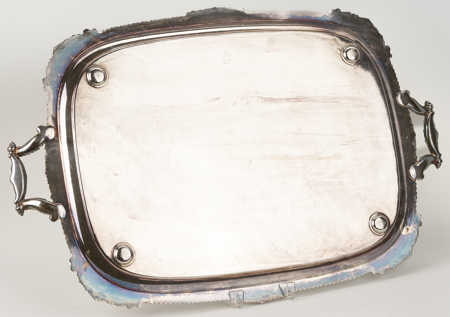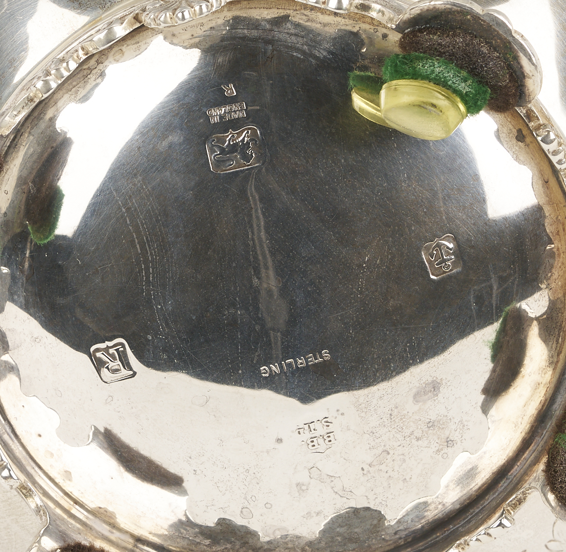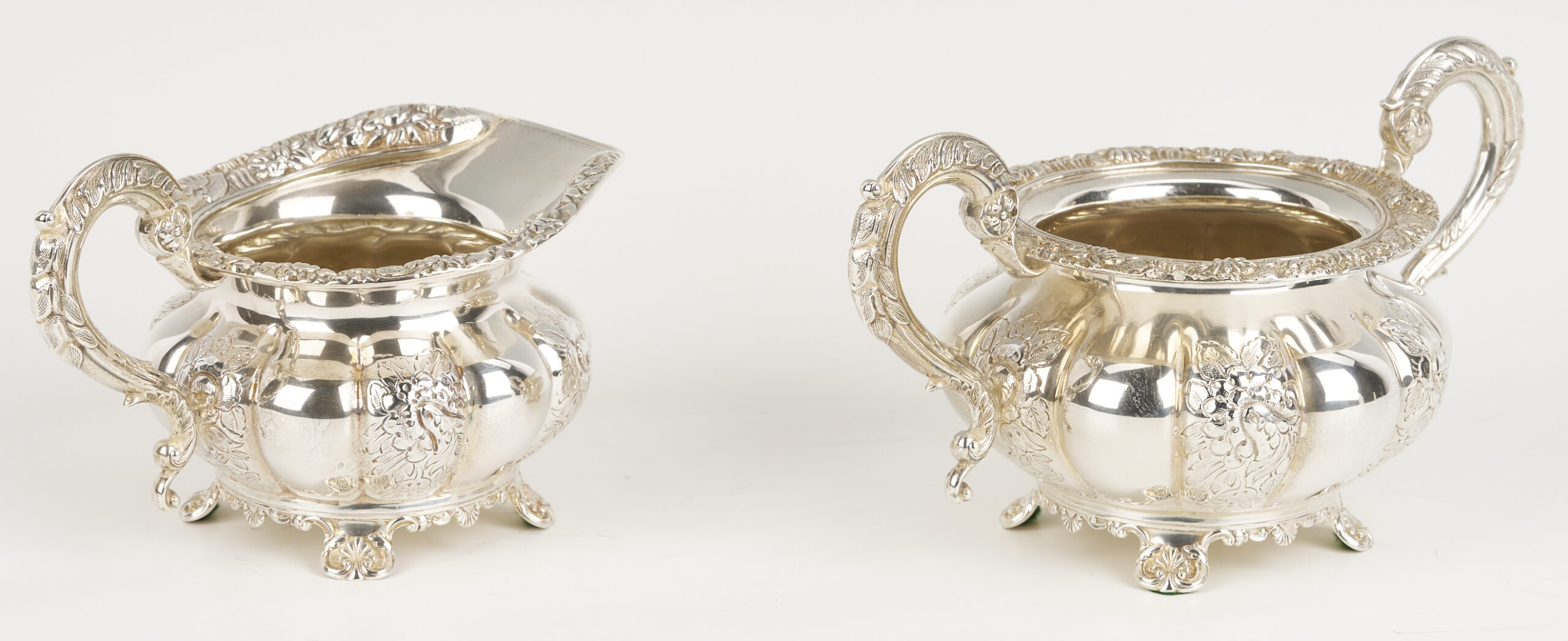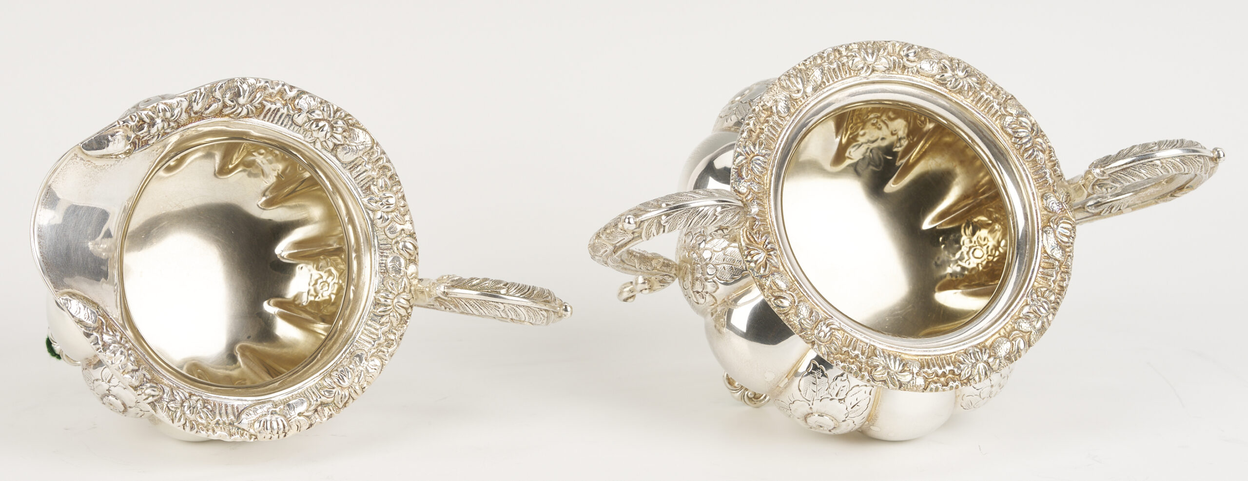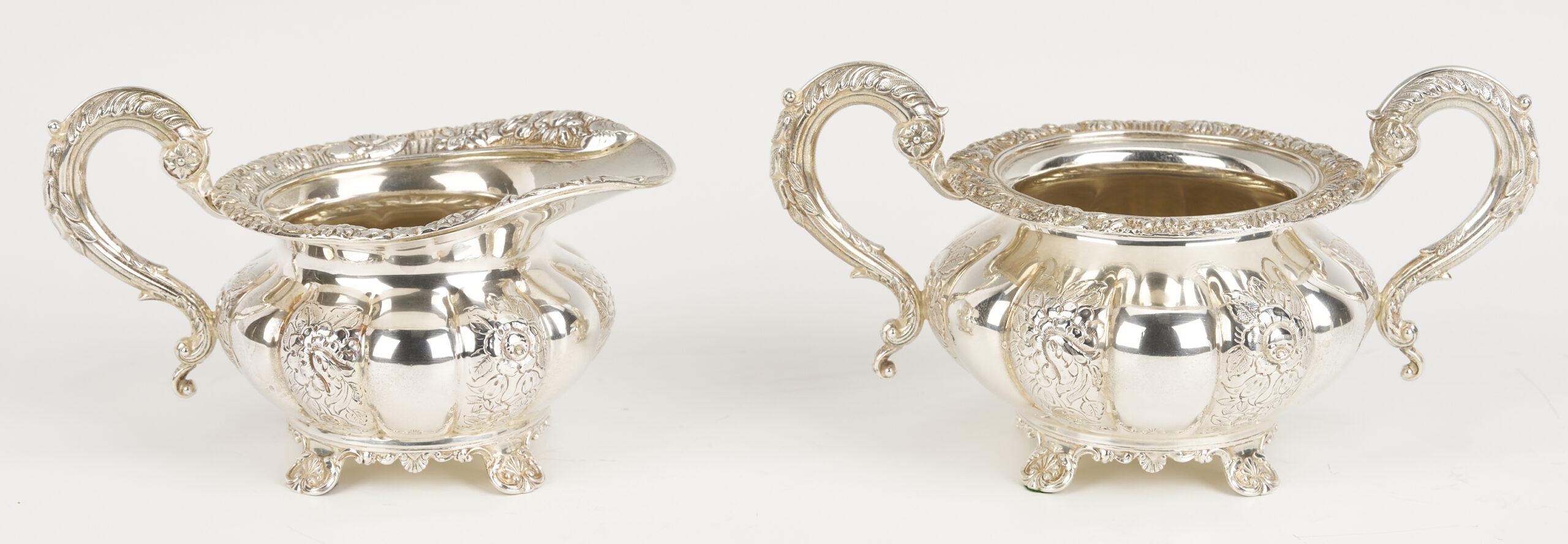 Barker Ellis sterling silver tea service consisting of teapot, coffee pot, sugar bowl, and creamer, each hallmarked for Birmingham, England, 1866. All pieces of melon form with chased and engraved foliate decoration, C-scroll handle, and flower finials. Ranging in size from 4 1/4 in. H x 7 in. dia. to 8 1/4 in. H x 10 1/4 in. dia. Together with a rectangular silverplate tray with similar floral decoration marked for Charles Howard Collins, Birmingham, England. 19 1/4 in. H x 24 1/4 in. W. Tea service – 111.84 total troy ounces.