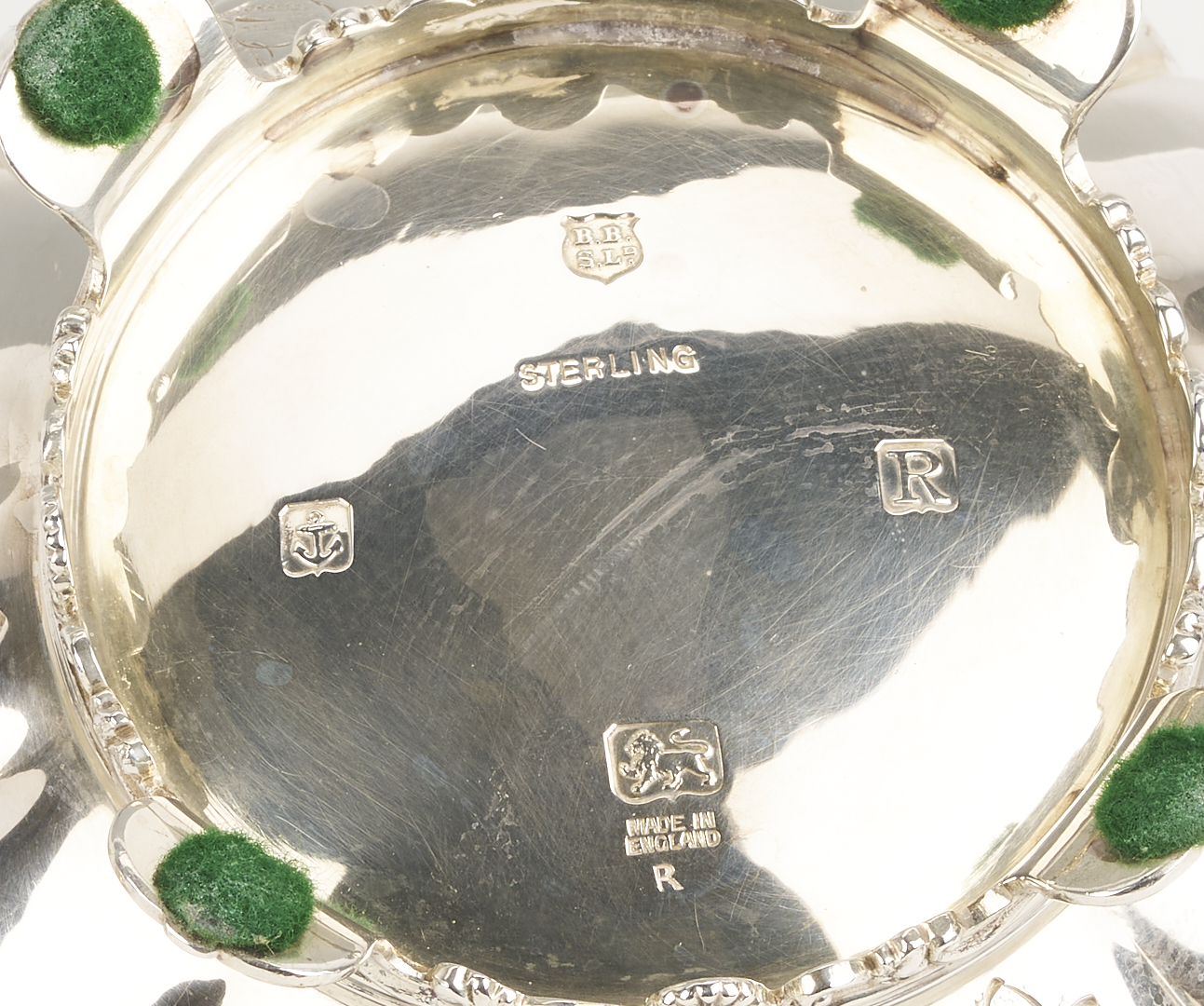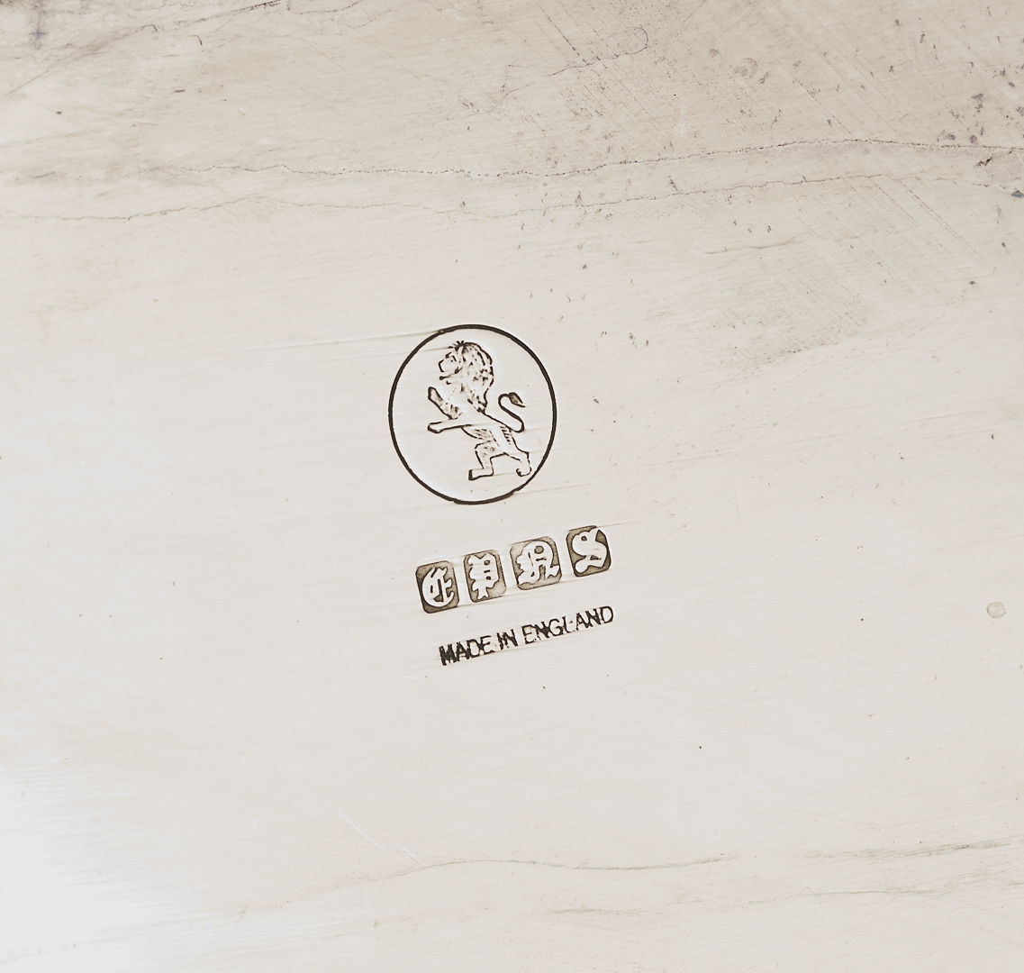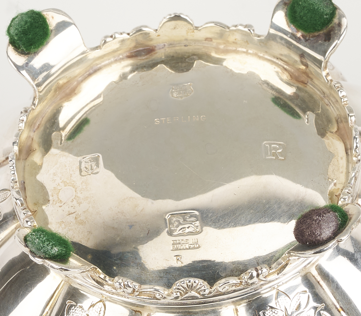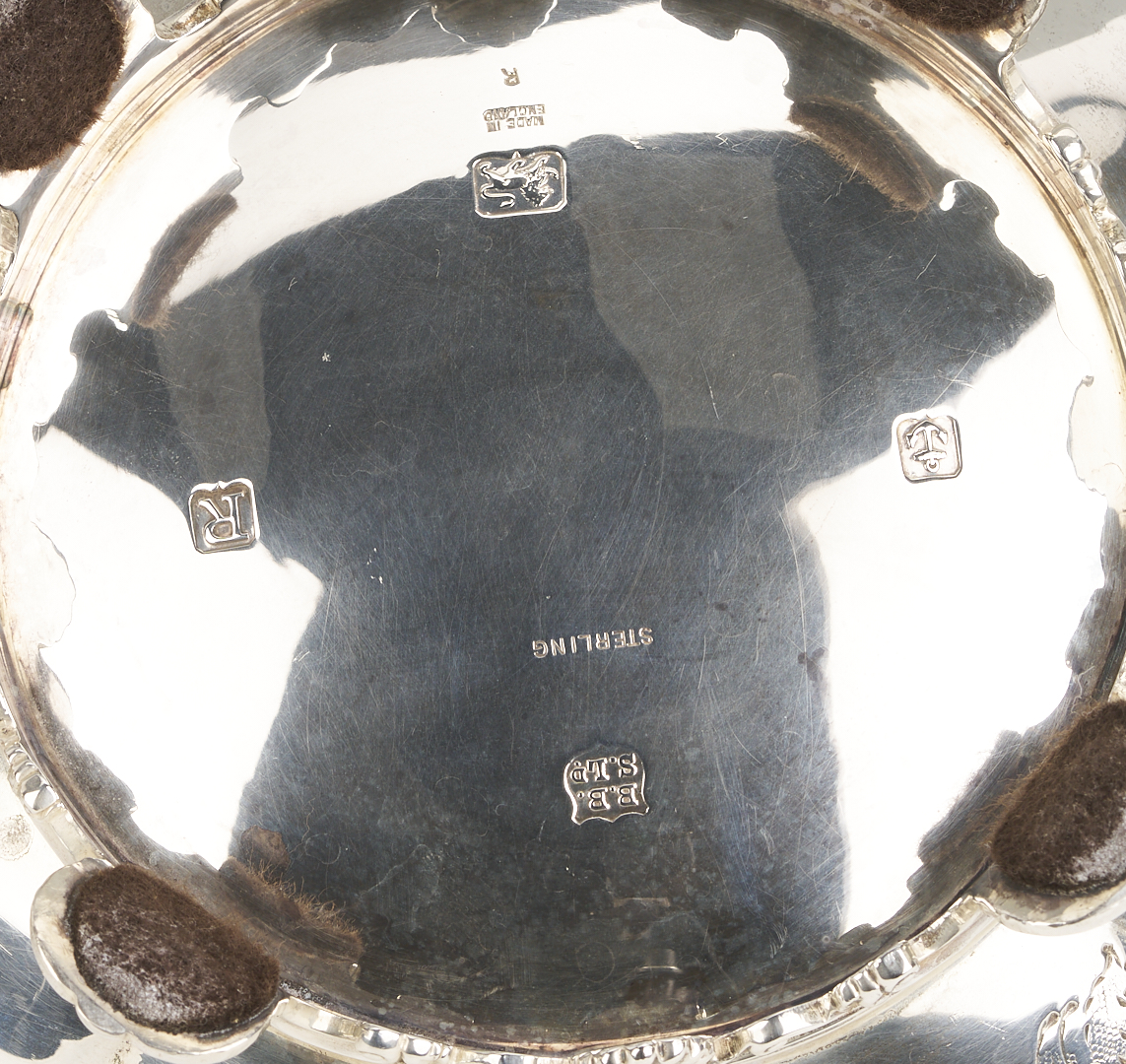 Barker Ellis sterling silver tea service consisting of teapot, coffee pot, sugar bowl, and creamer, each hallmarked for Birmingham, England, 1866. All pieces of melon form with chased and engraved foliate decoration, C-scroll handle, and flower finials. Ranging in size from 4 1/4 in. H x 7 in. dia. to 8 1/4 in. H x 10 1/4 in. dia. Together with a rectangular silverplate tray with similar floral decoration marked for Charles Howard Collins, Birmingham, England. 19 1/4 in. H x 24 1/4 in. W. Tea service – 111.84 total troy ounces.