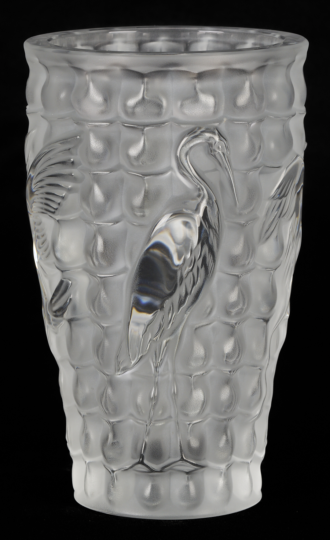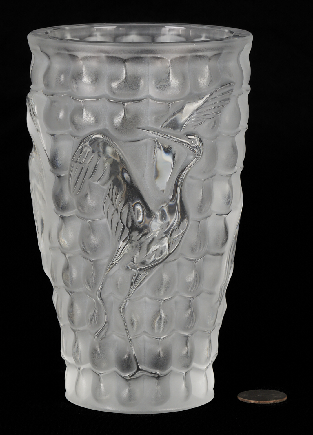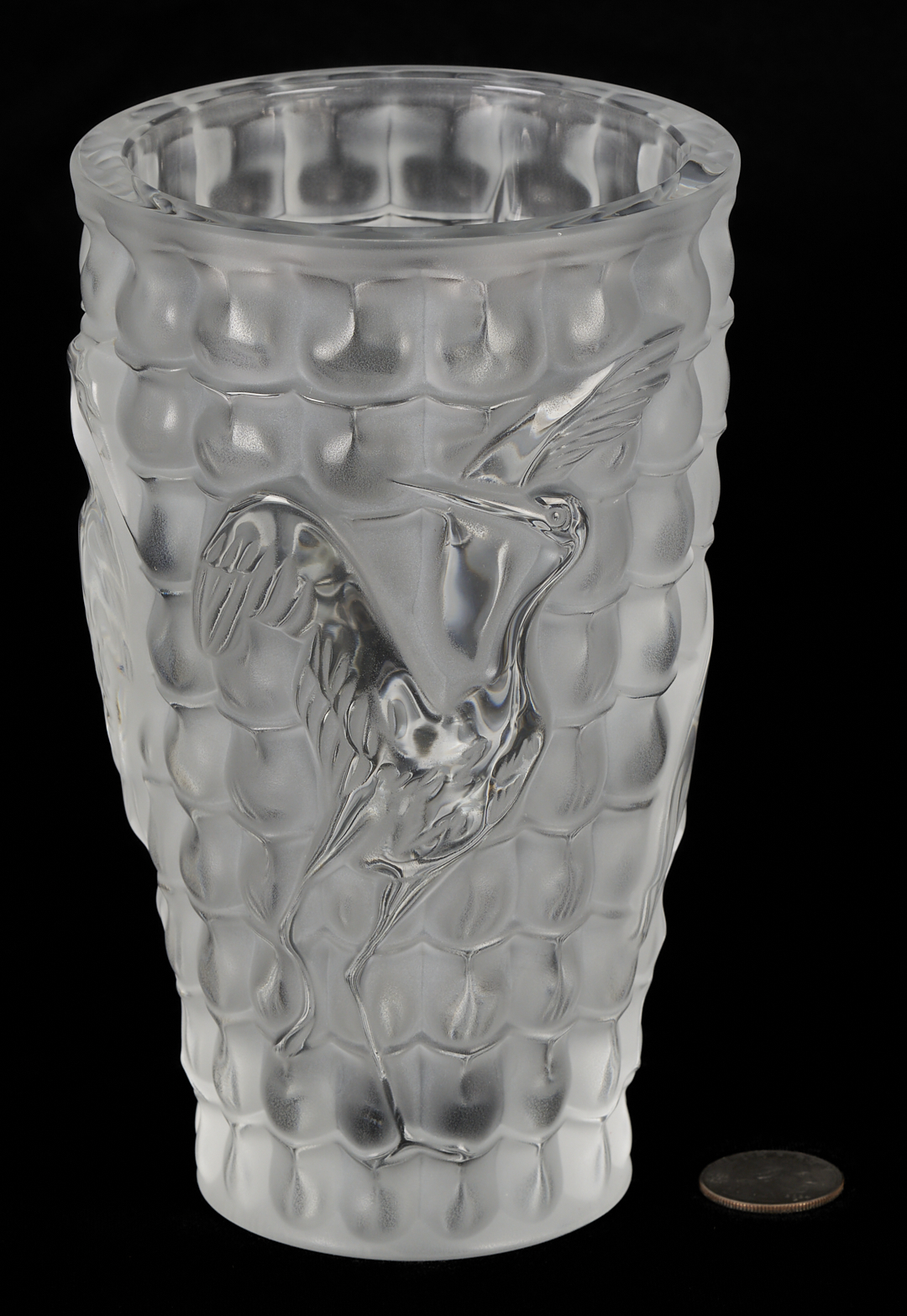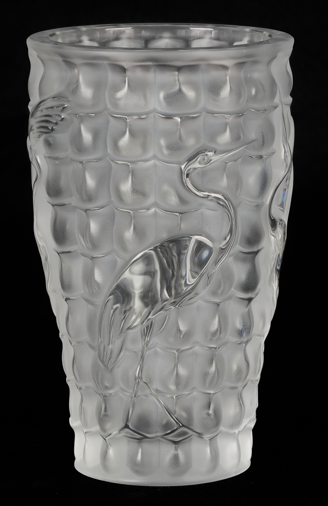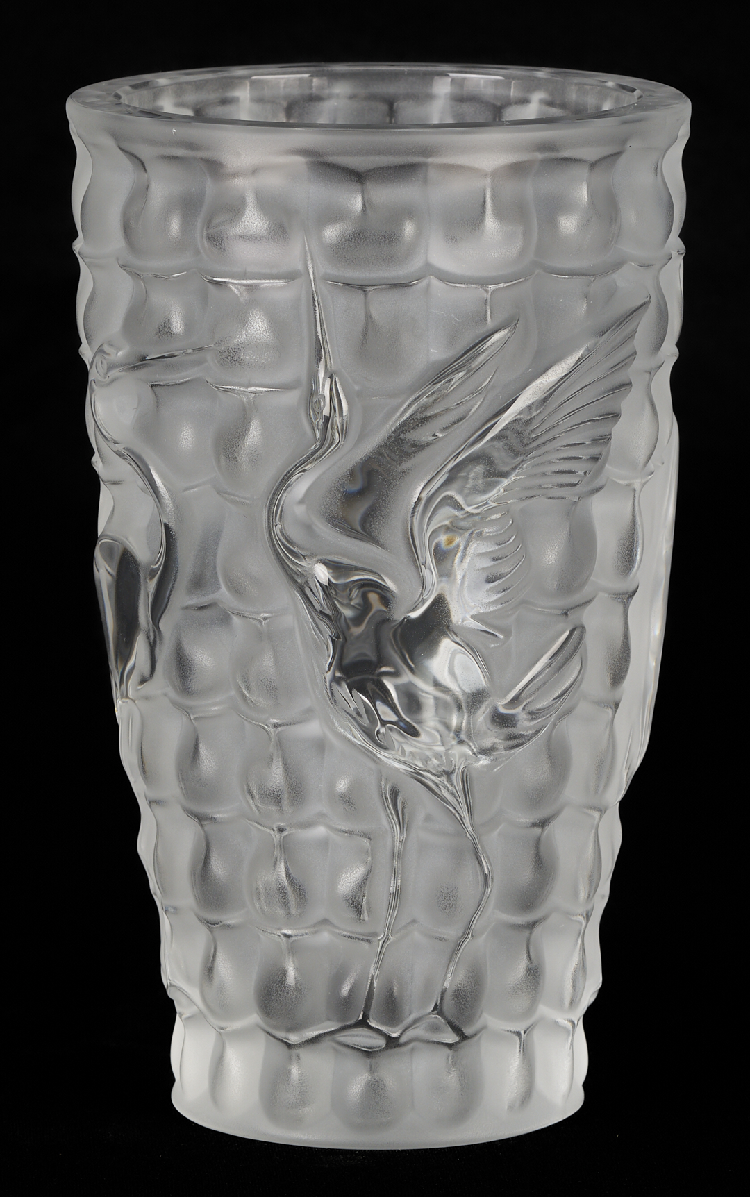 A Lalique crystal “Ibis” vase, featuring four clear glass Ibises against a frosted honeycomb pattern. Signed “Lalique France” to underside. Mid to late 20th C. 7 in. H x 4 1/4 in. D.