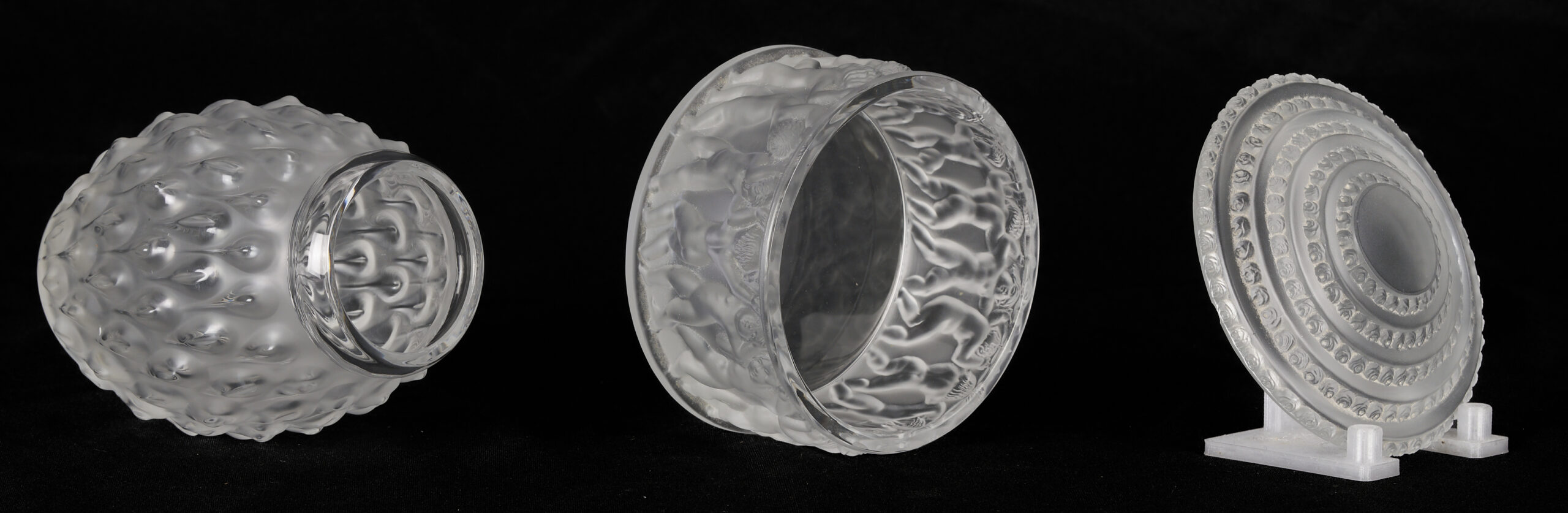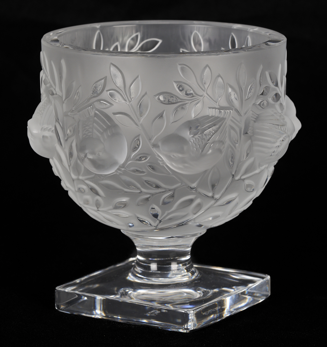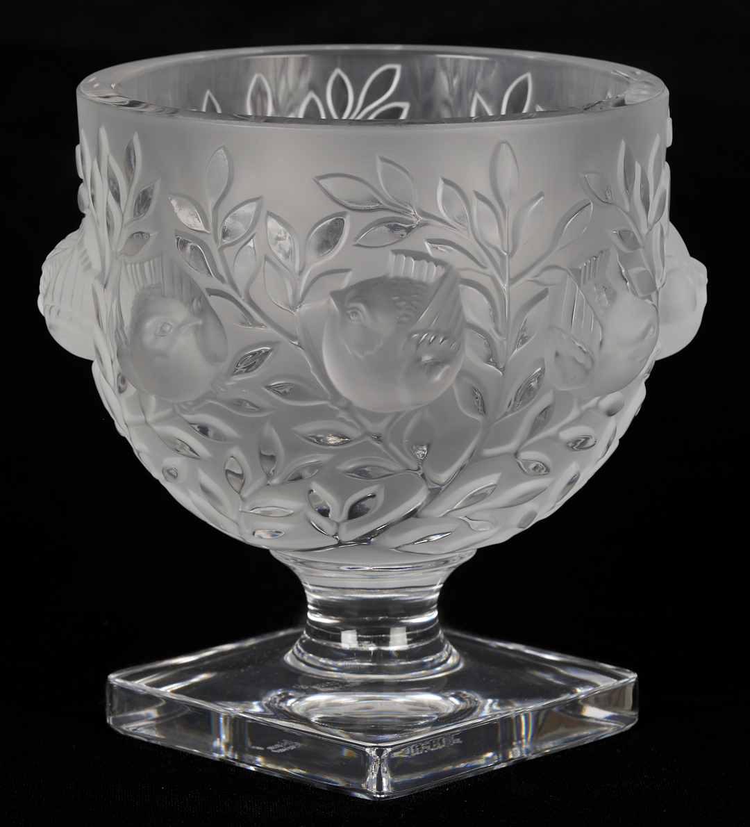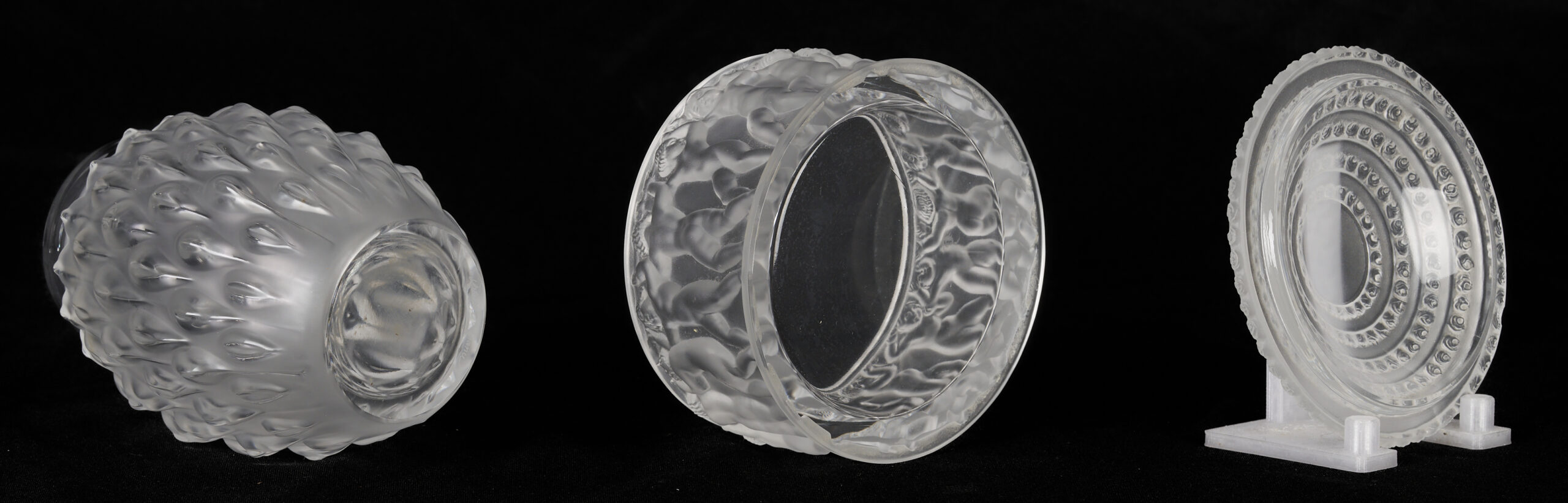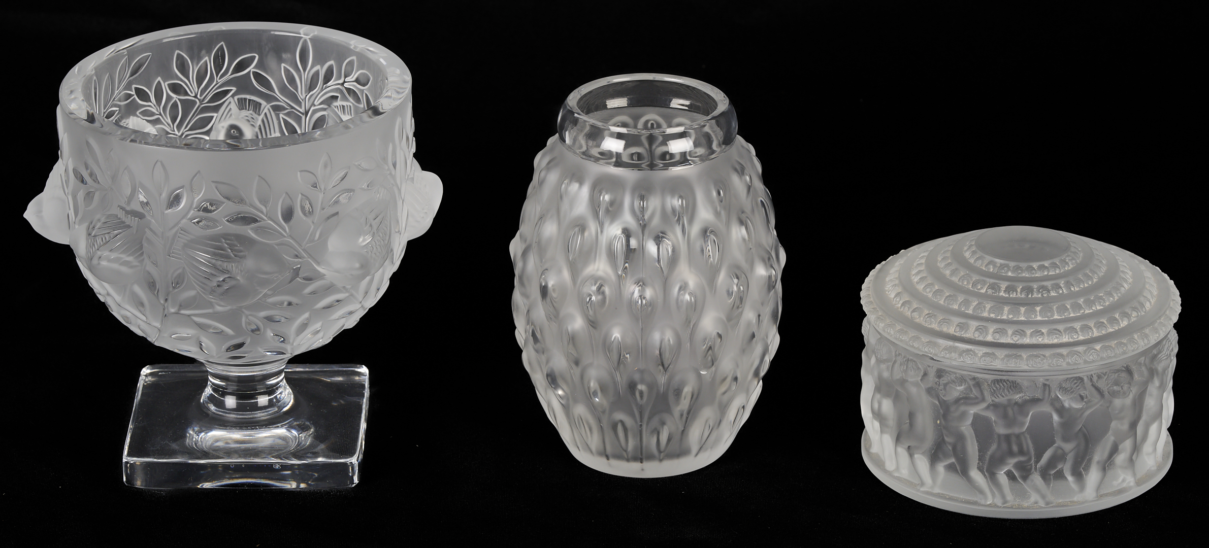 1st Item: Lalique Crystal “Elizabeth” footed vase, with raised birds projecting from a frosted background of tree branches. 5 1/4 in. H x 4 5/8 in. D. 2nd Item: Lalique frosted “Enfants” dresser box with cover, featuring frolicking cherubs in relief around the base. 4 3/8 in. D x 3 in. H. 3rd Item: Lalique crystal “Figuera” vase, clear and frosted with a raised repeating teardrop pattern. 5 1/8 in. H. All items late 20th Century, and marked “Lalique France” to undersides.