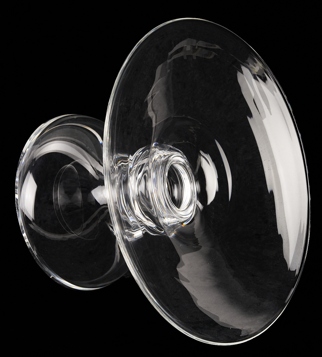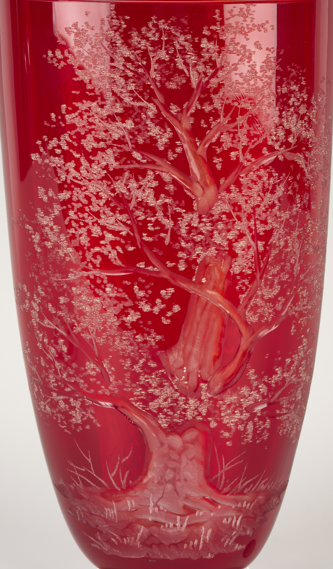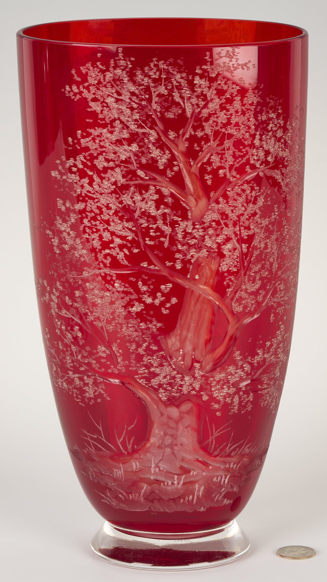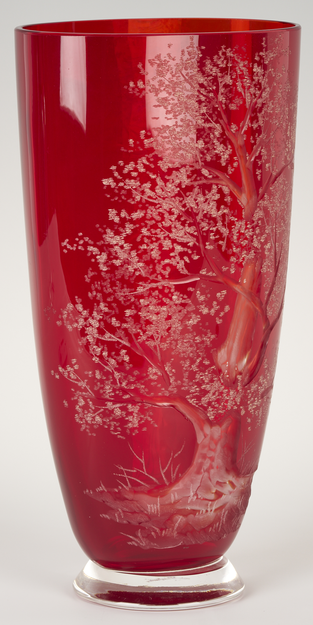 1st item: Large red Art Glass vase with etched tree decoration to one side. indistinct etched signature on the base, G. R____. 12 3/4 in. H x 6 3/4 in. W. 2nd item: Steuben clear glass raised compote, etched signature on the inside of the base. Retains the original box. 6 7/8 in. H x 11 7/8 in. W. Both 20th century.