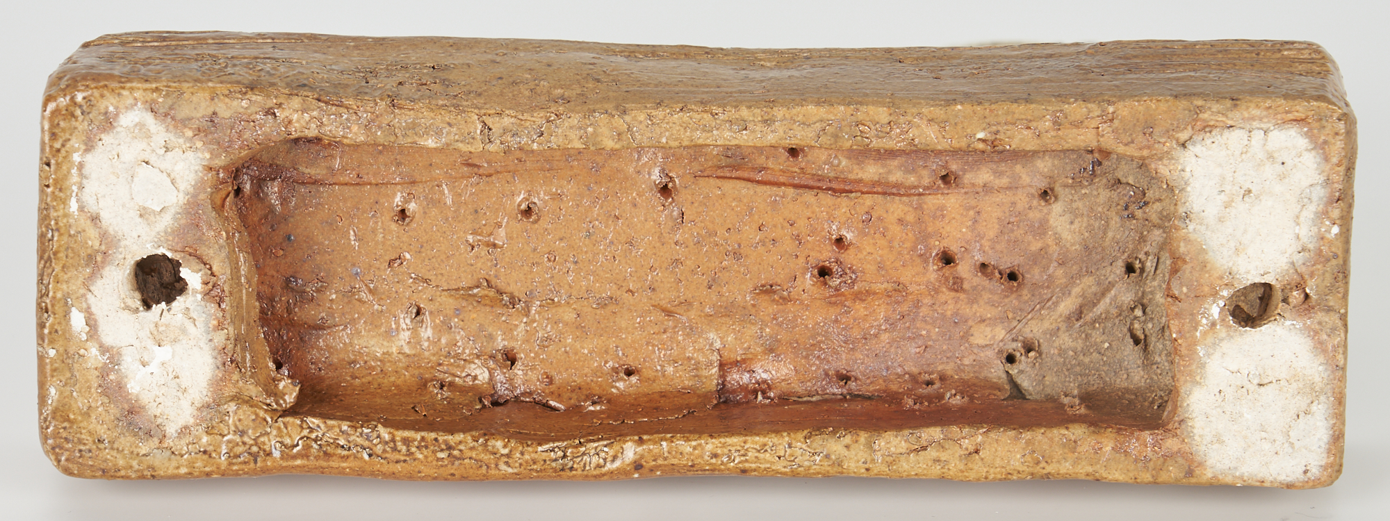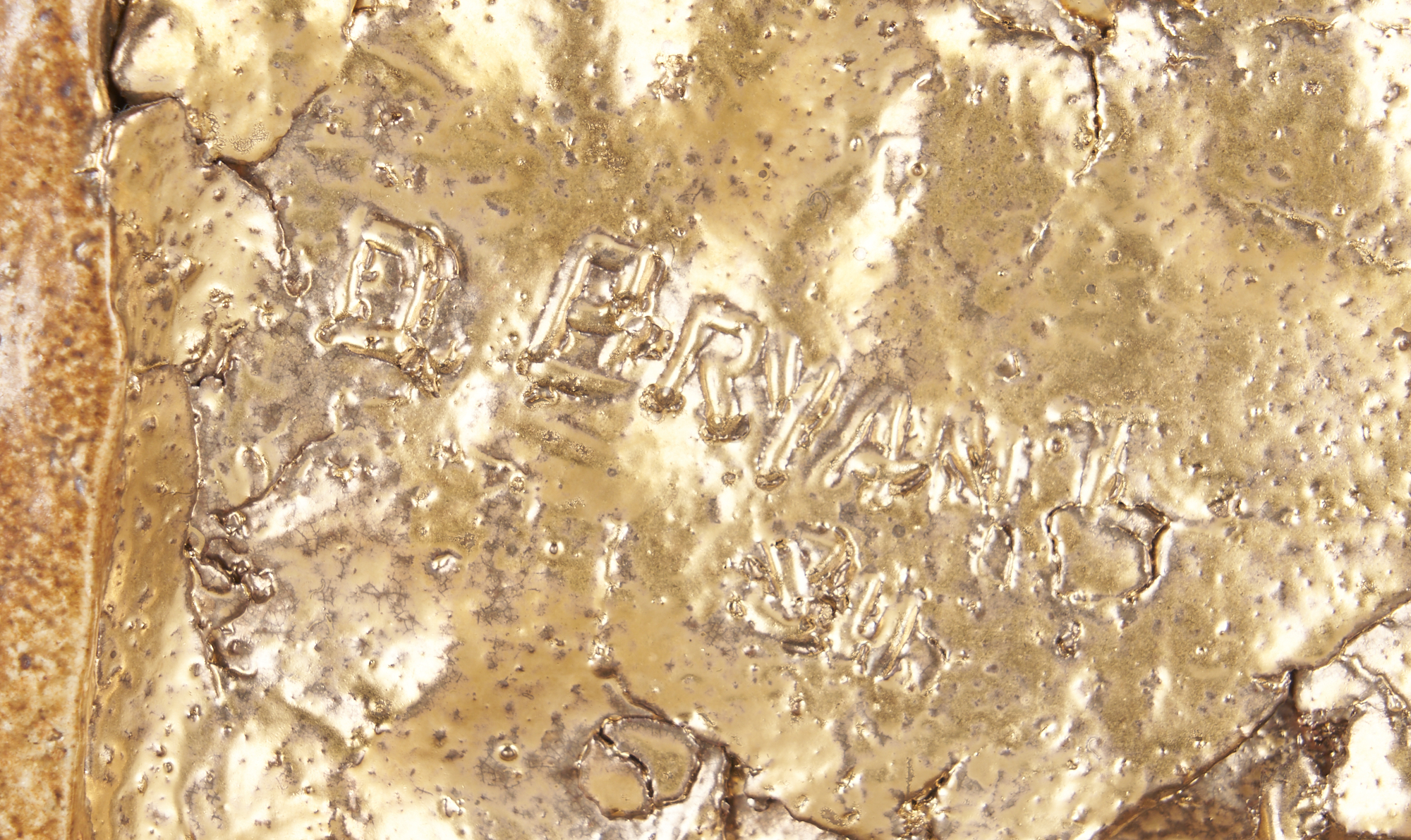 Two (2) Olen Bryant (American/Tennessee, 1927-2017) gilt ceramic face or mask sculptures. 1st item: Gilt ceramic face plaque with raw-edge, mounted to panel board with brass and silver tacks circling the face. Gilding is layered over red paint, with a crackled finish. Unsigned. Housed in a round molded giltwood frame. Plaque: 10 in. H x 11 in. W. Framed: 15 1/2 in. dia. 2nd item: Gilt ceramic mask sculpture, mounted to a brown glazed ceramic rectangular base. Signed en verso with illegible date, likely “80,” and additionally signed and dated (also likely “80”) to back of base. 5 1/2 in. H x 6 1/2 in. W x 2 in. D. Biography: Born in Cookeville, TN, Bryant was a 1950 graduate of Murray State University and a 1954 graduate of the Cranbrook Academy of Art in Bloomfield, Michigan with a Master’s Degree in Fine Arts. He additionally studied at the Cleveland Institute of Art, the Institute in the Visual Arts in American Culture at the University of Delaware and the Winterthur Museum in 1967. Bryant was a professor at Austin Peay State University from 1964 to 1991. Bryant’s artwork is widely collected around the United States and is a part of several museum collections, including the Hunter Museum of American Art in Chattanooga, the Tennessee State Museum of Art and the Cheekwood Museum of Art in Nashville. His works have been displayed at the Tennessee Performing Arts Center and at the Governor’s Mansion during the Phil Bredesen administration. He was a founding member of the Nashville Artist Guild and the Tennessee Association of Craft Artists (Source: Nashville Fine Arts Magazine & The Leaf Chronicle).