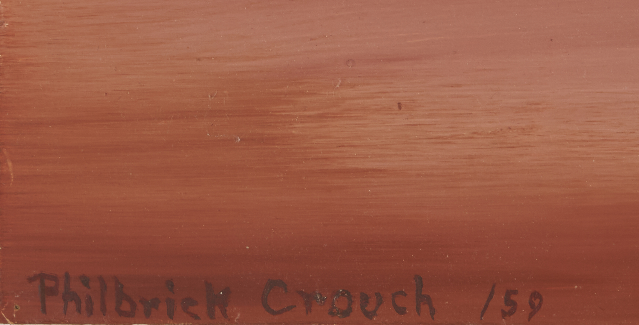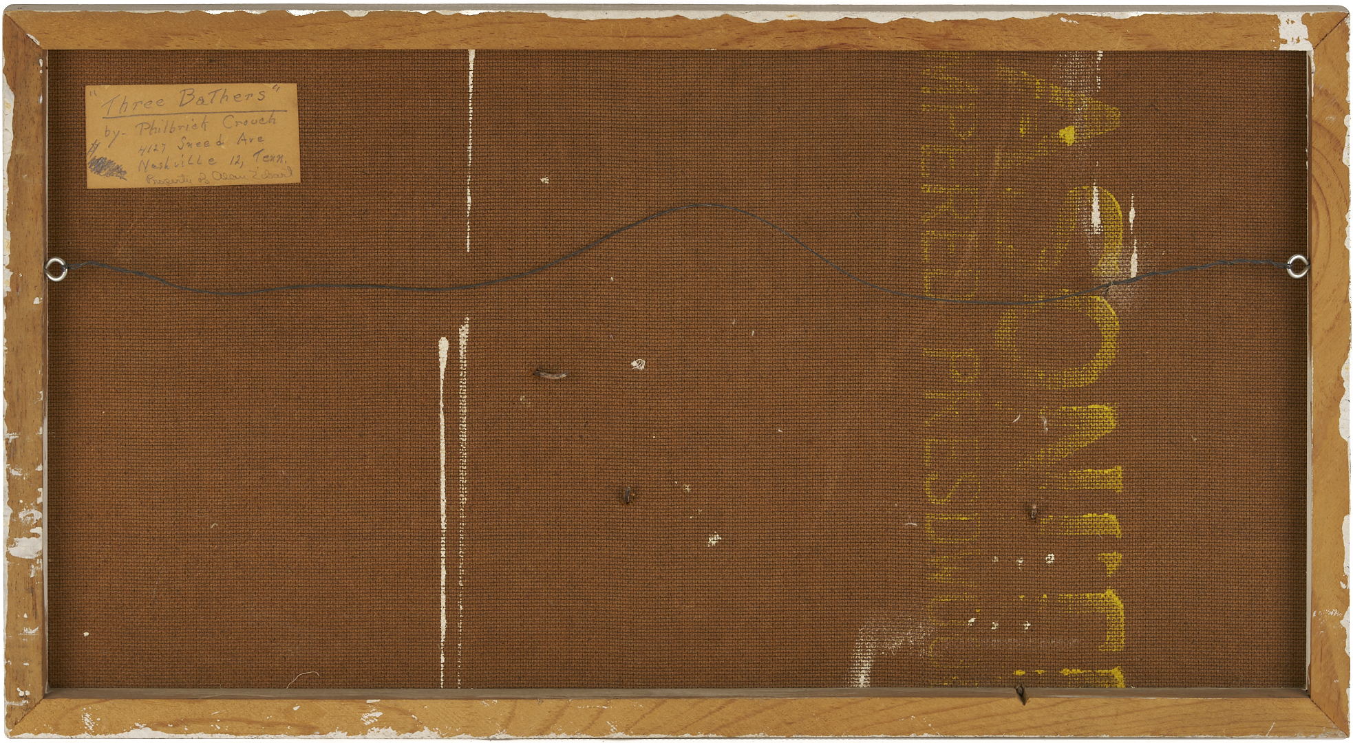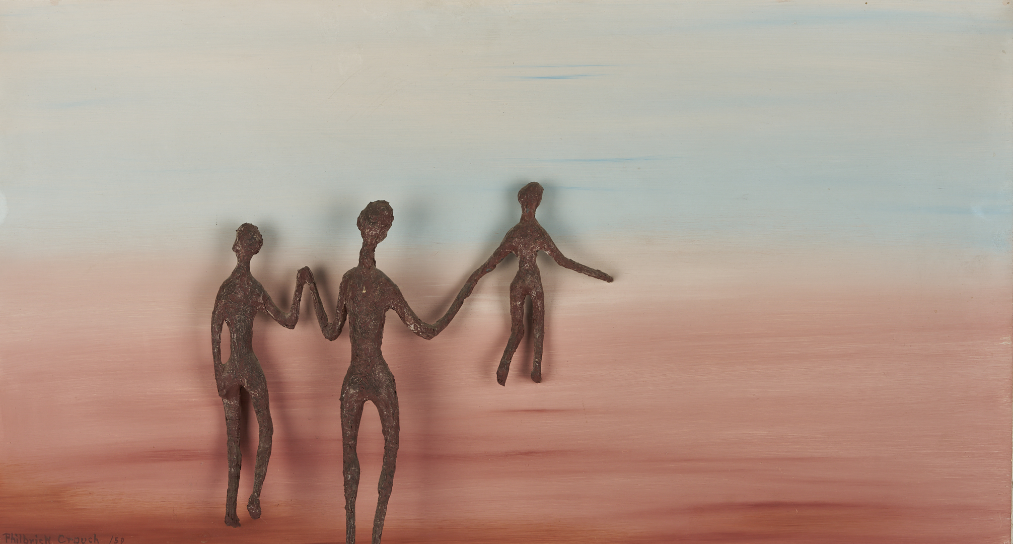 Philbrick McLeod Crouch (American/Tennessee, 1911-1999) mixed media modernist three dimensional work, featuring three bronze figures mounted to a horizontal board painted in shades of blue and rose, as if walking into an indistinct landscape. Narrow whitewashed frame. Sight: 25 3/4 in. W x 14 in. H x 2 in. D. Overall: 26 1/4 in W x 14 1/2 in. H x 2 1/2 in. D. Circa 1970.