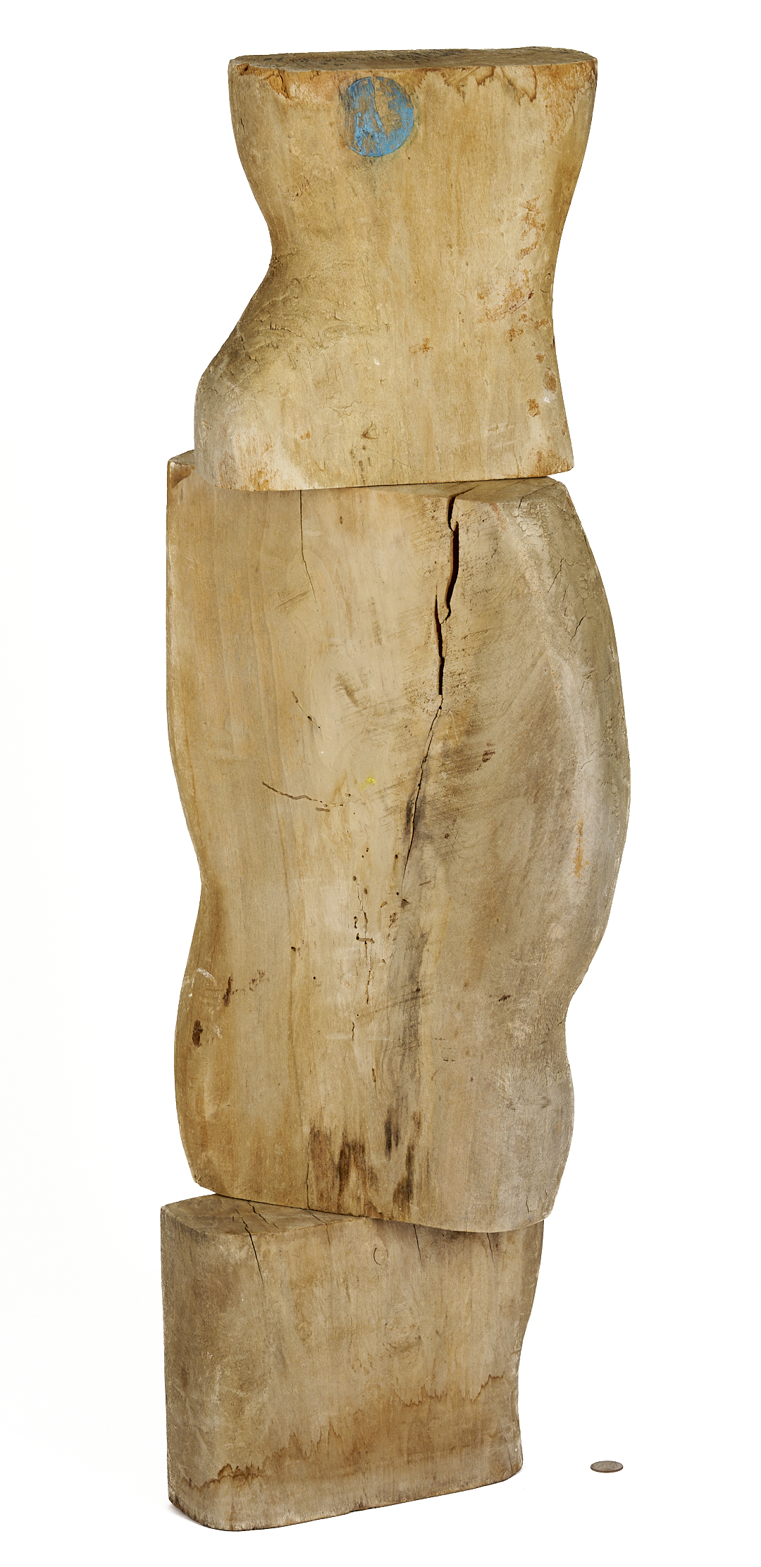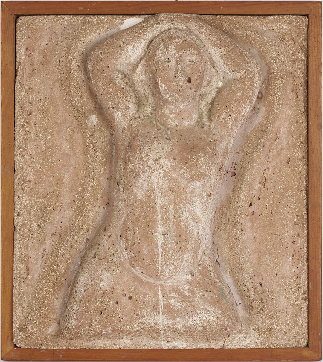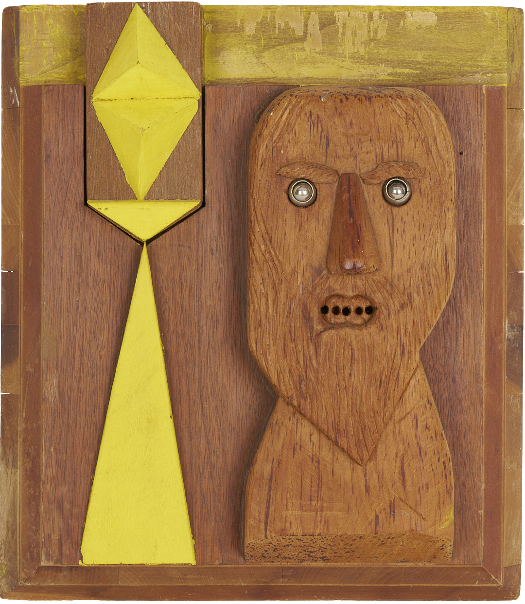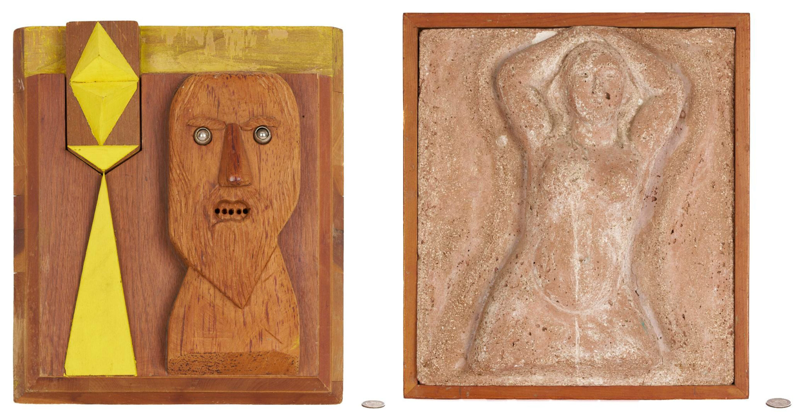 Three (3) Meyer R. Wolfe (Tennessee/New York, 1897–1985) sculptures.1st item: Carved wood plaque depicting a bearded male with silver metal eyes next to a polychrome yellow painted abstract totem. Yellow polychrome wash to top margin. Unsigned. 15 1/4 in. H x 13 1/4 in. W. 2nd item: Colored sculpted sand plaque depicting the torso of a woman with her hands behind head. Inset into a wood frame and fitted with hanging hardware en verso. Unsigned. Plaque: 13 1/4 in. H x 11 3/4 in. W. Framed: 14 1/2 in. H x 13 in. W. 3rd item: Abstract wood sculpture composed of three carved blocks of unfinished wood joined by a center iron rod. The segments rotatable to create varying forms. Unsigned. 41 3/4 in. H x 13 in. W x 5 in. D.