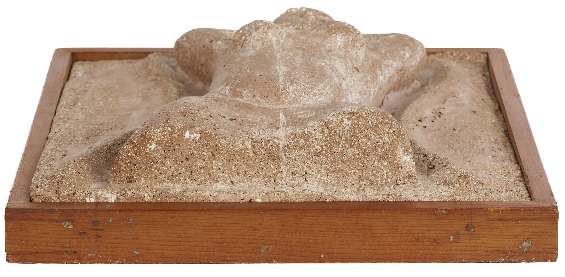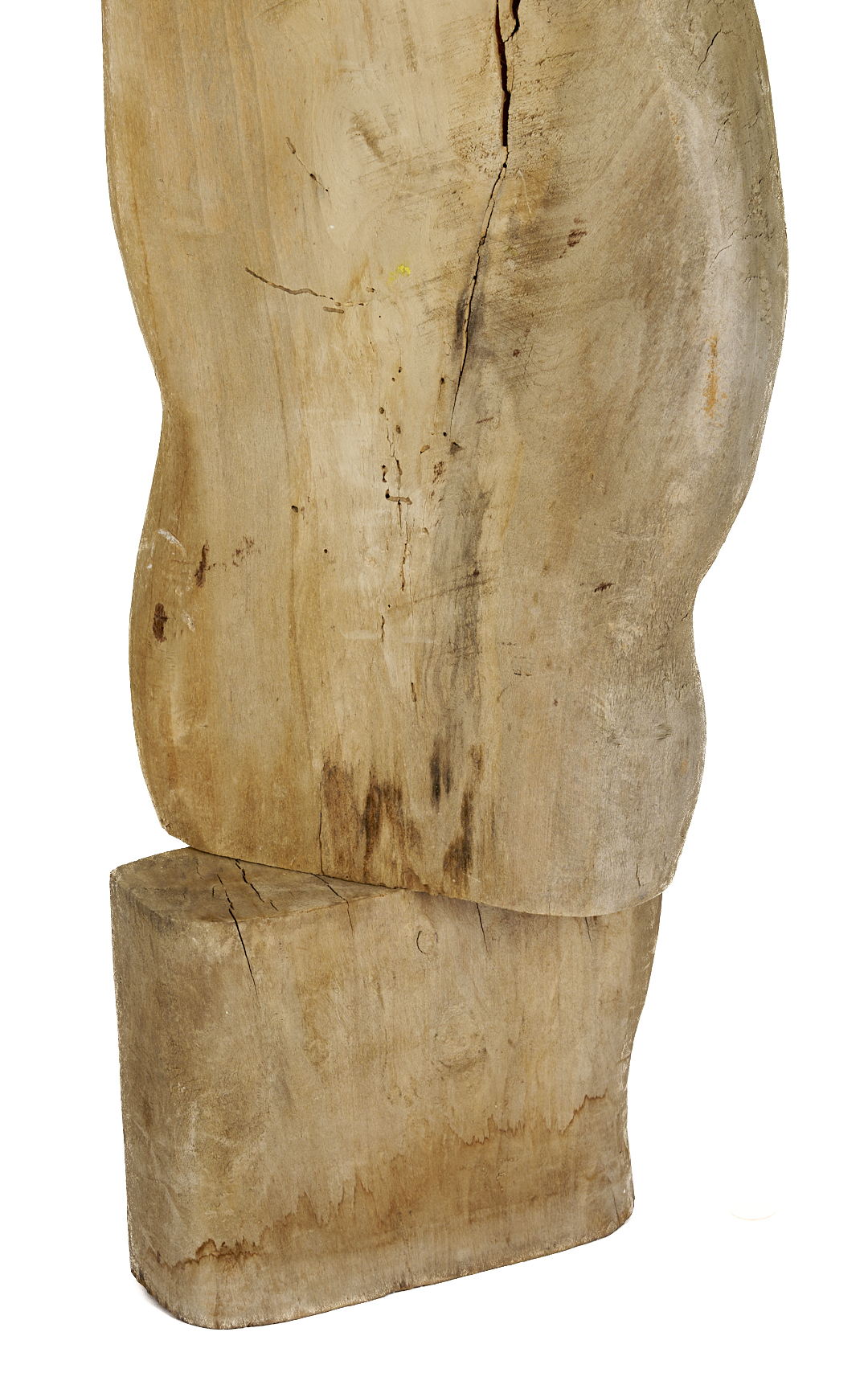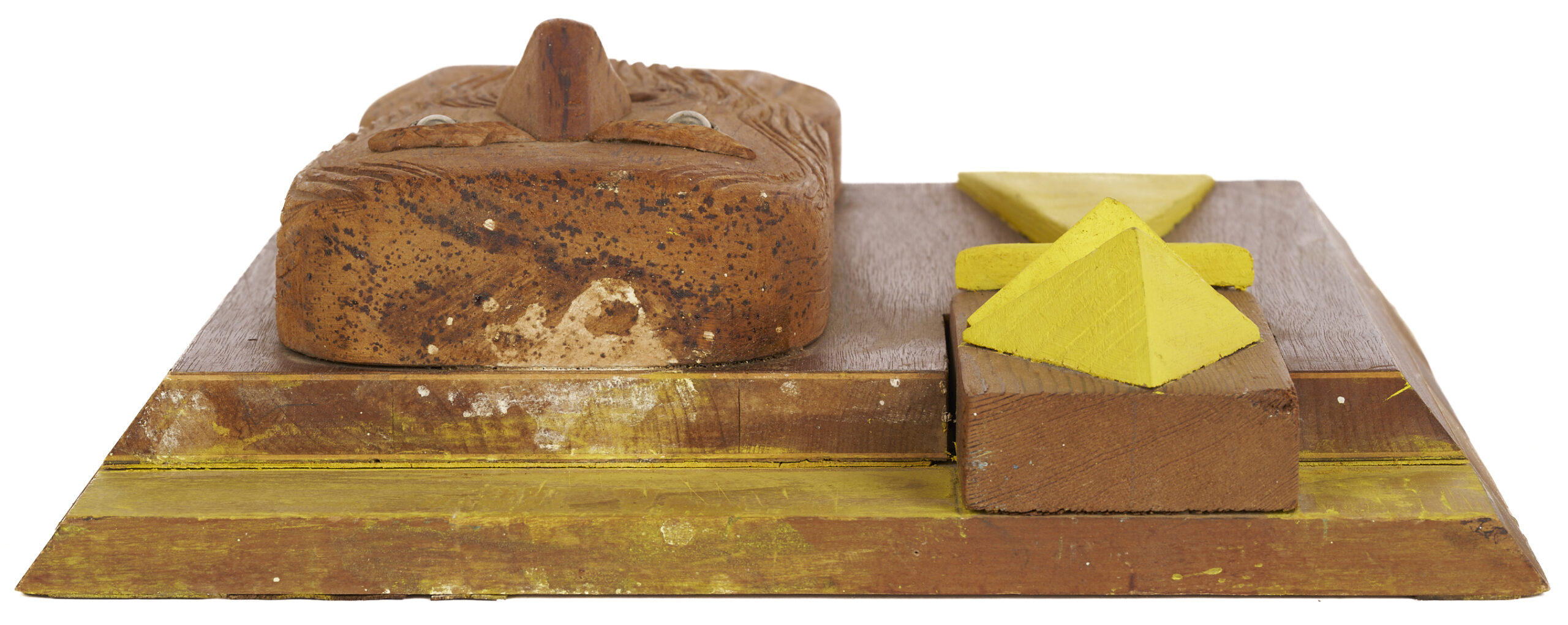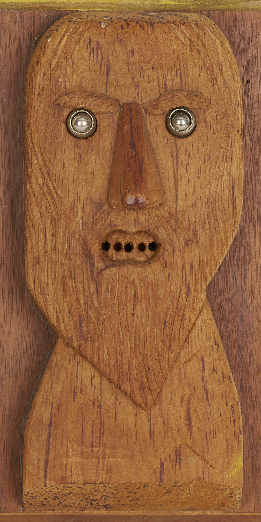Three (3) Meyer R. Wolfe (Tennessee/New York, 1897–1985) sculptures.1st item: Carved wood plaque depicting a bearded male with silver metal eyes next to a polychrome yellow painted abstract totem. Yellow polychrome wash to top margin. Unsigned. 15 1/4 in. H x 13 1/4 in. W. 2nd item: Colored sculpted sand plaque depicting the torso of a woman with her hands behind head. Inset into a wood frame and fitted with hanging hardware en verso. Unsigned. Plaque: 13 1/4 in. H x 11 3/4 in. W. Framed: 14 1/2 in. H x 13 in. W. 3rd item: Abstract wood sculpture composed of three carved blocks of unfinished wood joined by a center iron rod. The segments rotatable to create varying forms. Unsigned. 41 3/4 in. H x 13 in. W x 5 in. D.
