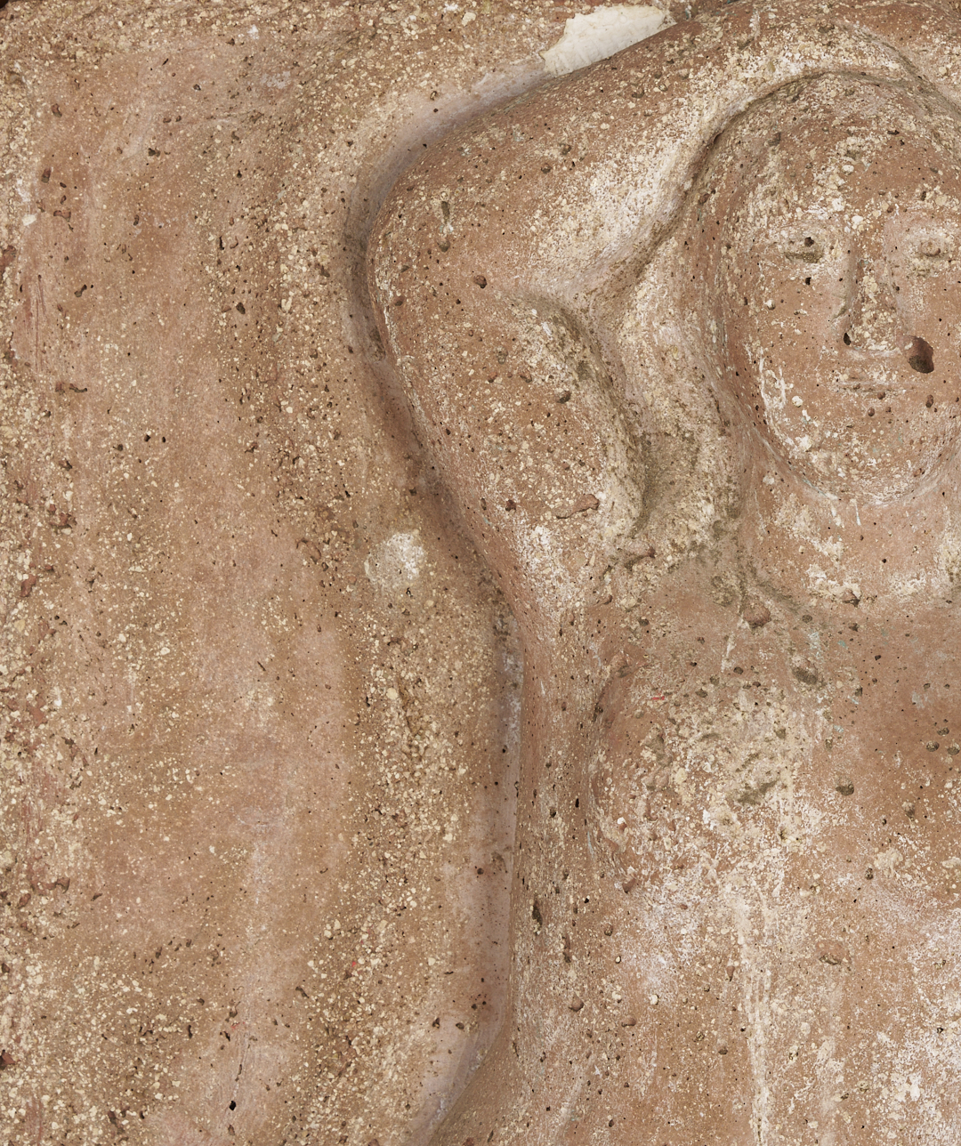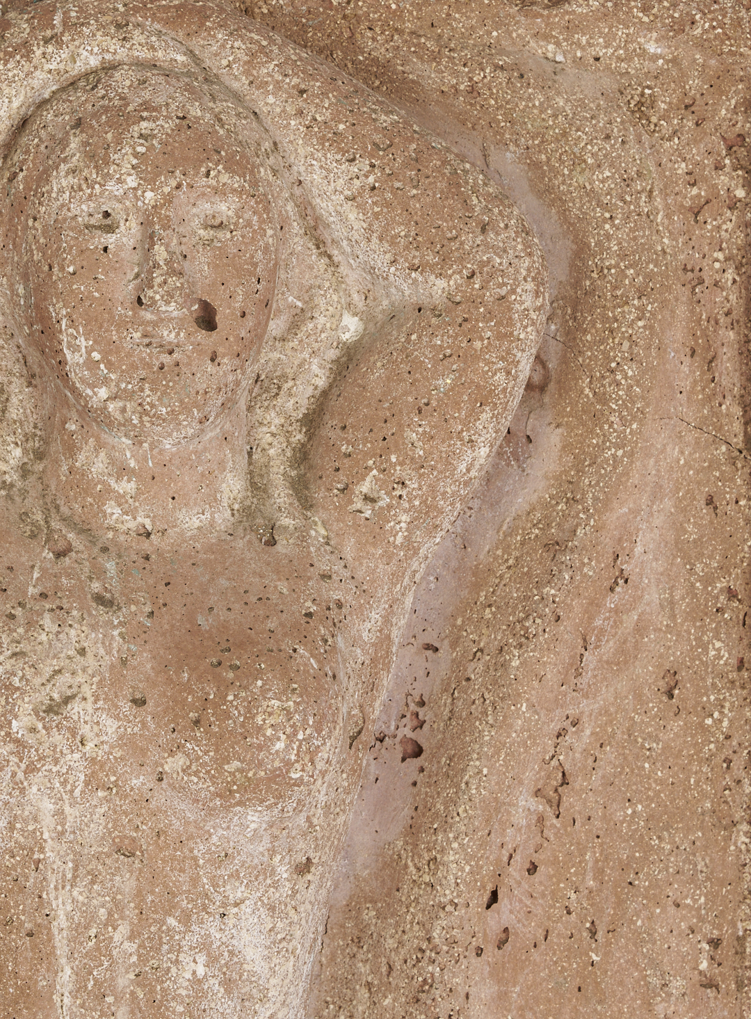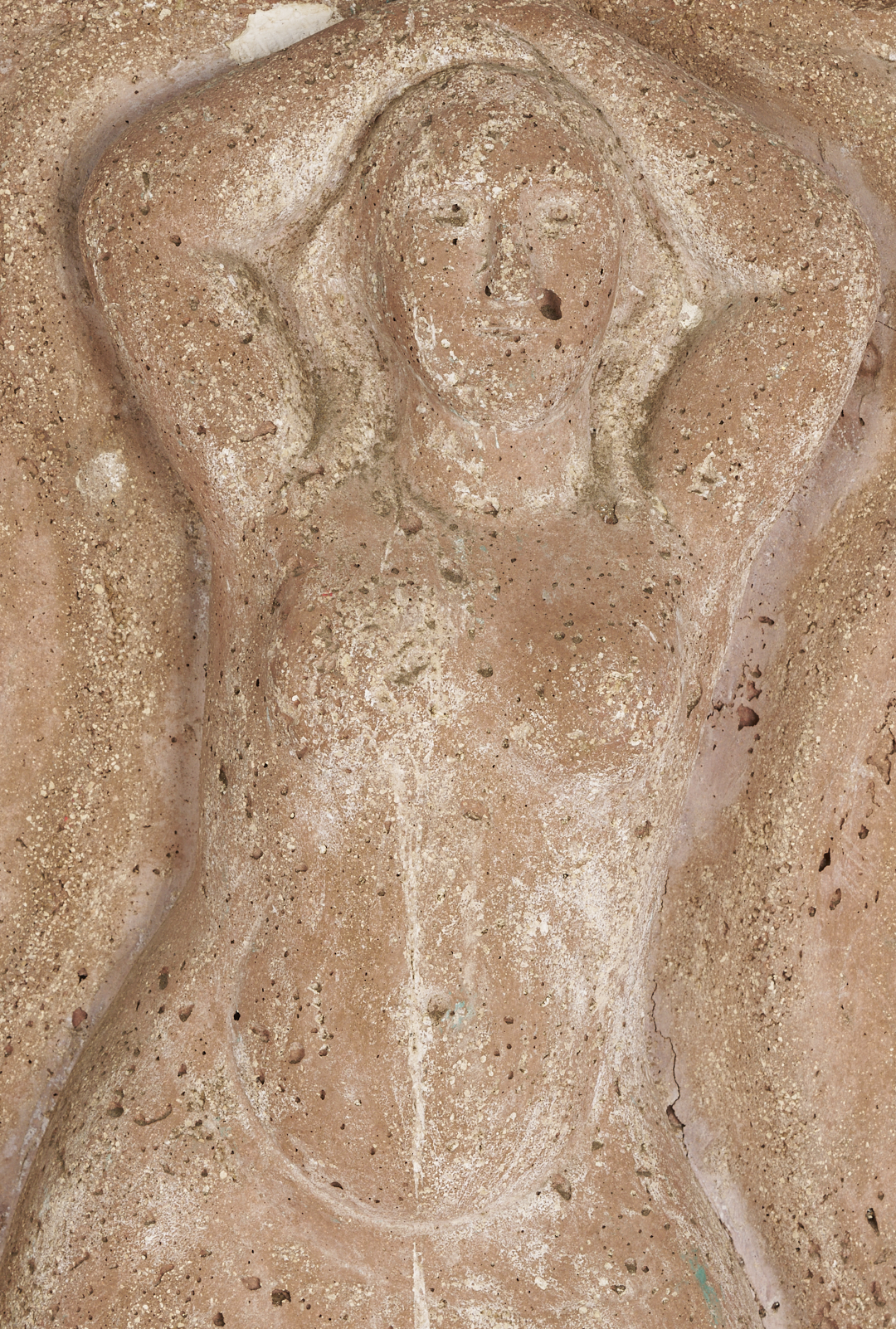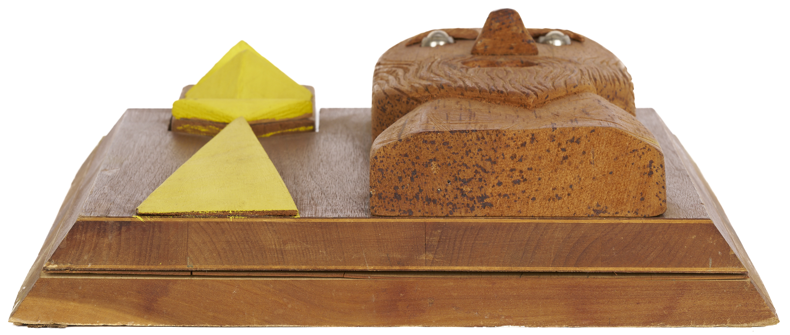 Three (3) Meyer R. Wolfe (Tennessee/New York, 1897–1985) sculptures.1st item: Carved wood plaque depicting a bearded male with silver metal eyes next to a polychrome yellow painted abstract totem. Yellow polychrome wash to top margin. Unsigned. 15 1/4 in. H x 13 1/4 in. W. 2nd item: Colored sculpted sand plaque depicting the torso of a woman with her hands behind head. Inset into a wood frame and fitted with hanging hardware en verso. Unsigned. Plaque: 13 1/4 in. H x 11 3/4 in. W. Framed: 14 1/2 in. H x 13 in. W. 3rd item: Abstract wood sculpture composed of three carved blocks of unfinished wood joined by a center iron rod. The segments rotatable to create varying forms. Unsigned. 41 3/4 in. H x 13 in. W x 5 in. D.