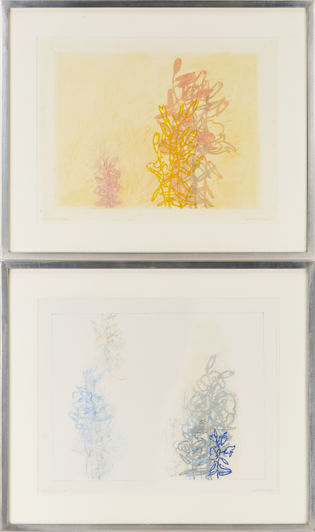 Two (2) Rocio Rodriguez (Cuba/Georgia, b. 1952) pastel and oil pastel drawings on paper with botanical or vegetal forms. Item 1: Drawing in yellow and pink, 2003. Signed and dated in pencil, lower left, and inscribed “May 6, 03 No. 1,” lower right. Item 2: Drawing in blue, grey, and white, 2003. Signed and dated in pencil, lower left, and inscribed “April 24, 03 No. 1,” lower right. Both floated under plexiglass in silvered wooden frames with white mats. Both sheets: 18 in H x 23 1/4 in W. Both frames: 25 3/4 in H x 31 1/4 in W.