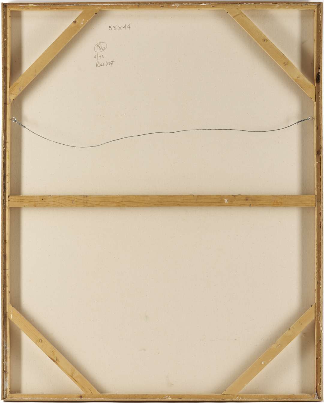 Russell Vogt (American, 20th century), large oil on canvas painting titled “The Morning Shade” depicting a vibrantly hued landscape. Signed and dated 4/93 en verso and housed in a simple wood frame. Sight: 55 in. H x 44 in. W. Framed: 55 1/2 in. H x 44 3/4 in. W.