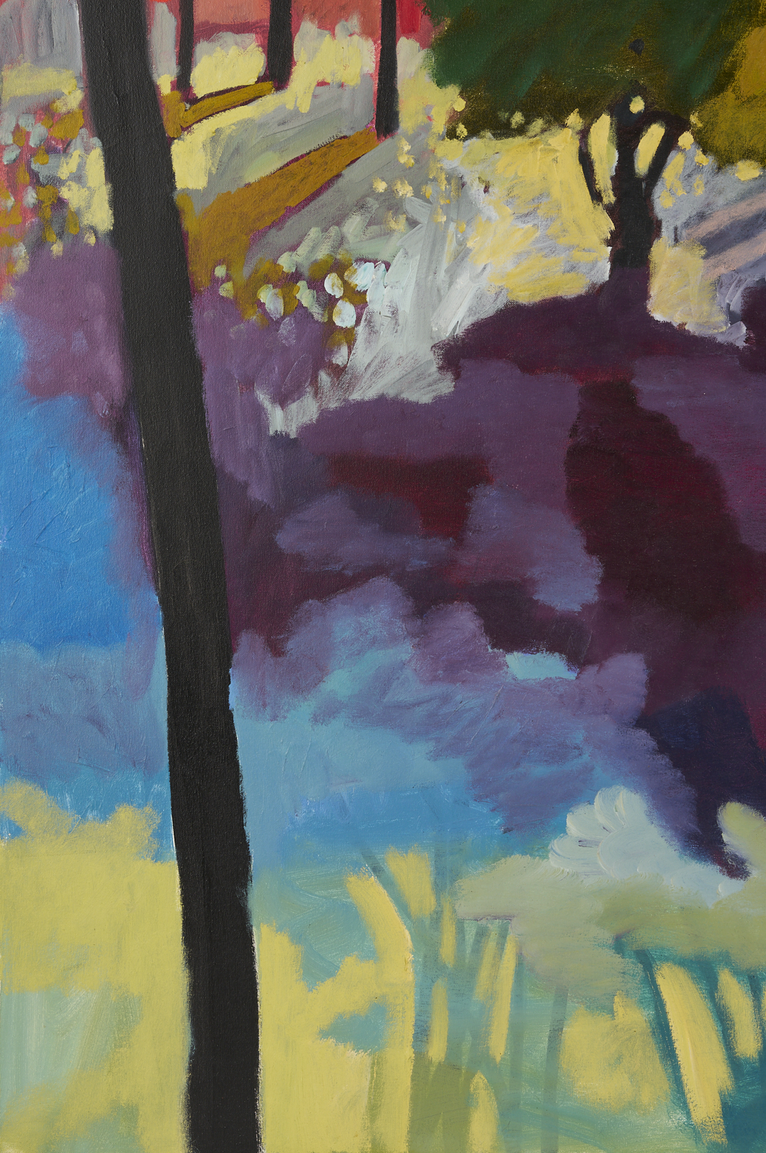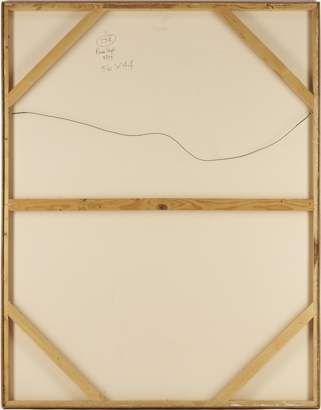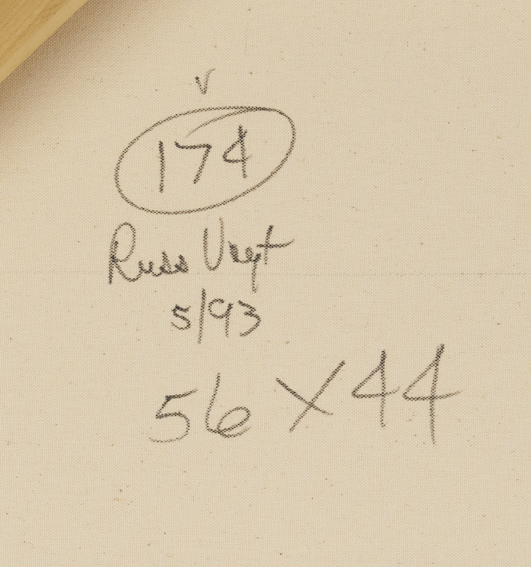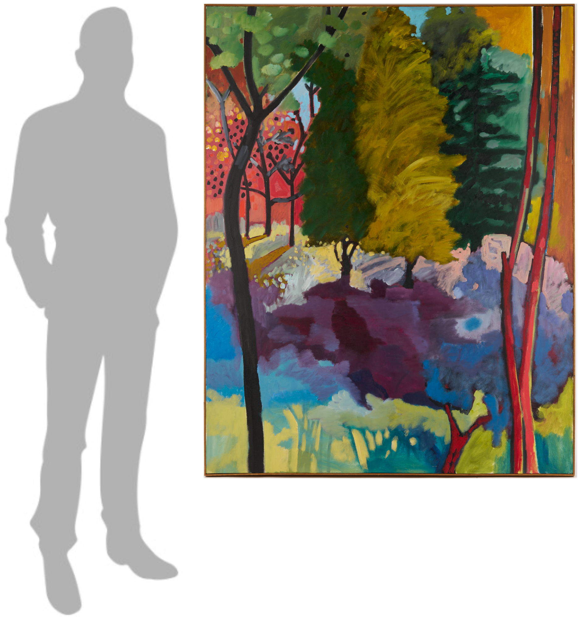 Russell Vogt (American, 20th century), large oil on canvas titled “Cool and Warm and Breezy” depicting a vibrantly hued, lush wooded landscape. Signed and dated 5/93 en verso and housed in a simple wood frame. Sight: 56 in. H x 44 in. W. Framed: 56 1/2 in. H x 44 3/8 in. W.