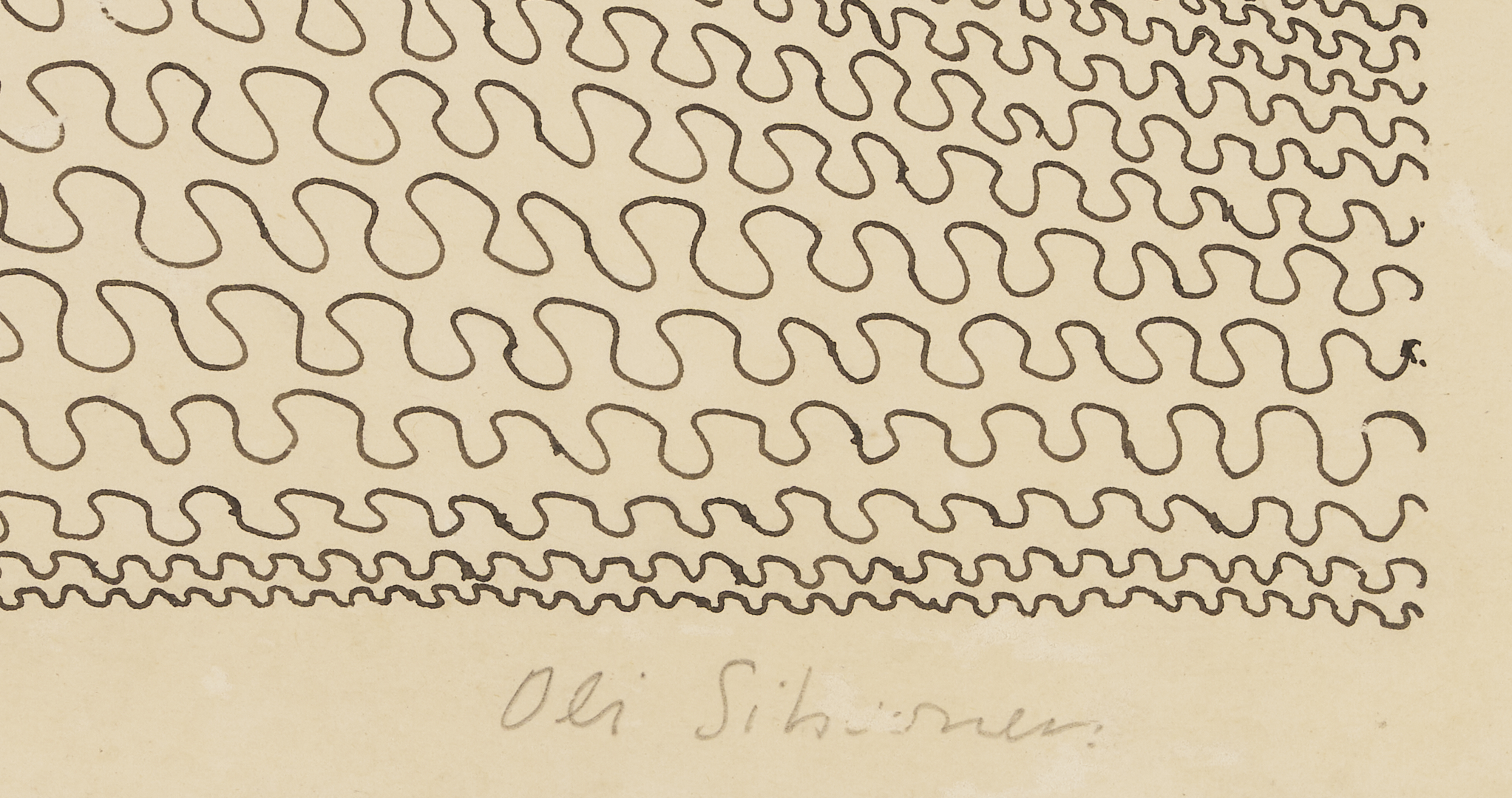 Oli T. Sihvonen (New York/New Mexico, 1921-1991) ink on heavy wove paper abstract composition with an intricate arrangement of serpentine lines. Signed in pencil, lower right. Unframed. Housed in a plastic sleeve. Sheet: 20 1/2 in. H x 24 5/8 in. W. Sleeve: 22 3/4 in. H x 28 7/8 in. W. Biographical Note: Known for his geometric abstractions and influential work as a “Taos Modern,” Oli Sihvonen studied with Josef Albers at North Carolina’s Black Mountain College before moving to Taos in the early 1950s. His work is often associated with Abstract Expressionism, Minimalism, Hard-Edge Painting, and Op-Art. He died in New York City in 1991