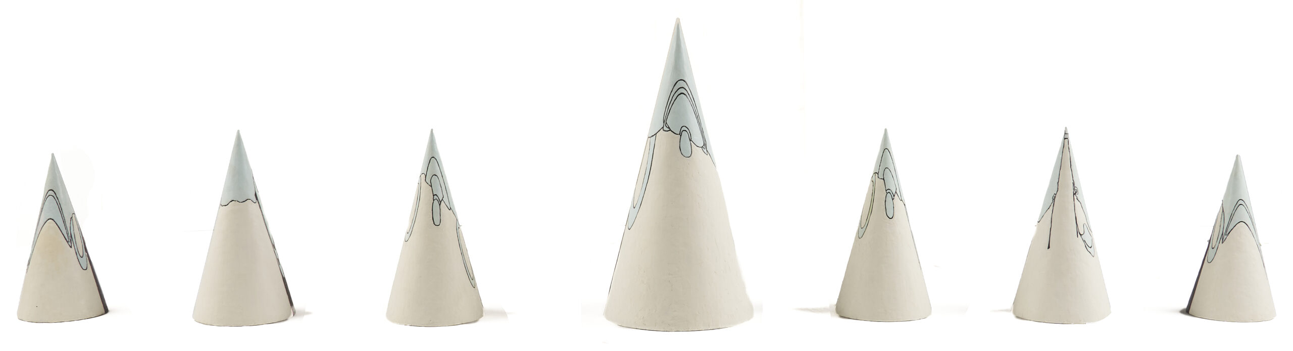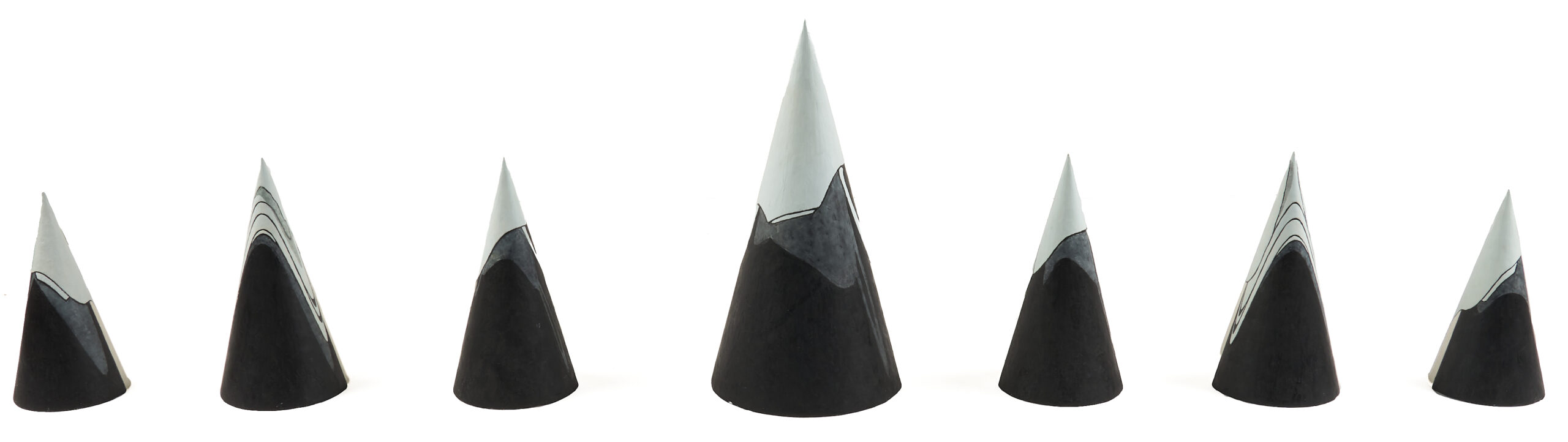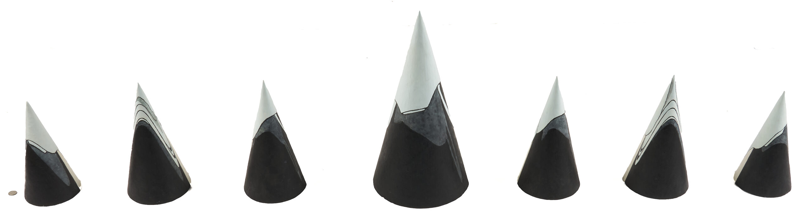 Roxanne Blanchard (American, 20th c.), abstract sculpture, “Coffee Cantata,” 1987. An installation that consists of seven fiberglass, aluminum, canvas, and wood cones with blue, white, and black abstract encaustic designs. Each is signed, numbered 1-7, and dated to the bases. Each with P.P.O.W., New York gallery label, plus hanging hardware affixed to bases. Cones range between 12 1/4 in.-22 1/4 in. H x 6 1/4 in.-11 1/4 in. Dia. Arranged in an 111 inch long row. Note: Lot includes two P.P.O.W. black and white silver gelatin photographs of the sculpture by Adam Reich with gallery labels plus Reich’s stamp and negative number to versos, as well as one P.P.O.W. slide with a photograph of the sculpture.