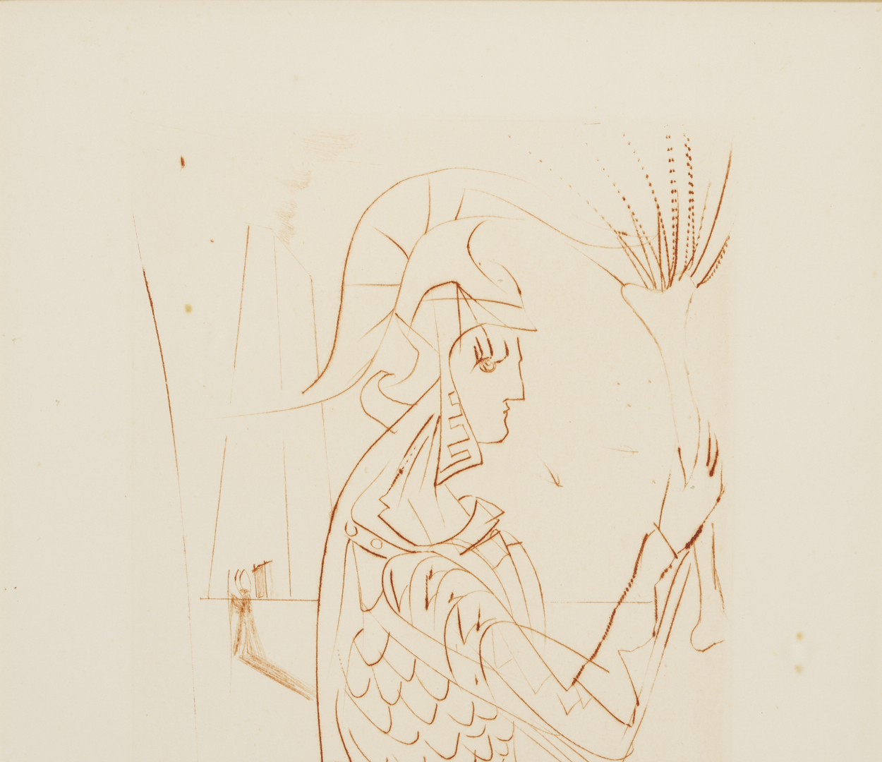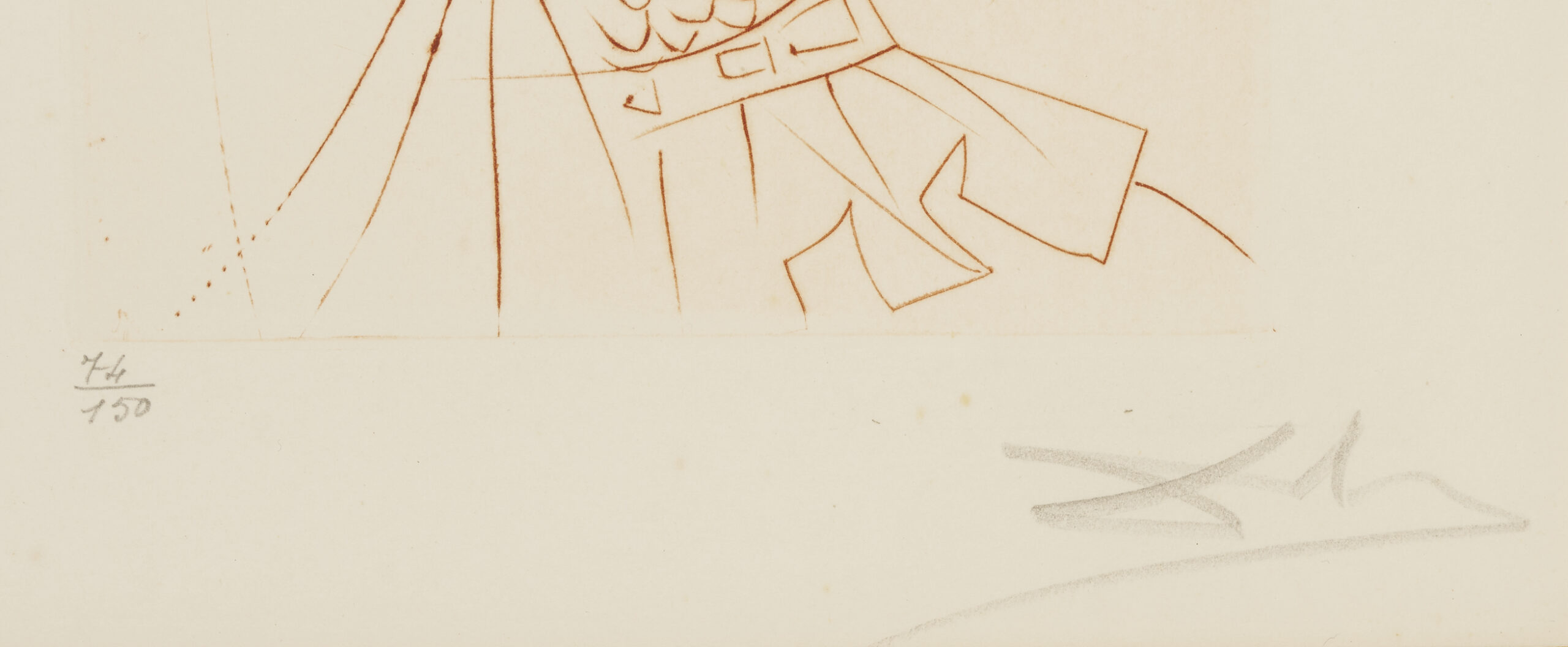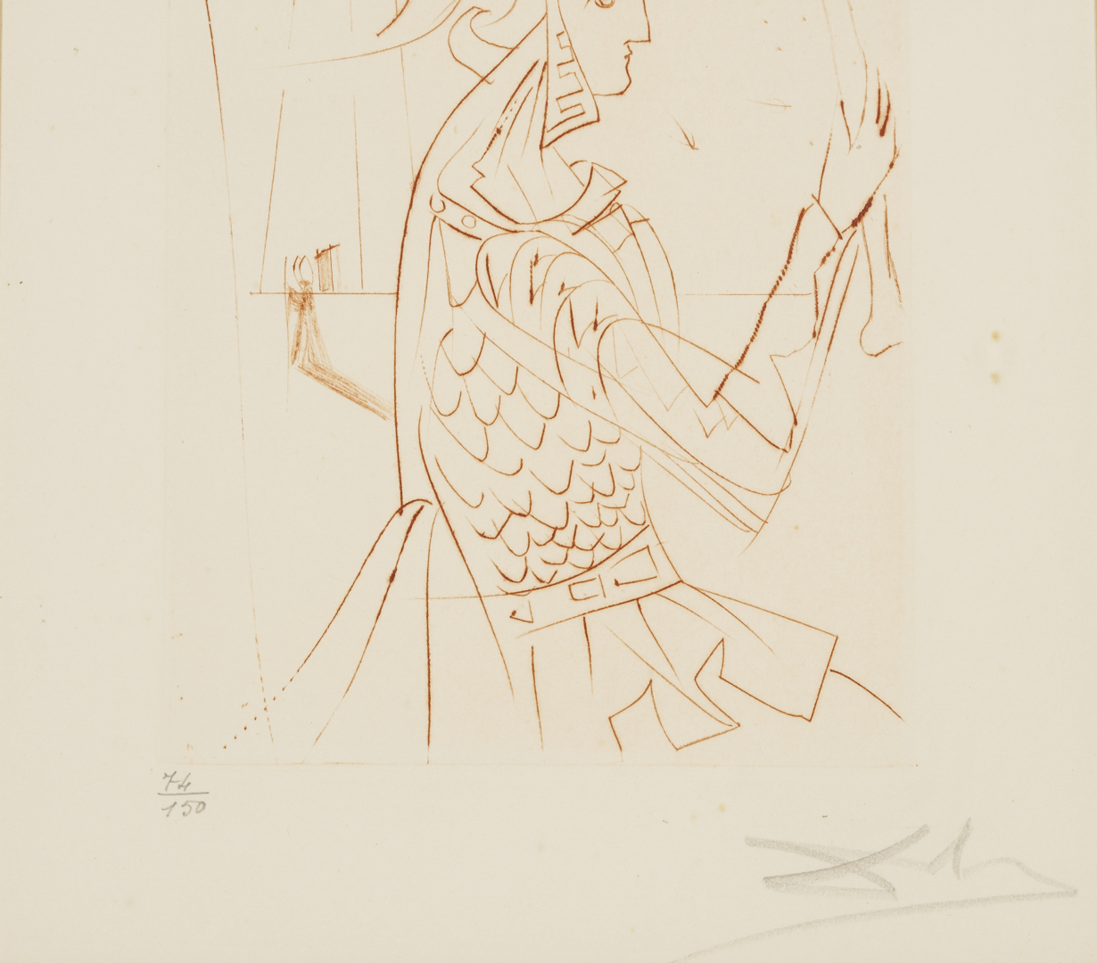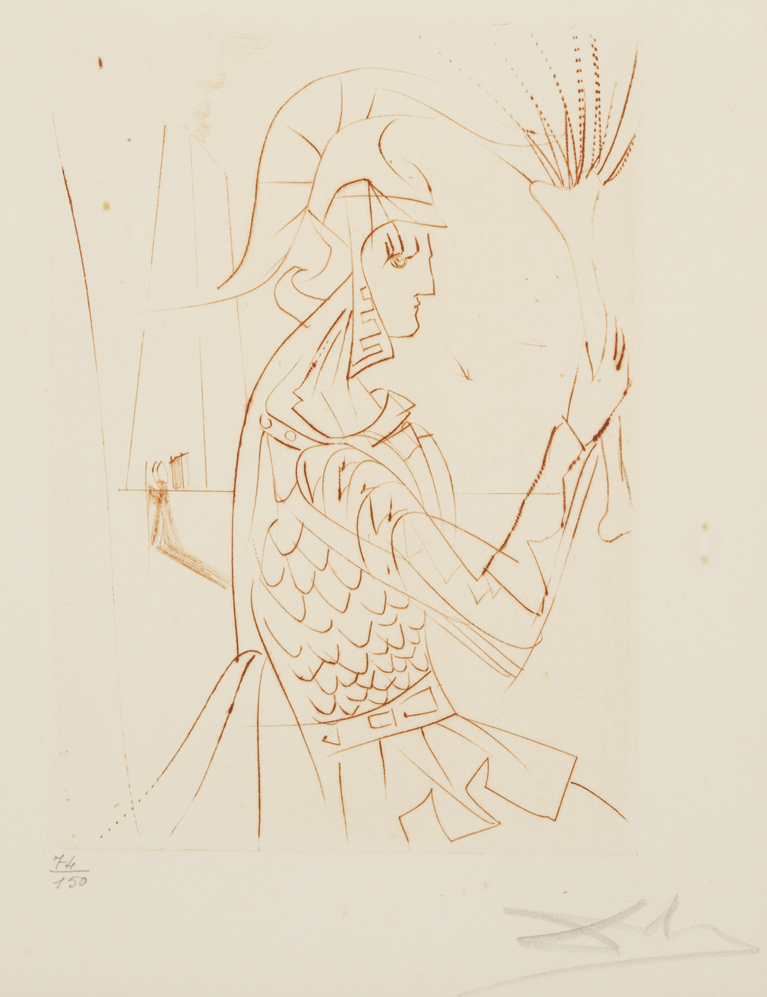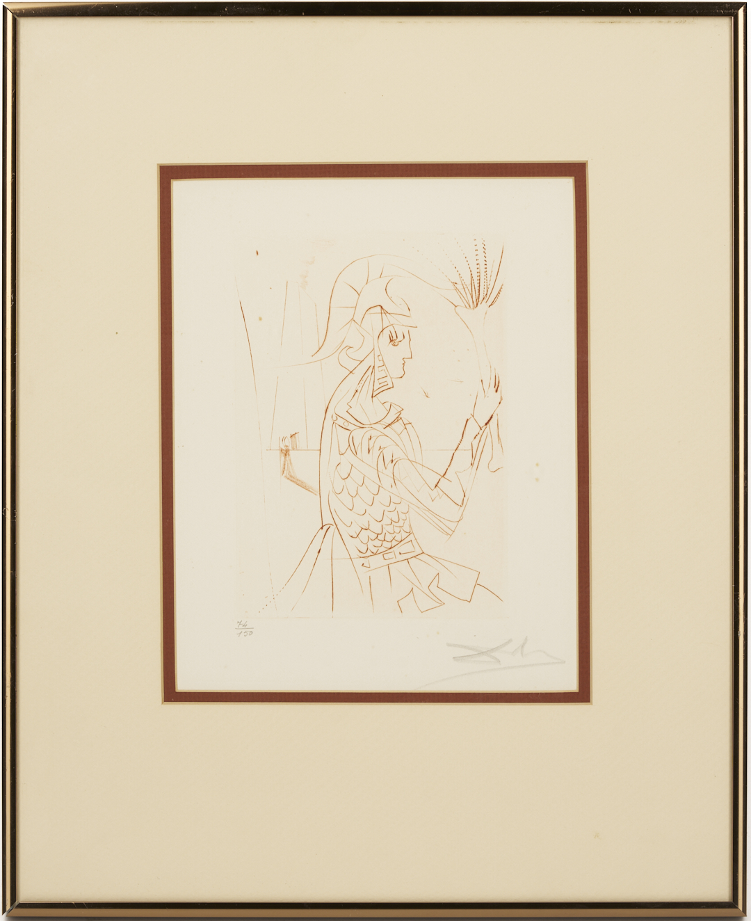 Salvador Dali (Spanish, 1904-1989) drypoint etching in sanguin on BFK Rives wove paper, “Troilus and Cressida” (AKA “La Guerre de Troie”), 1968. From the series “Much Ado About Shakespeare.” Published by Jean Schneider, Basel. Signed and numbered 74/150 in pencil, lower margin. Ref.: Field 68-7 K. Housed under glass in a metallic frame with tan mat and rust-colored reveal. Sight: 9 in H x 7 in W. Frame: 16 1/4 in H x 13 1/4 in W.
