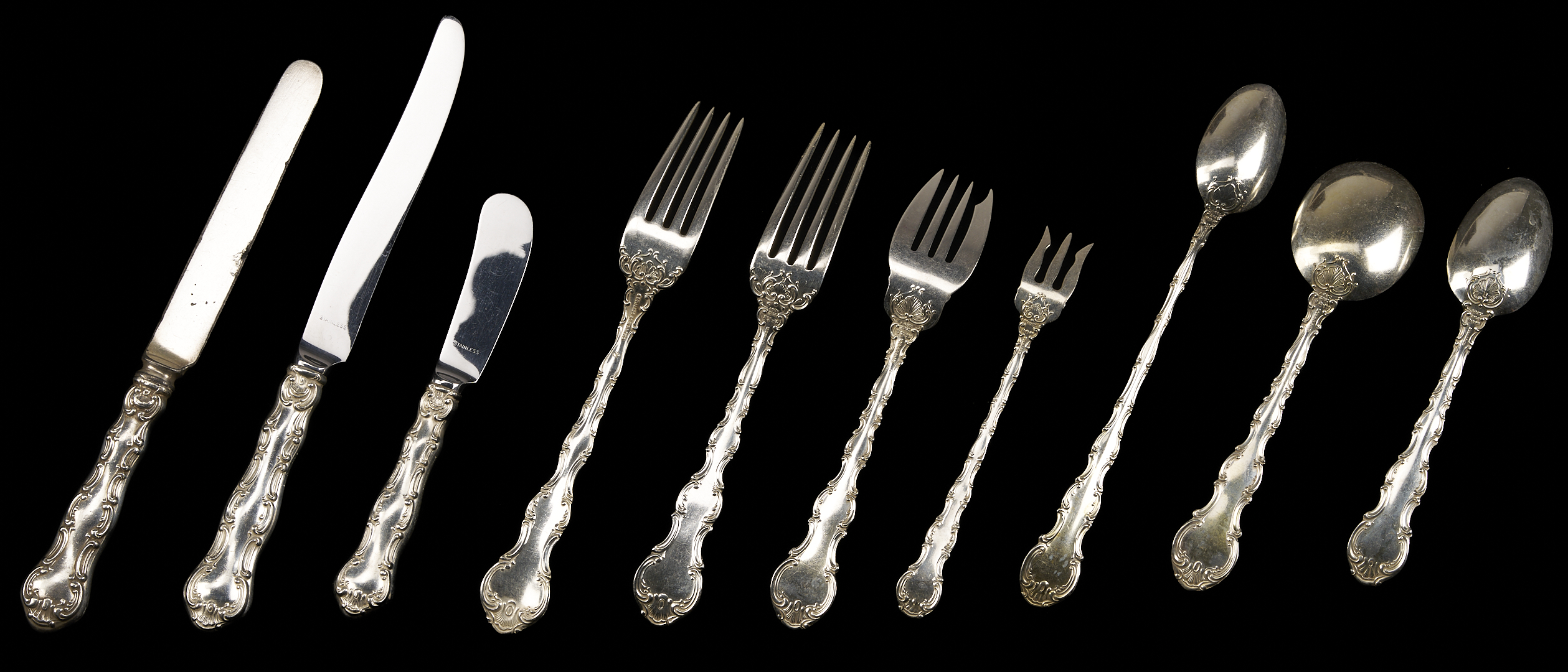 90 pieces Gorham Sterling Silver in the Strasbourg Pattern, including 8 knives measuring 8 7/8 in. L; 4 knives measuring 9 3/8 in. L; 2 knives with silverplated blades measuring 8 1/2 in. L; 6 forks measuring 7 1/2 in. L; 7 forks measuring 7 in. L; 11 salad/dessert forks; 15 teaspoons; 6 round bowl soup spoons; 6 iced tea spoons; 4 table or serving spoons; 7 hollow handle butter spreaders; 5 cocktail forks; 1 pickle fork; 1 solid salad serving fork; 1 meat fork; 1 sugar shell; 1 lemon fork; 1 master butter knife; 1 cheese server; 1 gravy ladle; and 1 jelly server. Most with “C” script monogram and most with older Gorham Lion-Anchor-G marks. Combined weighable sterling: 94.35 oz troy.