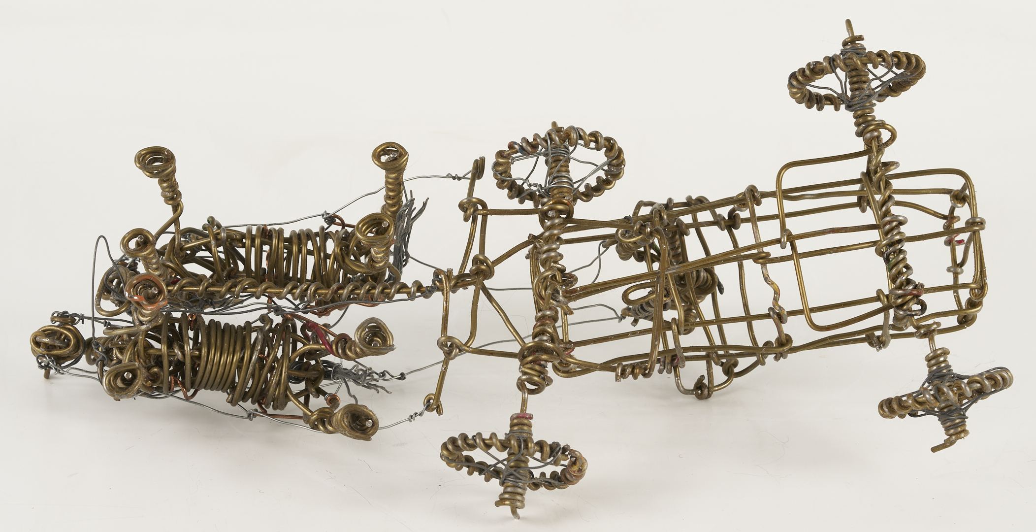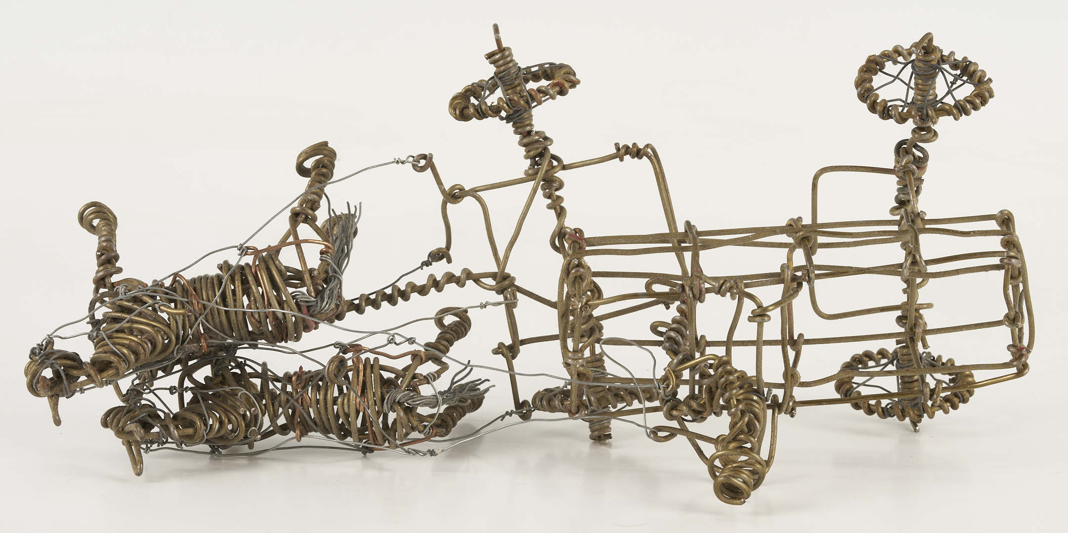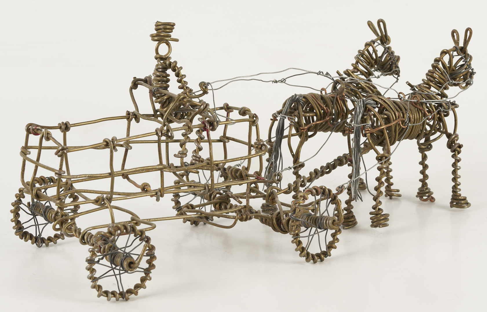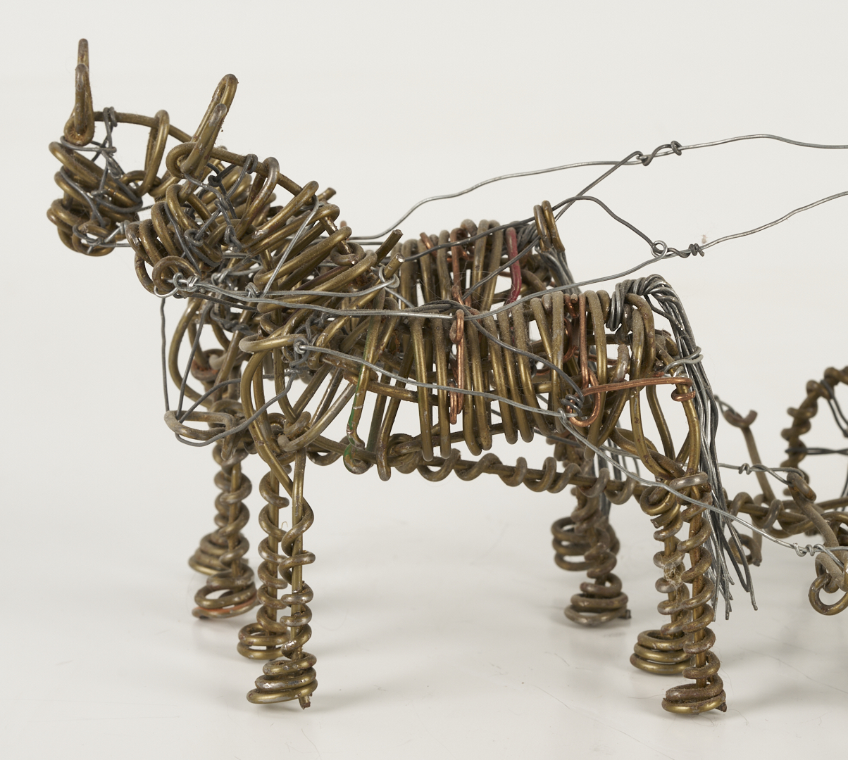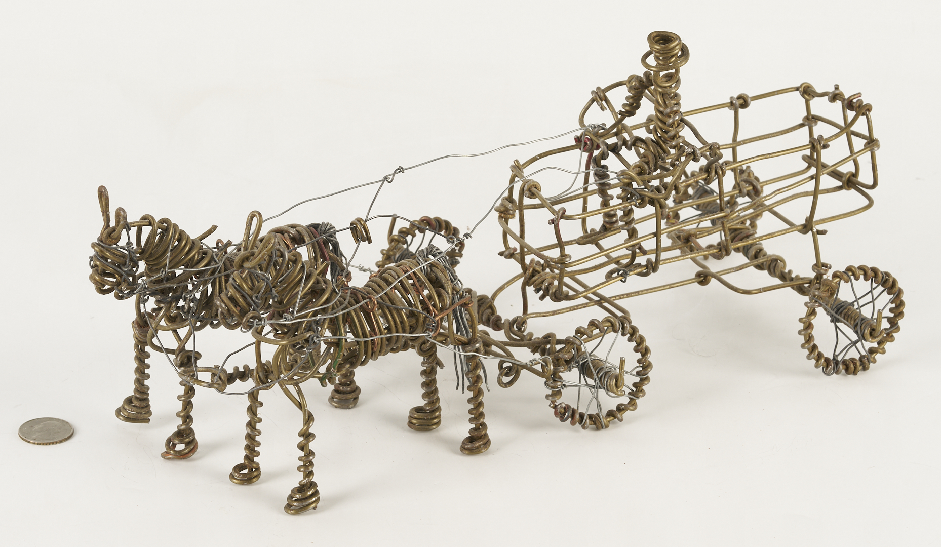 Vannoy Streeter (Tennessee, 1919-1998) folk or outsider wire sculpture depicting a figure wearing a top hat driving a wagon pulled by two horses. 6 3/4 in. H x 14 3/4 in. D x 6 1/2 in. W. 20th century. Biographical note: “Self-taught sculptor Vannoy Streeter was known as ‘Wireman’ because of the fanciful creations he fashioned from coat hangers and metal wire. Best known for his depictions of the Tennessee Walking Horse, Streeter also created scores of other images using wrapped and twisted wire. By the time of his death in 1998, Streeter had gained national exposure. He participated in the National Black Arts Festival in 1990, and his work attracted collectors from around the United States. Born in 1919 in Wartrace, Tennessee, Streeter moved with his family to what would later become a Tennessee Walking Horse farm. At the time, owners were still training their mixed thoroughbreds to prance in front of buggies. The oldest of six brothers, he learned the horse grooming and training business from his father. When the first Walking Horse Celebration was held in Wartrace, Streeter was there to observe the high-stepping front legs and sliding, low-slung back legs that created the characteristic rocking gait. After the Walking Horse Celebration moved to its current home in the county seat of Shelbyville, Streeter took special pride in the fact that African American trainers helped develop the Walking Horse style and that champion horse ‘Strolling Jim’ was from Wartrace.” (Source: The Tennessee Encyclopedia)