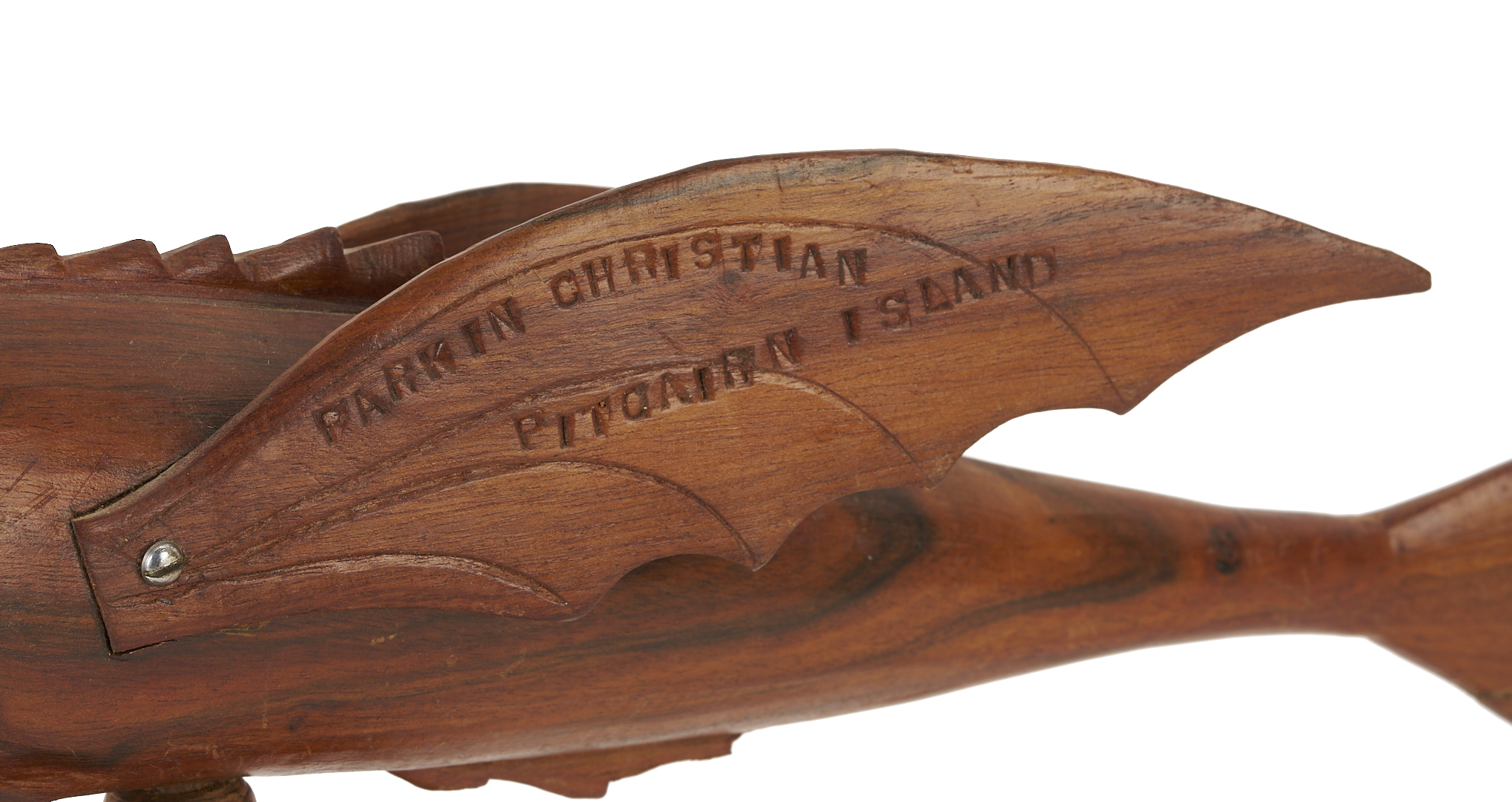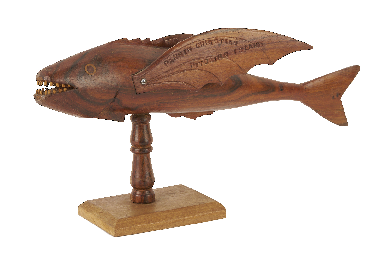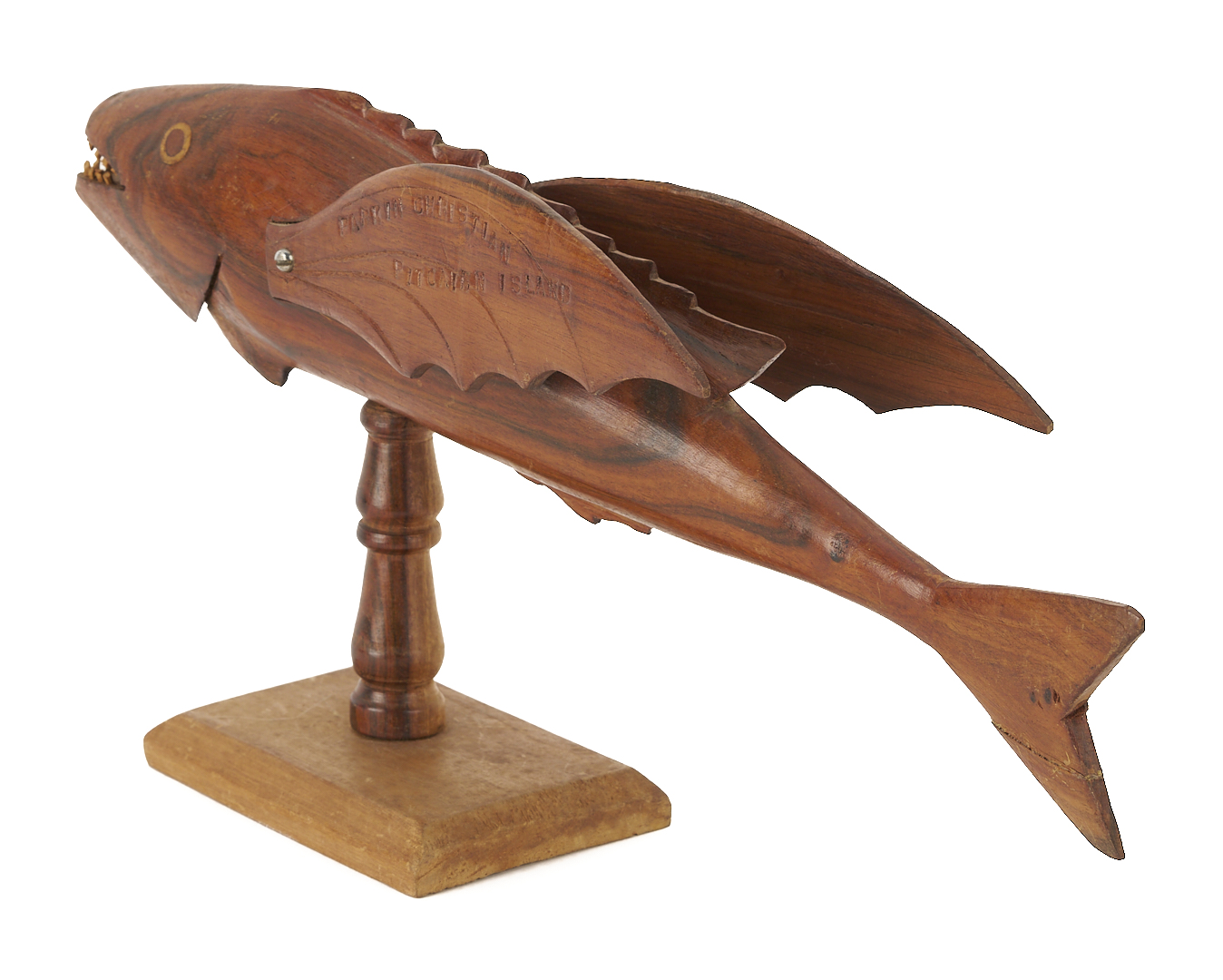 Two (2) New Zealand, Pitcairn Island, carved folk art wood animal sculptures, including a flying fish on stand marked PARKIN CHRISTIAN PITCAIRN ISLAND and a sea turtle marked PITCAIRN ISLAND. Fish: 3 in. H x 13 1/8 in. W x 4 in. D. Turtle: 3 1/4 in. H x 9 1/2 in. L x 4 5/8 in. W. 20th century.