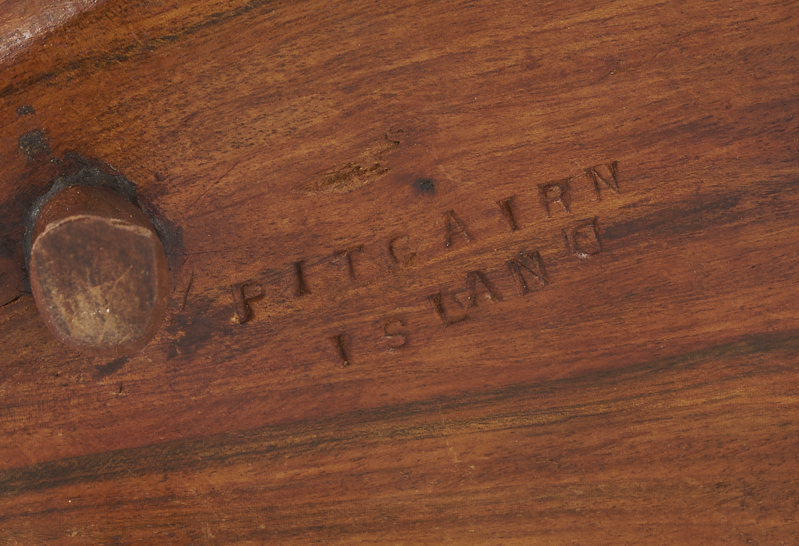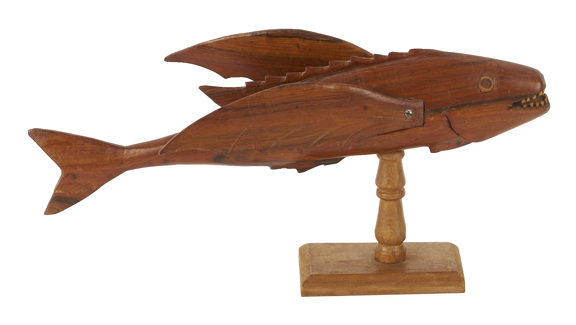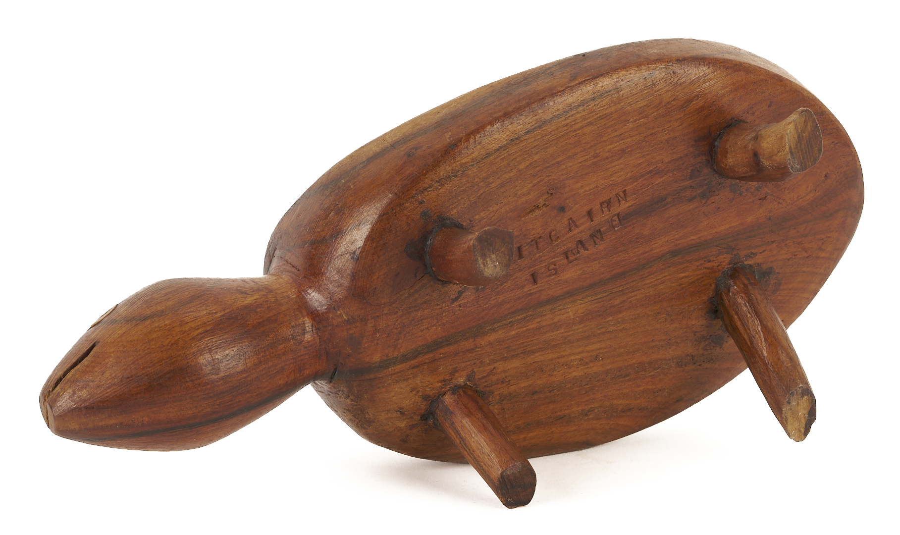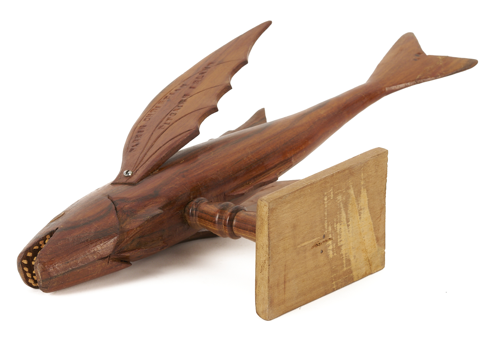 Two (2) New Zealand, Pitcairn Island, carved folk art wood animal sculptures, including a flying fish on stand marked PARKIN CHRISTIAN PITCAIRN ISLAND and a sea turtle marked PITCAIRN ISLAND. Fish: 3 in. H x 13 1/8 in. W x 4 in. D. Turtle: 3 1/4 in. H x 9 1/2 in. L x 4 5/8 in. W. 20th century.