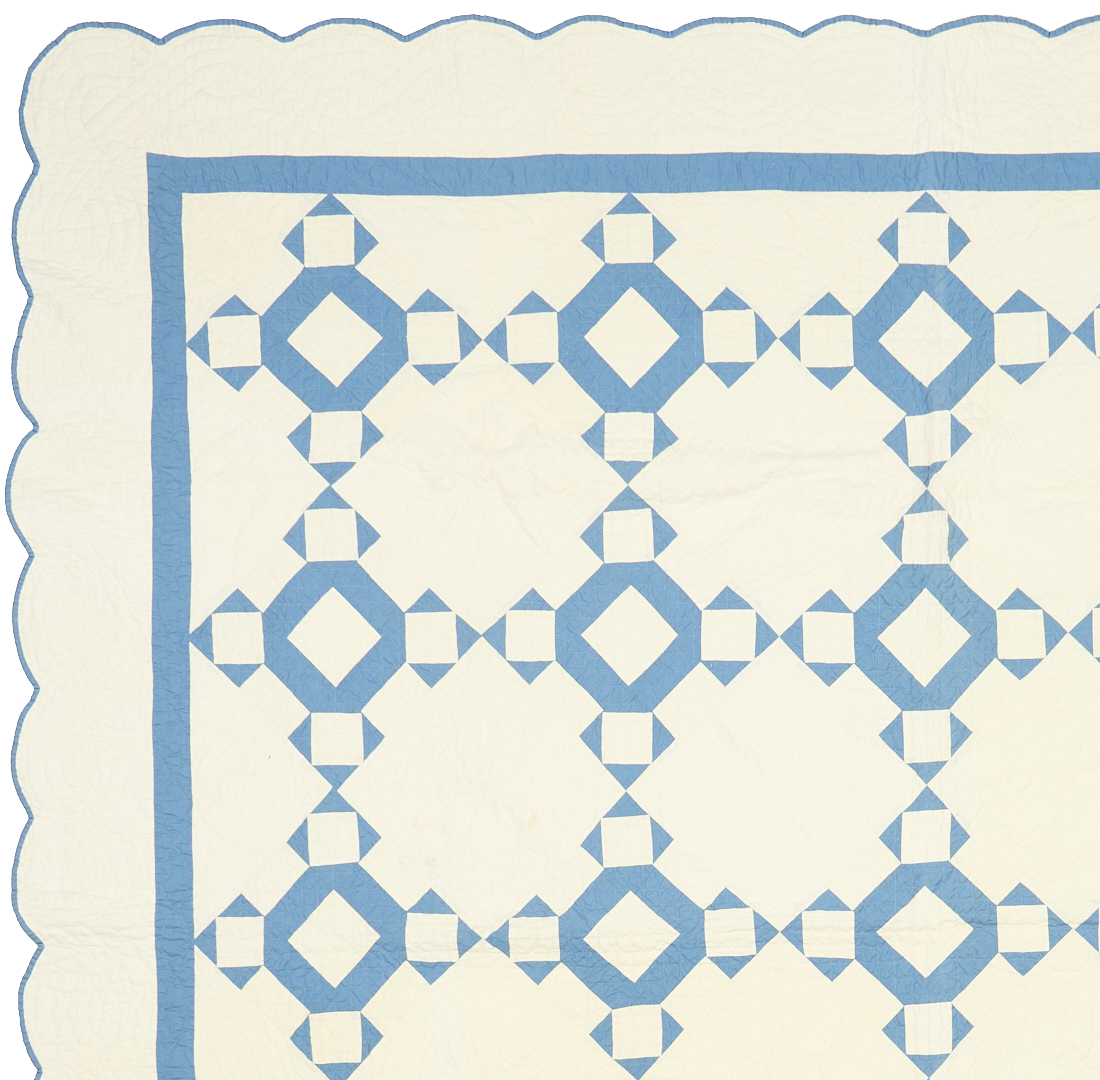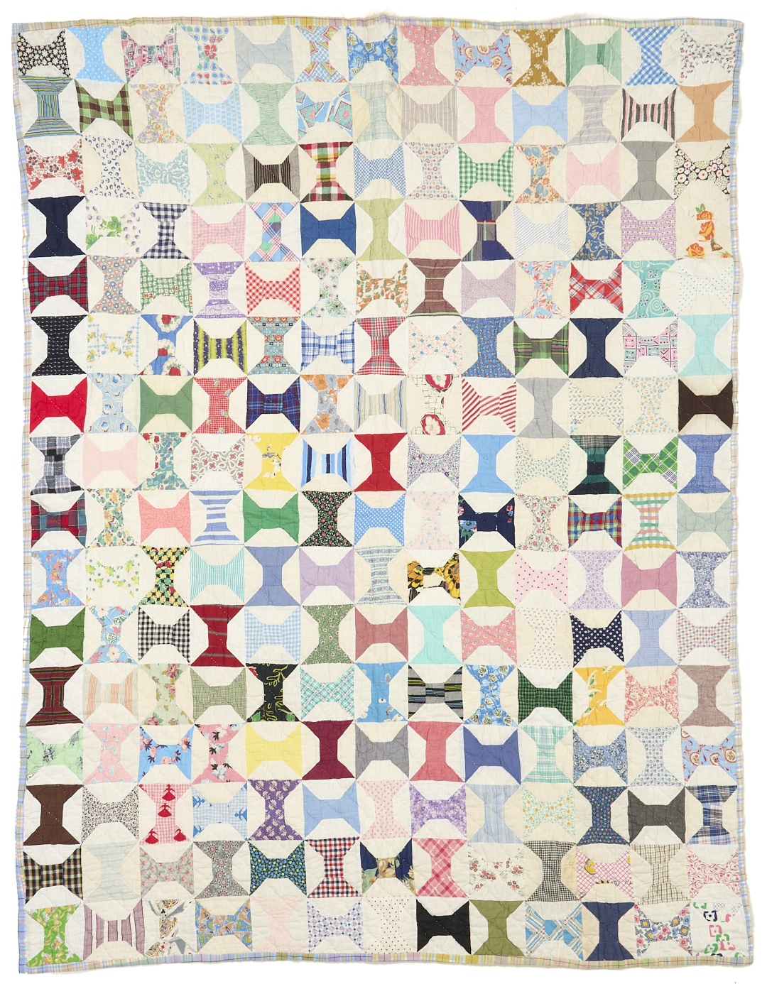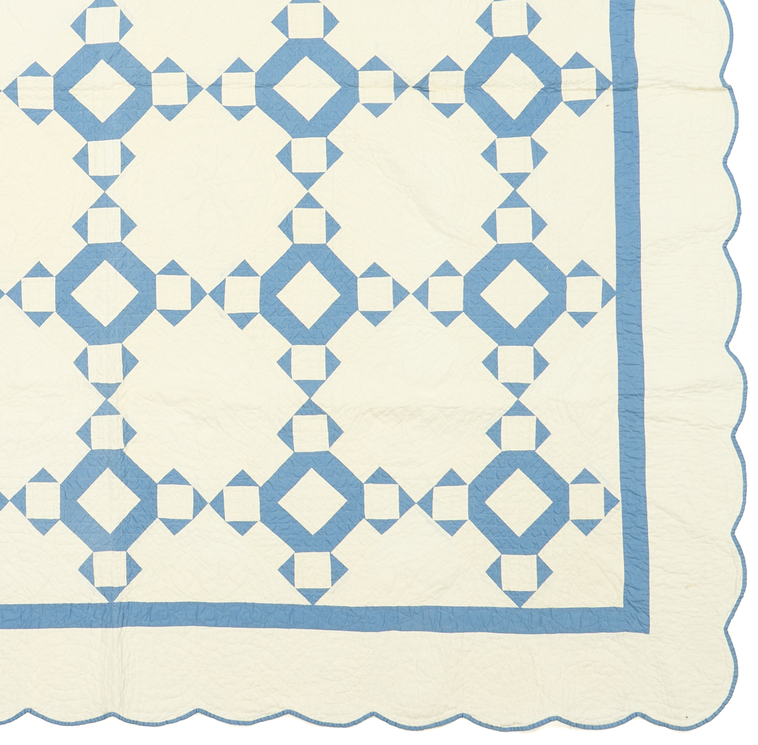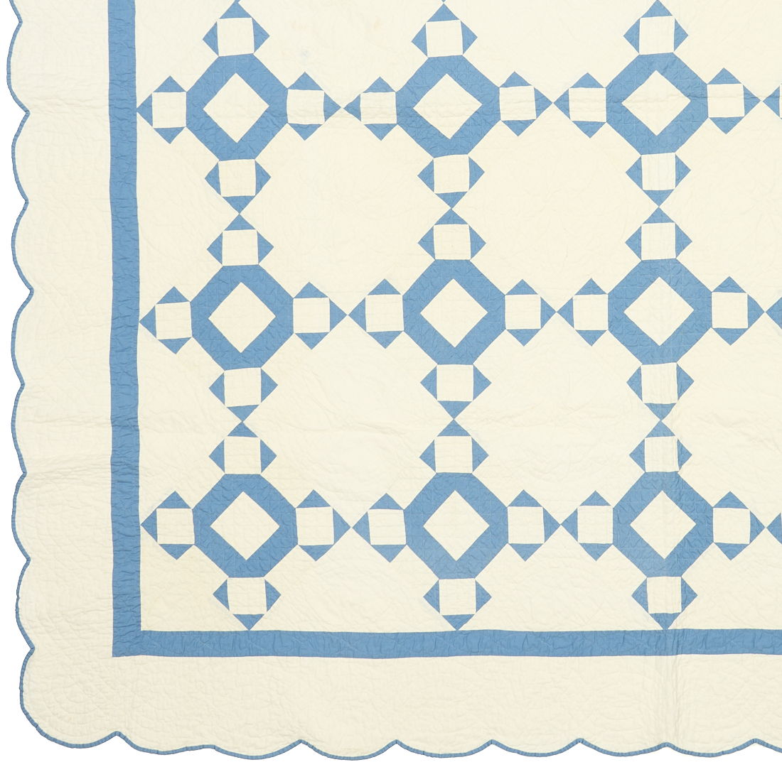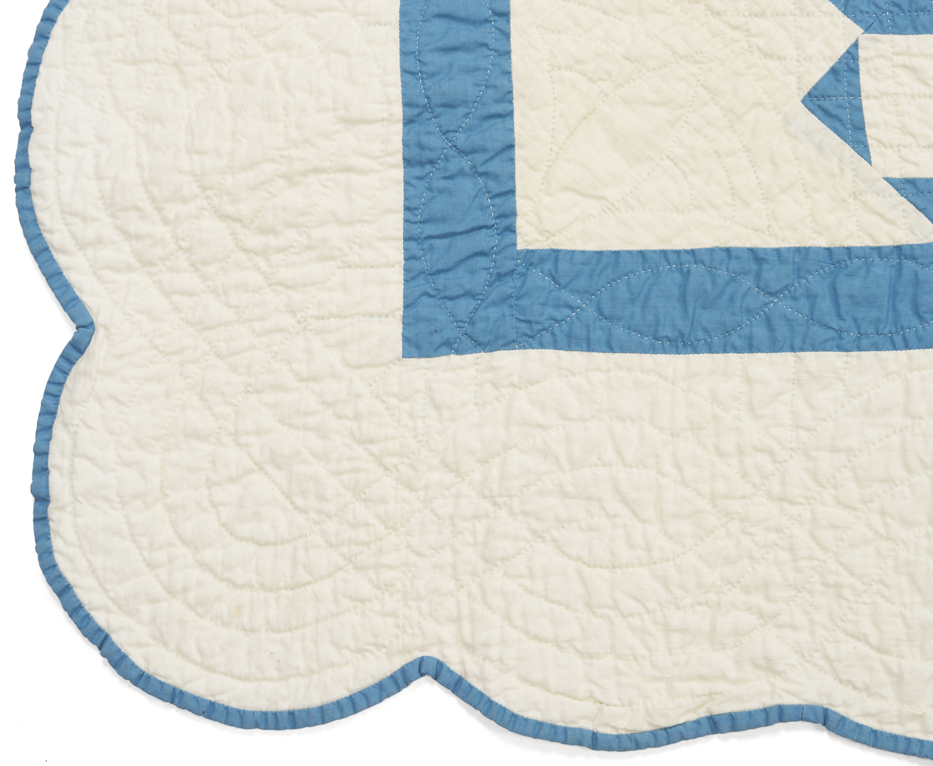 1st item: An American blue and white pieced and hand-quilted cotton quilt, Rolling Stone pattern, with cotton thread and batting, matching blue binding on scalloped sides, and a white cotton backing. Hand-quilted at 10 stitches per inch, blue quilting lines still visible, cross-hatching over the pieced blocks, parallel serpentine quilting lines in the outer border. Cable quilting in the outer border. 84 in. x 84 in. Circa 1930s. 2nd item: An American vintage multicolored cotton pieced quilt in the Spools pattern. Cotton is comprised of dress prints and possibly some feed sacks, featuring cotton batting and thread, and a pastel plaid backing, with parallel and diagonal line quilting. 68 in. x 88 in. Circa 1960s.