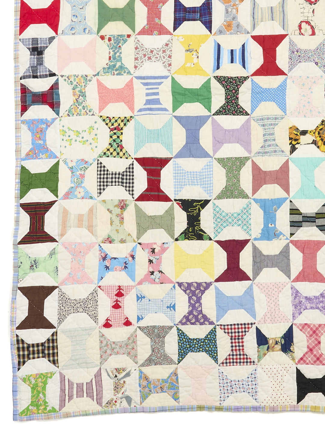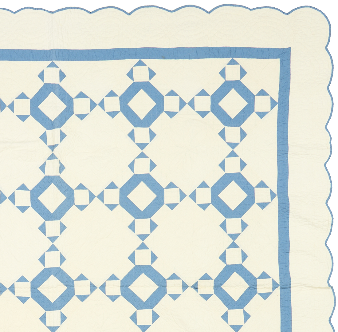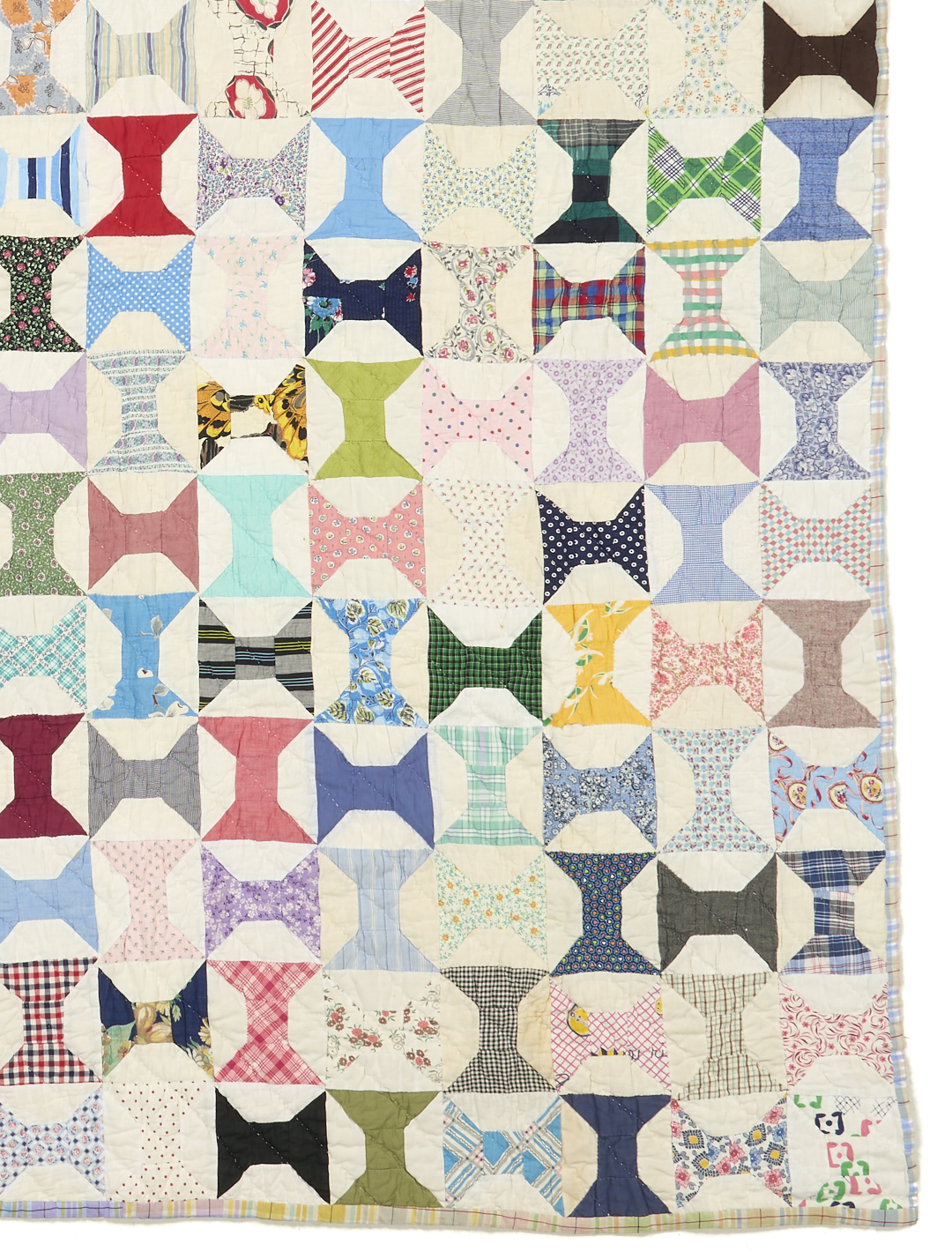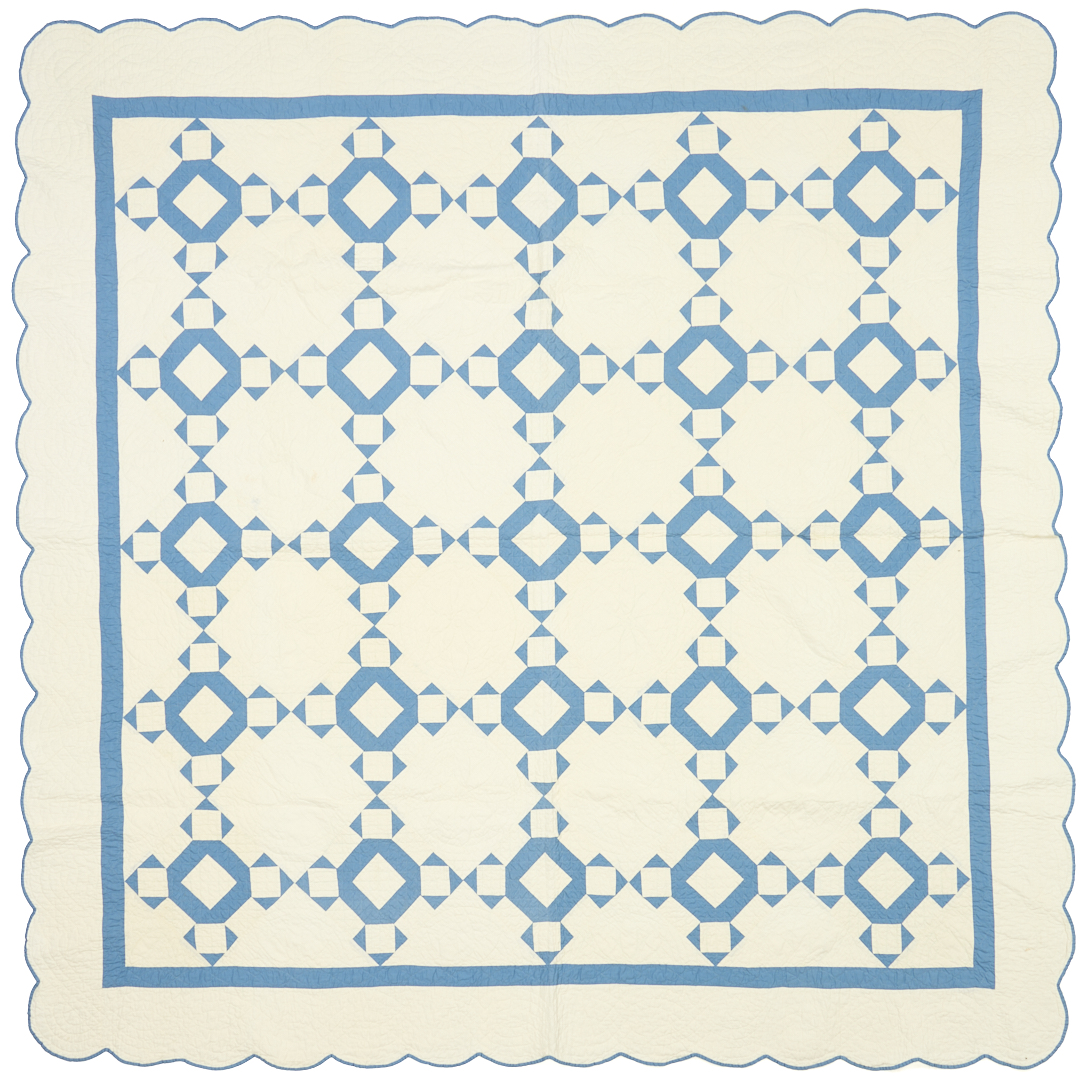 1st item: An American blue and white pieced and hand-quilted cotton quilt, Rolling Stone pattern, with cotton thread and batting, matching blue binding on scalloped sides, and a white cotton backing. Hand-quilted at 10 stitches per inch, blue quilting lines still visible, cross-hatching over the pieced blocks, parallel serpentine quilting lines in the outer border. Cable quilting in the outer border. 84 in. x 84 in. Circa 1930s. 2nd item: An American vintage multicolored cotton pieced quilt in the Spools pattern. Cotton is comprised of dress prints and possibly some feed sacks, featuring cotton batting and thread, and a pastel plaid backing, with parallel and diagonal line quilting. 68 in. x 88 in. Circa 1960s.