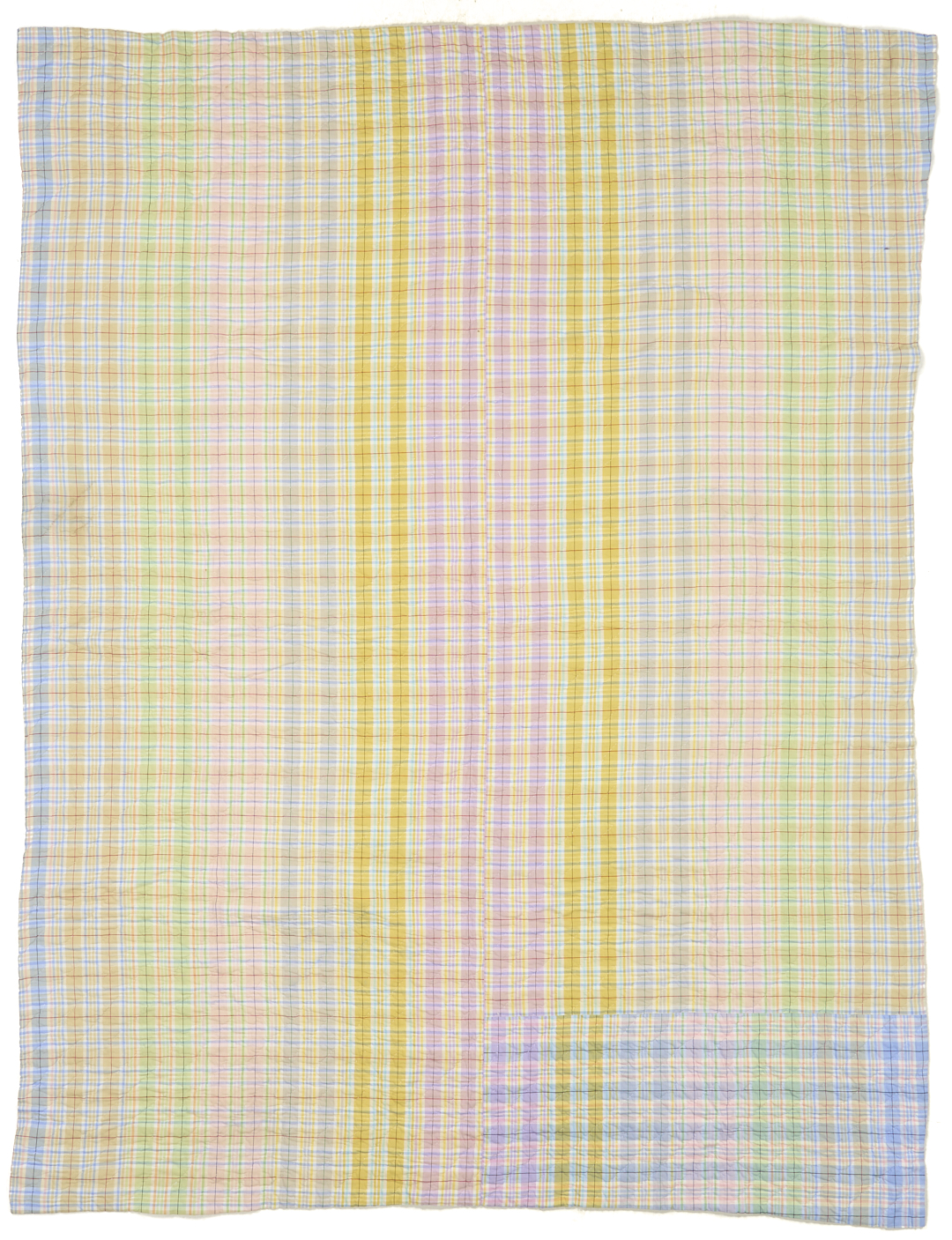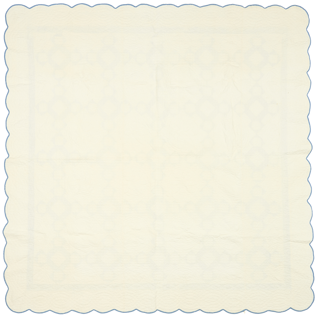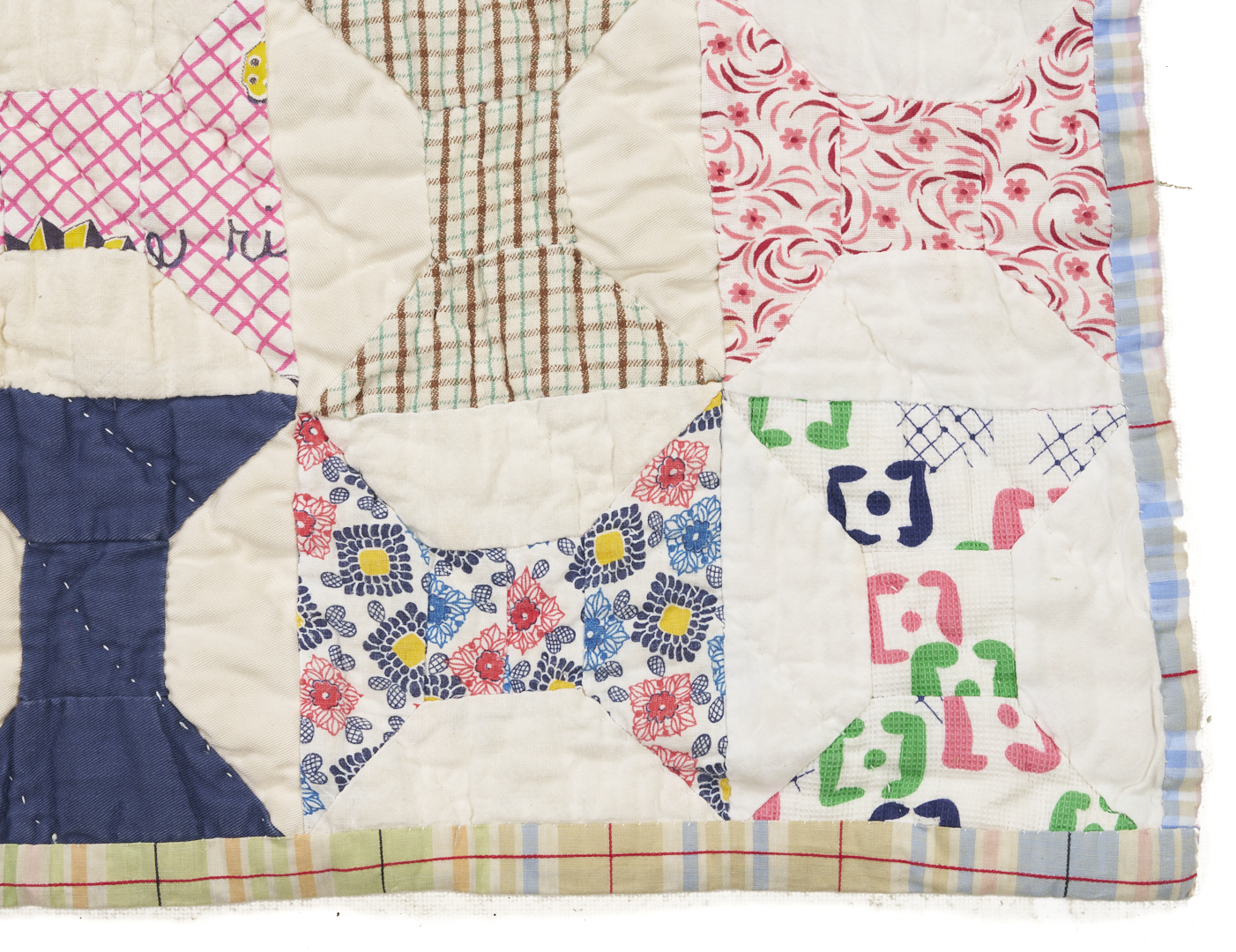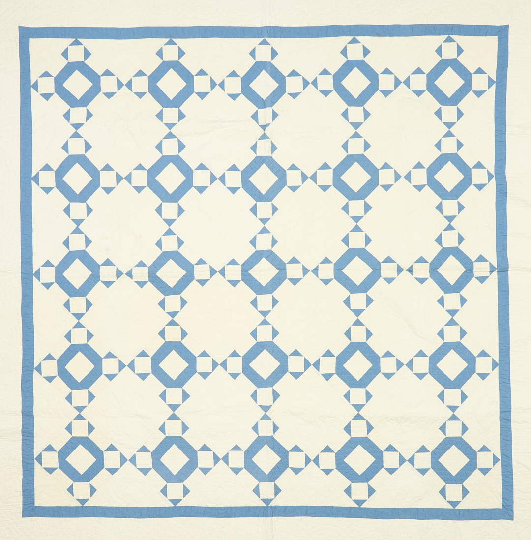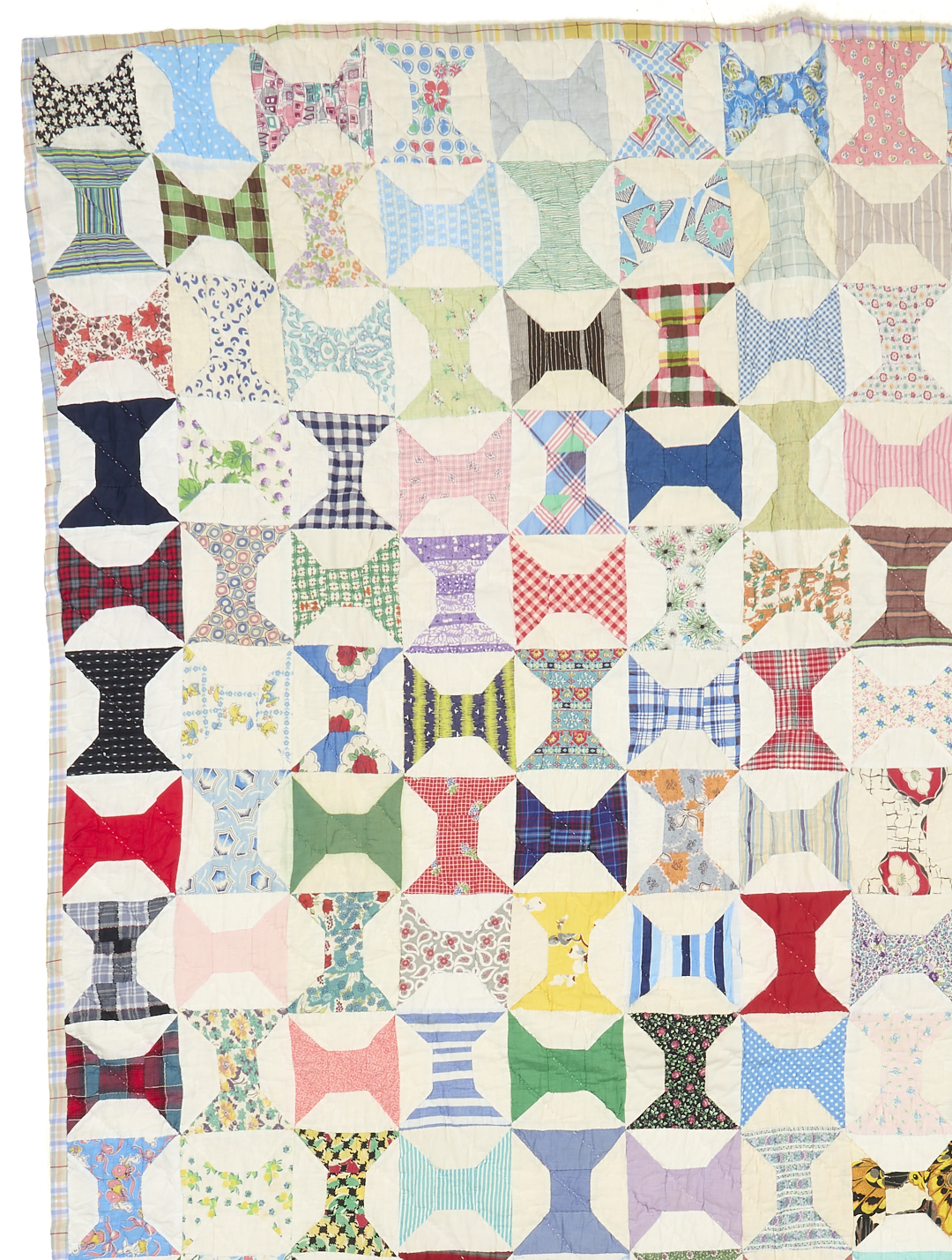 1st item: An American blue and white pieced and hand-quilted cotton quilt, Rolling Stone pattern, with cotton thread and batting, matching blue binding on scalloped sides, and a white cotton backing. Hand-quilted at 10 stitches per inch, blue quilting lines still visible, cross-hatching over the pieced blocks, parallel serpentine quilting lines in the outer border. Cable quilting in the outer border. 84 in. x 84 in. Circa 1930s. 2nd item: An American vintage multicolored cotton pieced quilt in the Spools pattern. Cotton is comprised of dress prints and possibly some feed sacks, featuring cotton batting and thread, and a pastel plaid backing, with parallel and diagonal line quilting. 68 in. x 88 in. Circa 1960s.