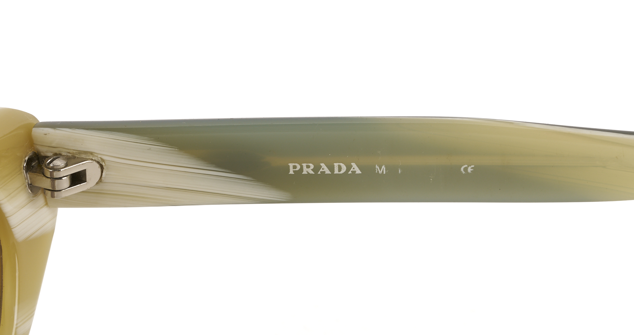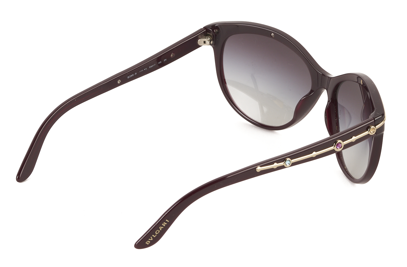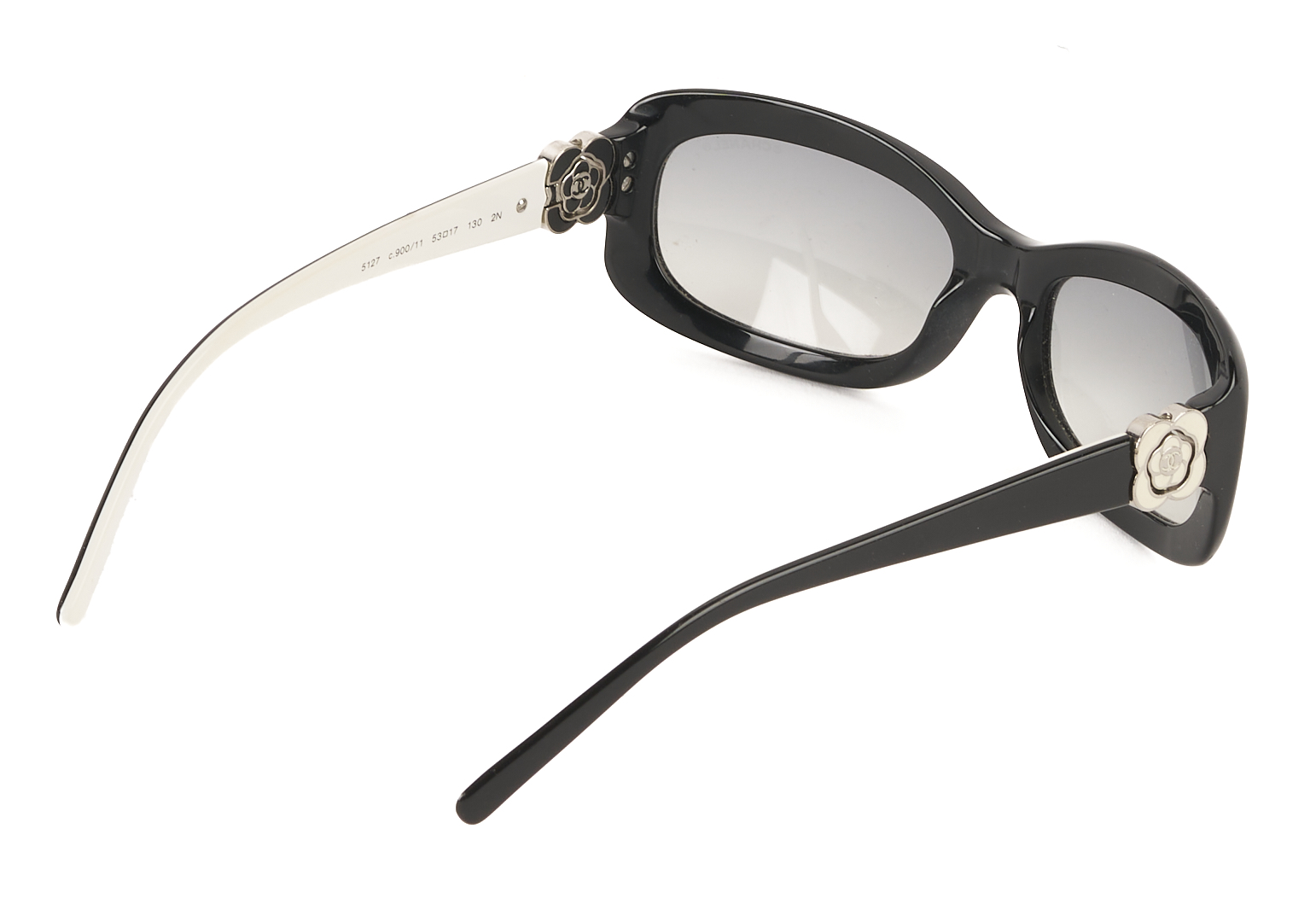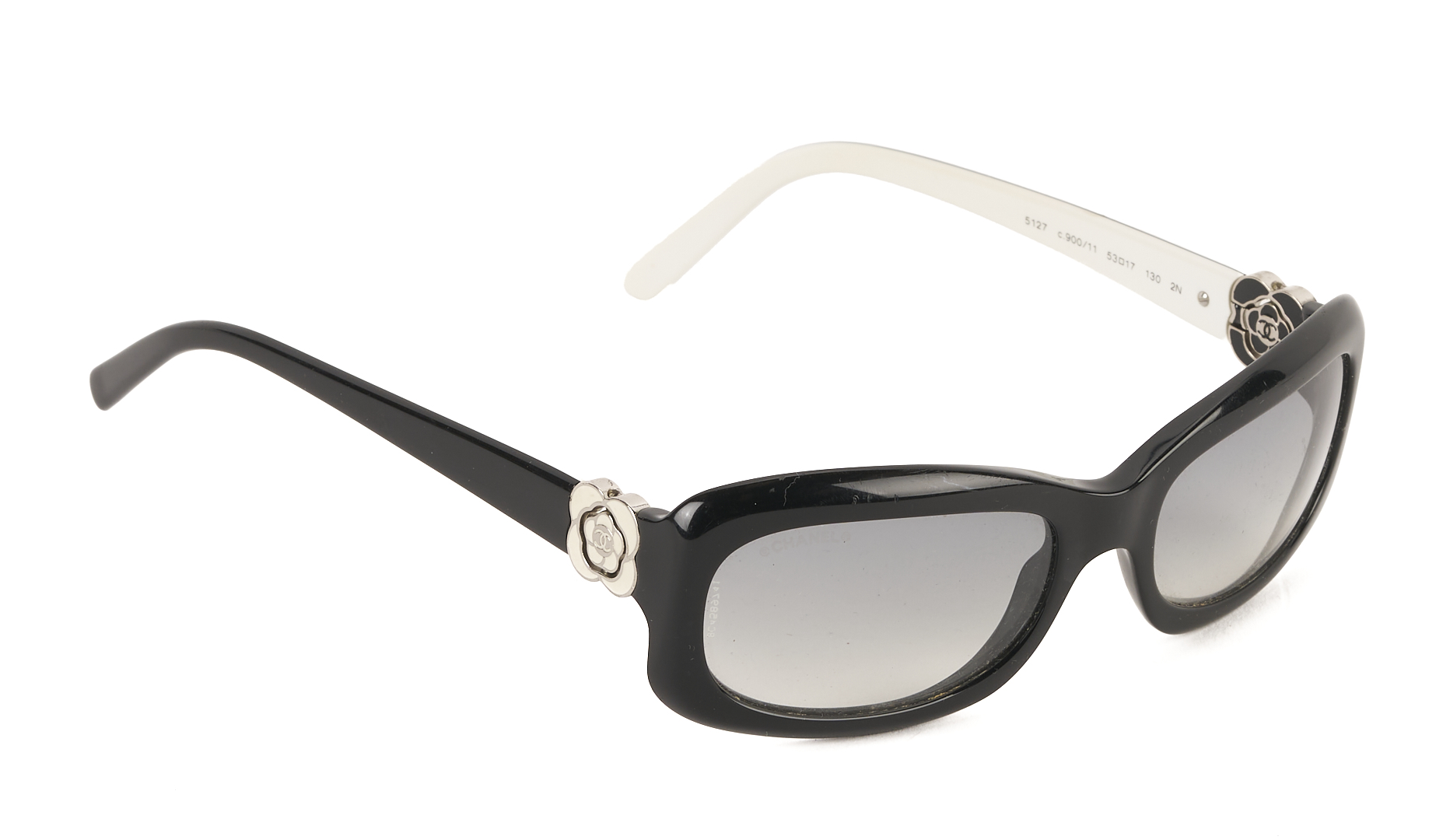 Four (4) pairs of designer sunglasses including: one pair of Chanel 5127 c.900/11 sunglasses in black and white with oval frames and floral design, retains the original box, 6 1/2 in. L x 3 in. W; one pair of Theo Peratrice, Belgium sunglasses in matte green marble style with the original yellow box, 6 in. L x 2 in. W; one pair of Bvlgari purple sunglasses with gemstone and gold accents, housed in an unbranded box; and one pair of Prada sunglasses in black and muted green tones, housed in an unbranded box.