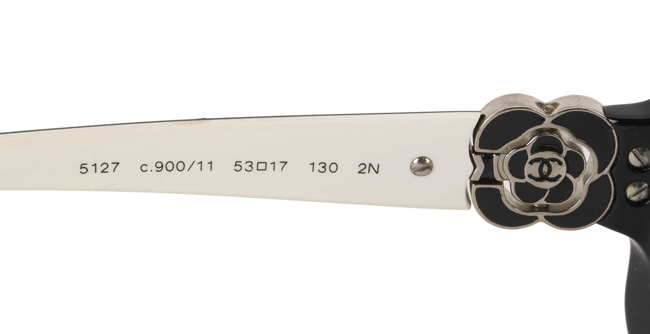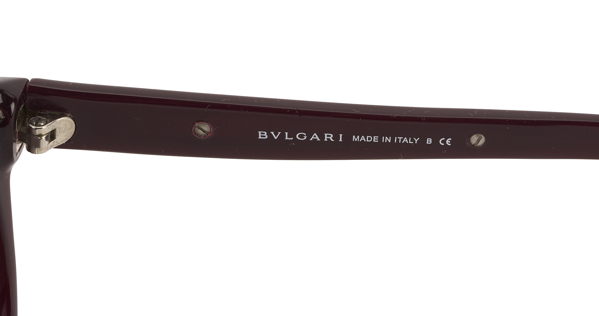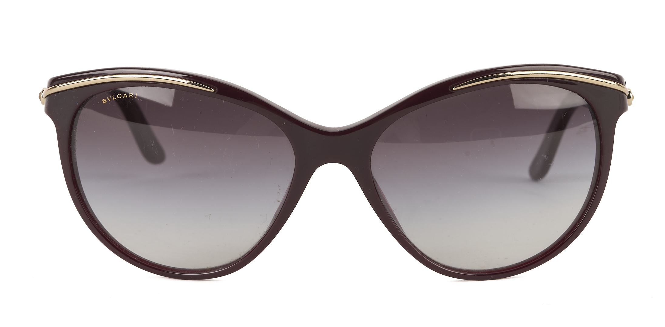 Four (4) pairs of designer sunglasses including: one pair of Chanel 5127 c.900/11 sunglasses in black and white with oval frames and floral design, retains the original box, 6 1/2 in. L x 3 in. W; one pair of Theo Peratrice, Belgium sunglasses in matte green marble style with the original yellow box, 6 in. L x 2 in. W; one pair of Bvlgari purple sunglasses with gemstone and gold accents, housed in an unbranded box; and one pair of Prada sunglasses in black and muted green tones, housed in an unbranded box.