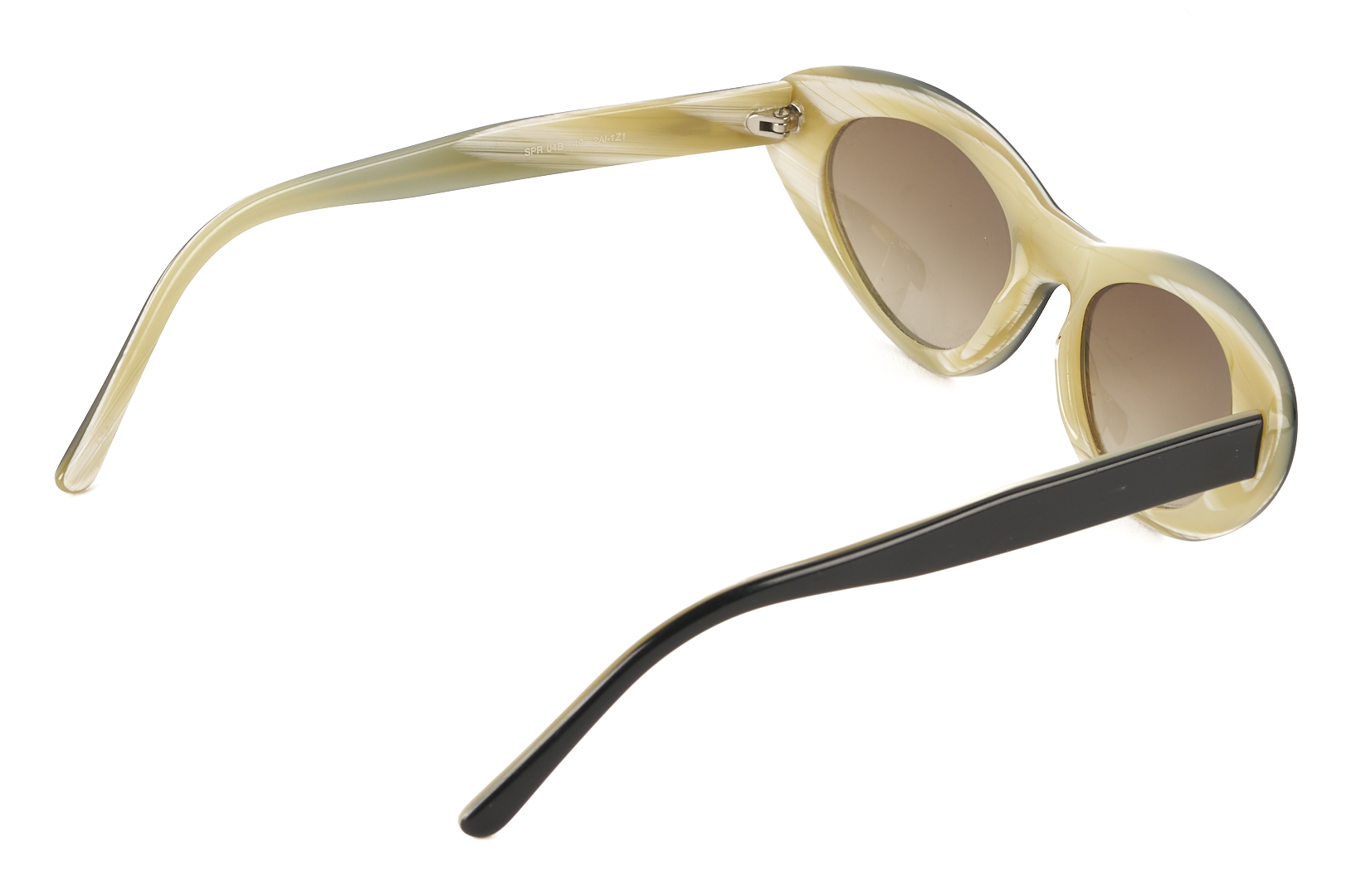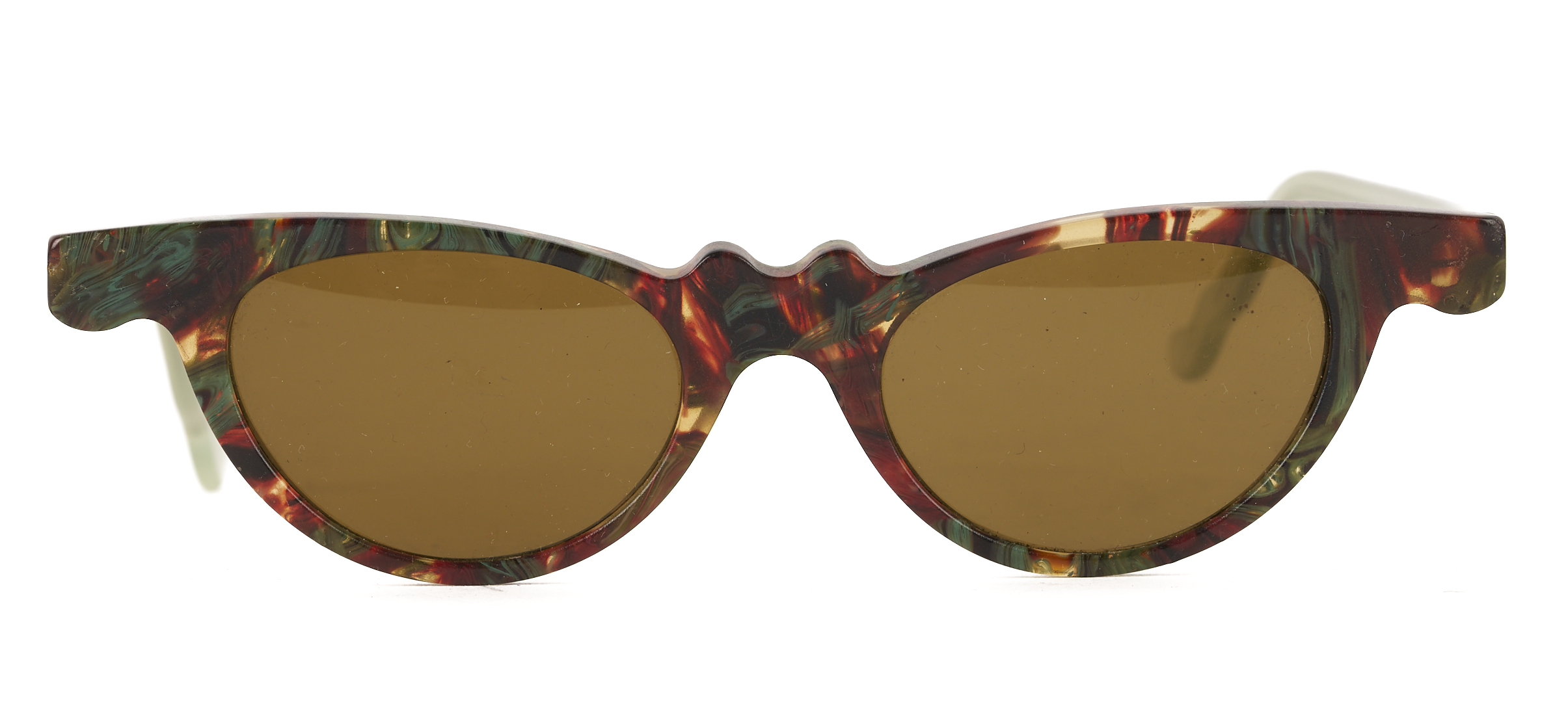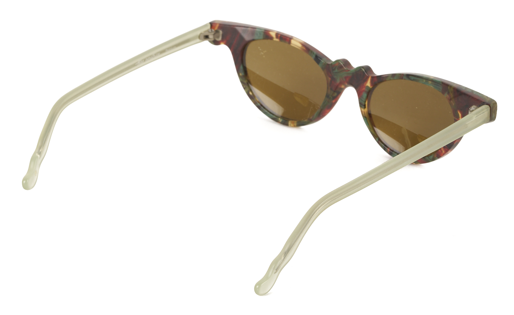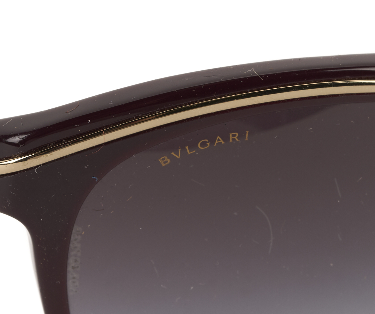 Four (4) pairs of designer sunglasses including: one pair of Chanel 5127 c.900/11 sunglasses in black and white with oval frames and floral design, retains the original box, 6 1/2 in. L x 3 in. W; one pair of Theo Peratrice, Belgium sunglasses in matte green marble style with the original yellow box, 6 in. L x 2 in. W; one pair of Bvlgari purple sunglasses with gemstone and gold accents, housed in an unbranded box; and one pair of Prada sunglasses in black and muted green tones, housed in an unbranded box.