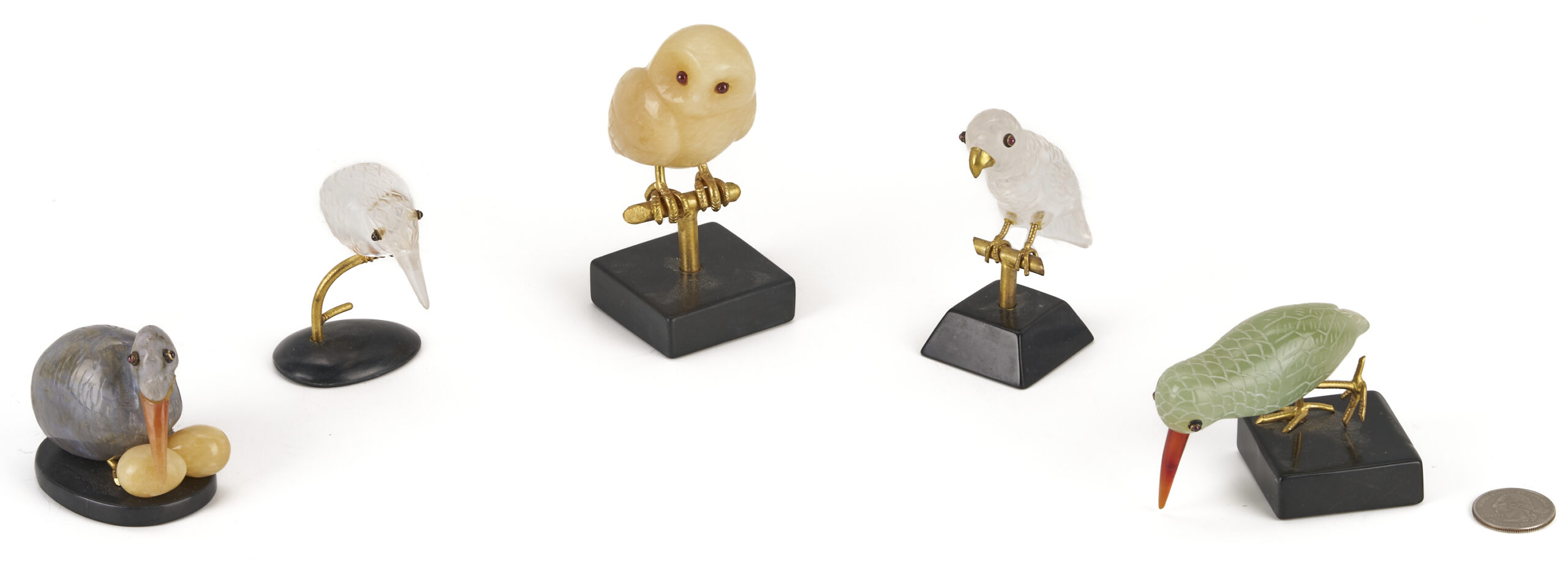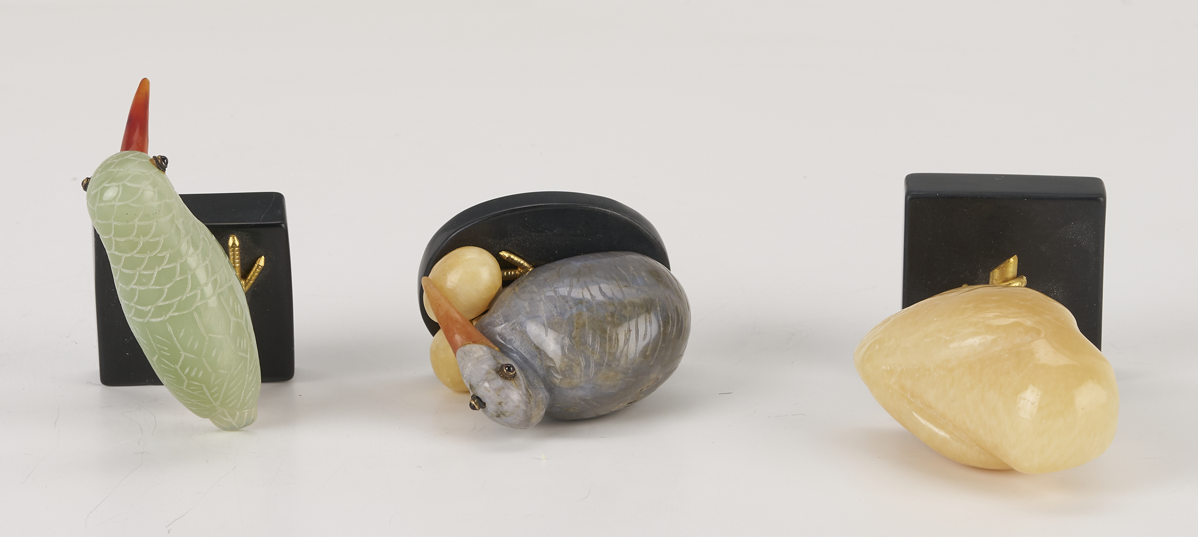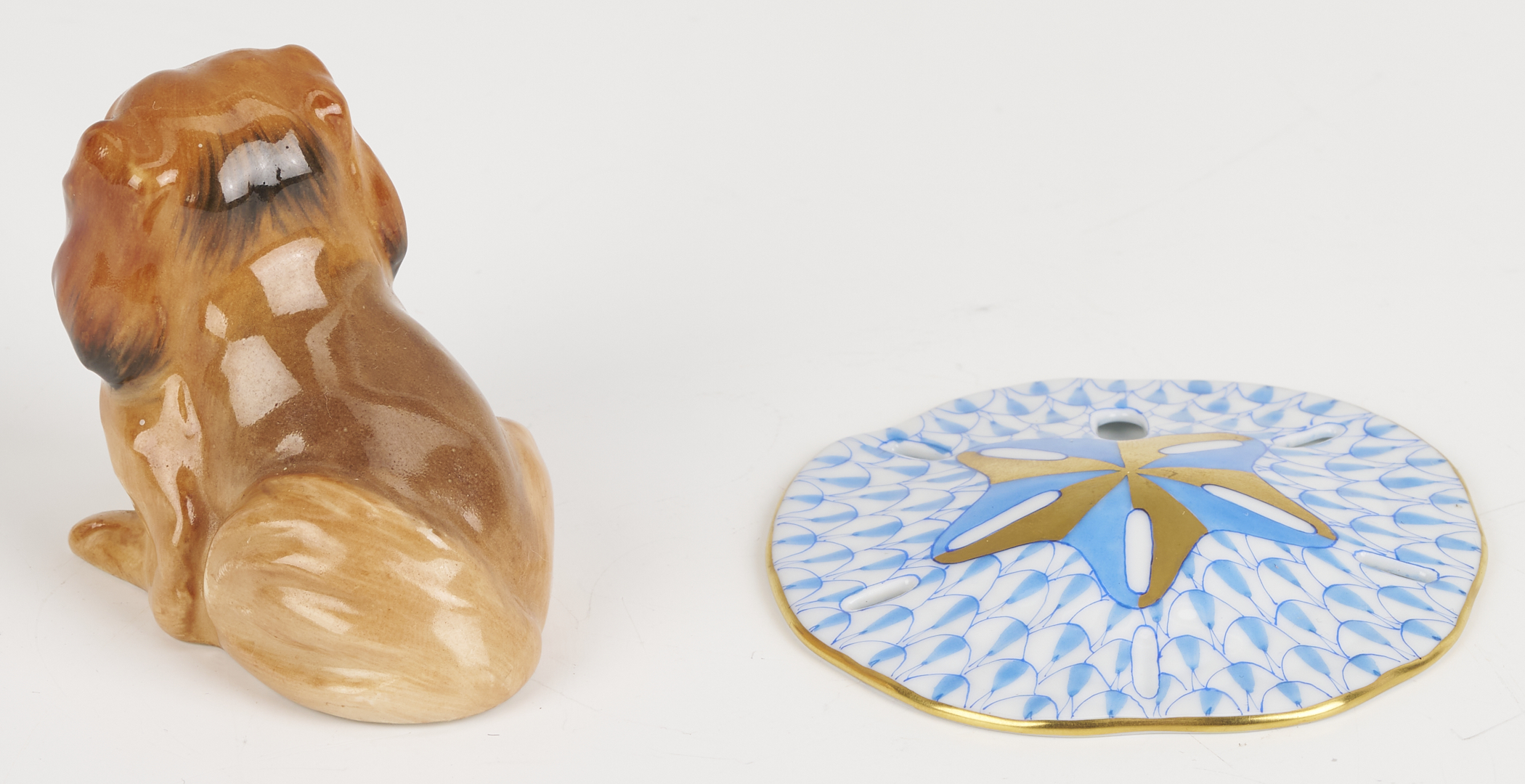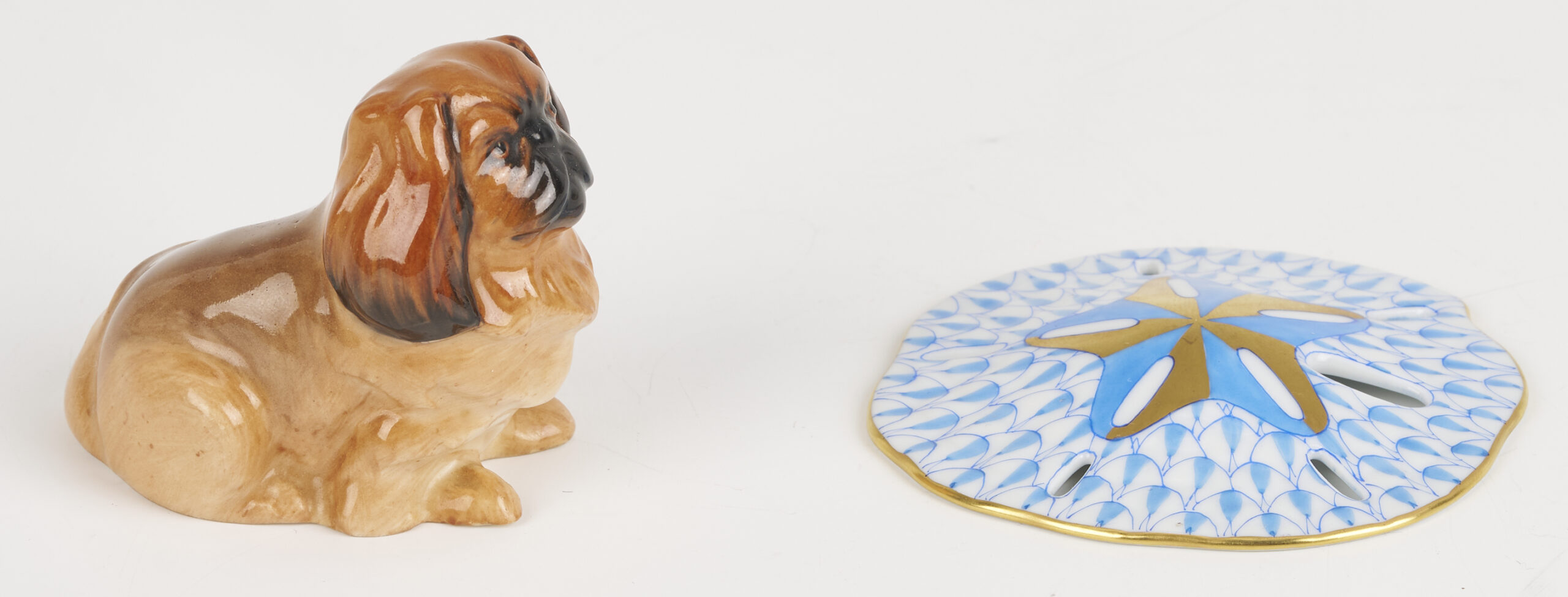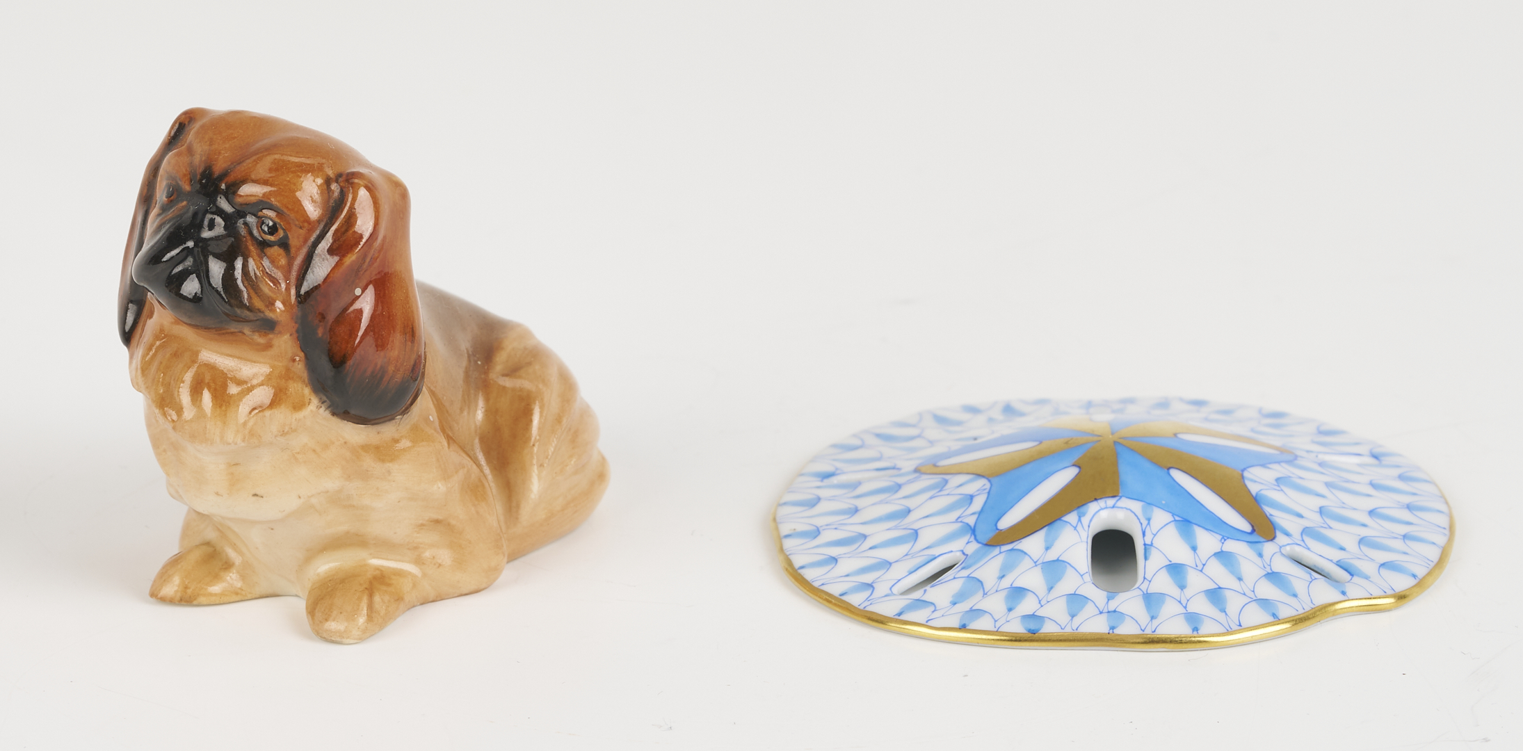 Collection of hand-painted porcelain and carved hardstone figurines, including one (1) Blue Herend sand dollar; one (1) pair of Herend red porcelain ducks in a resting position, each with stamp marks and model numbers to the underside; and one (1) Royal Doulton porcelain dog figure with tan-colored fur, depicted lying down in a propped-up pose and marked to the underside. Together with five (5) carved hardstone miniature birds having faux jeweled eyes, each mounted on black polished hardstone stands, one bird accompanied by two stone “eggs.” Figurines range from approx. 2 1/4 in. H to 4 in. H. Herend and Royal Doulton pieces 20th–early 21st century; hardstone carvings likely Chinese, mid to late 20th century.