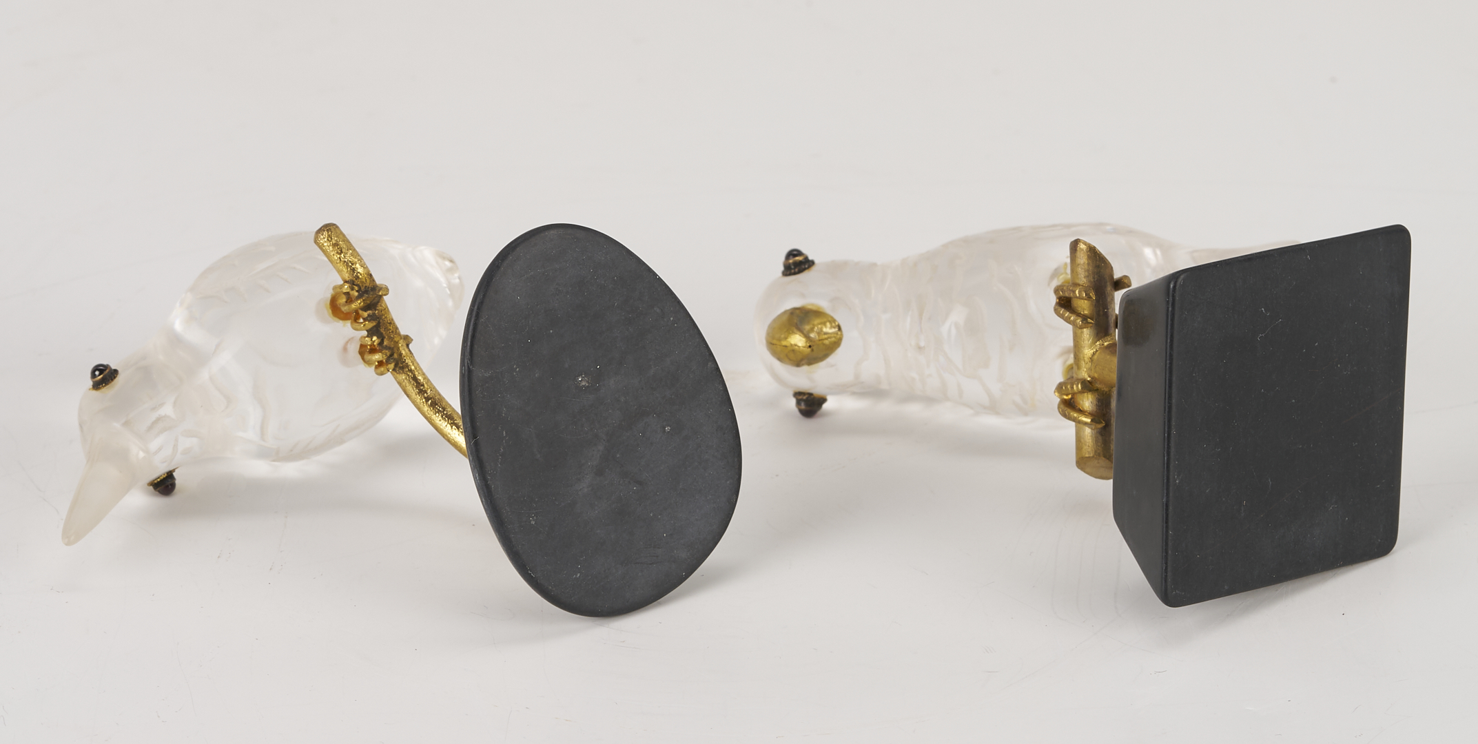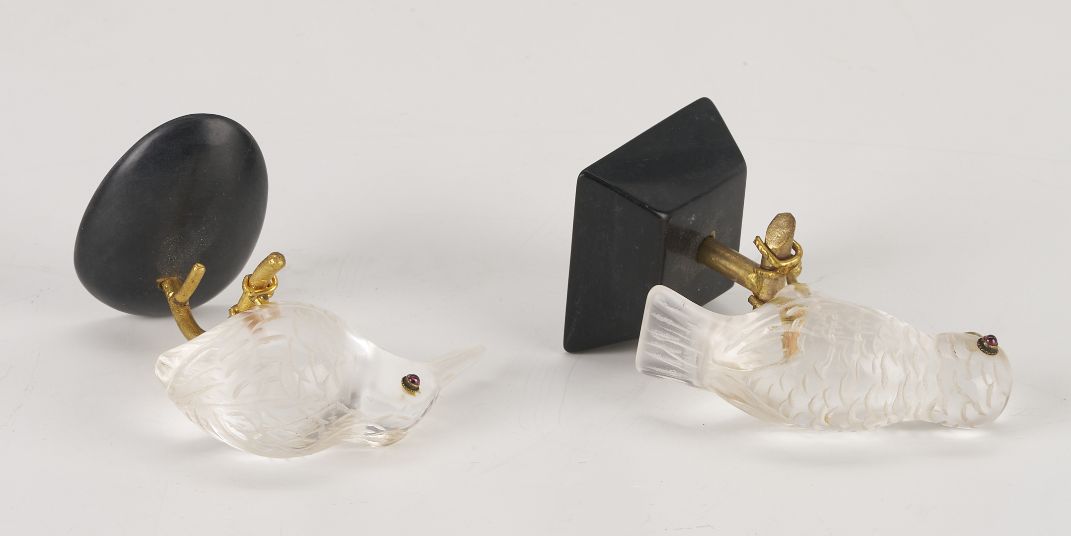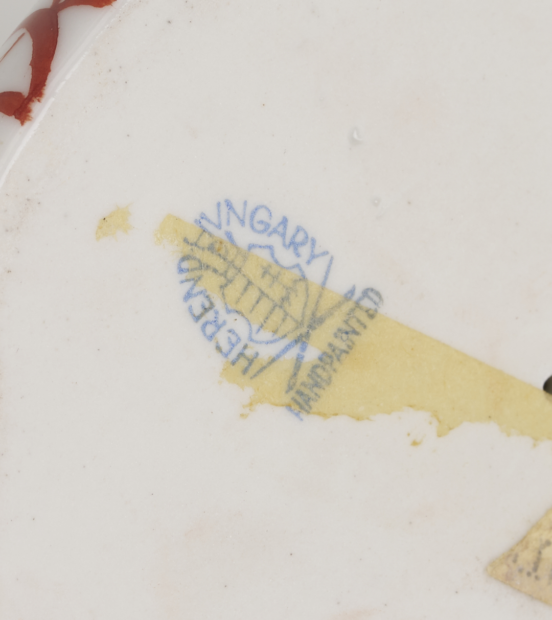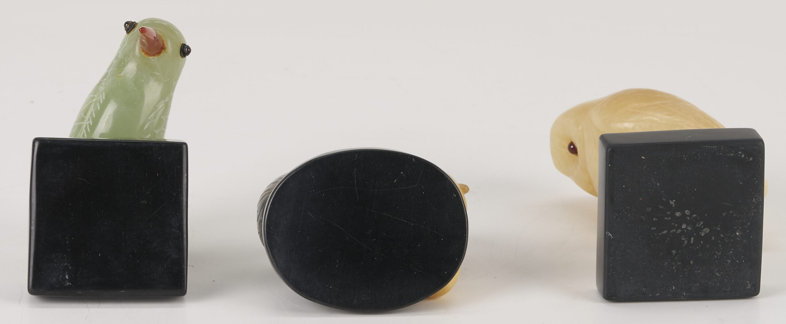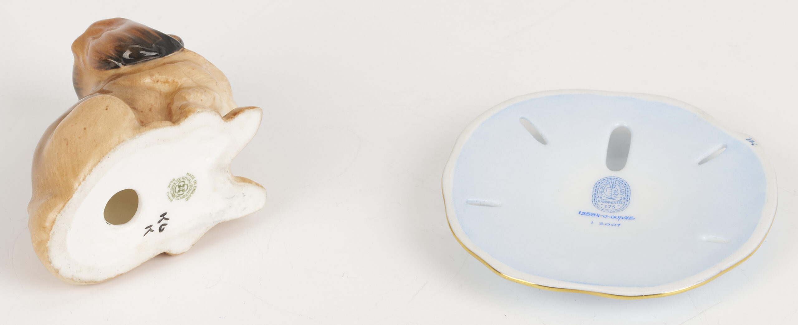 Collection of hand-painted porcelain and carved hardstone figurines, including one (1) Blue Herend sand dollar; one (1) pair of Herend red porcelain ducks in a resting position, each with stamp marks and model numbers to the underside; and one (1) Royal Doulton porcelain dog figure with tan-colored fur, depicted lying down in a propped-up pose and marked to the underside. Together with five (5) carved hardstone miniature birds having faux jeweled eyes, each mounted on black polished hardstone stands, one bird accompanied by two stone “eggs.” Figurines range from approx. 2 1/4 in. H to 4 in. H. Herend and Royal Doulton pieces 20th–early 21st century; hardstone carvings likely Chinese, mid to late 20th century.