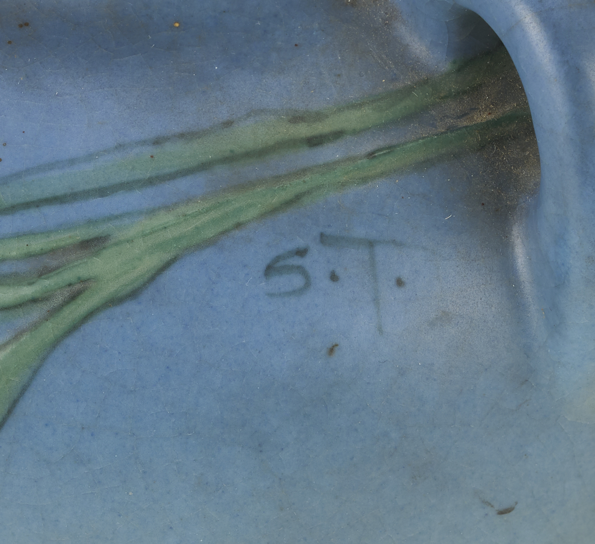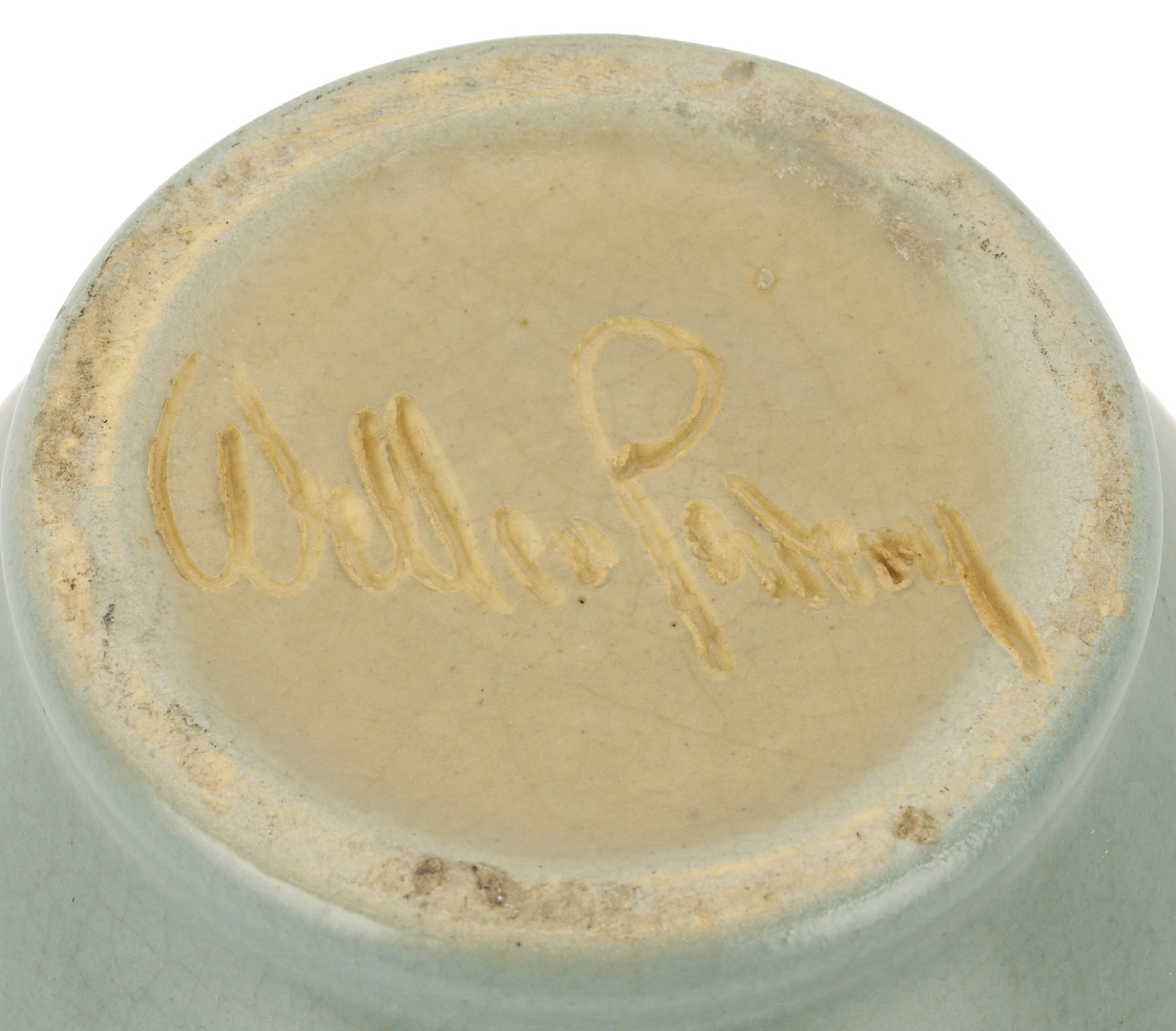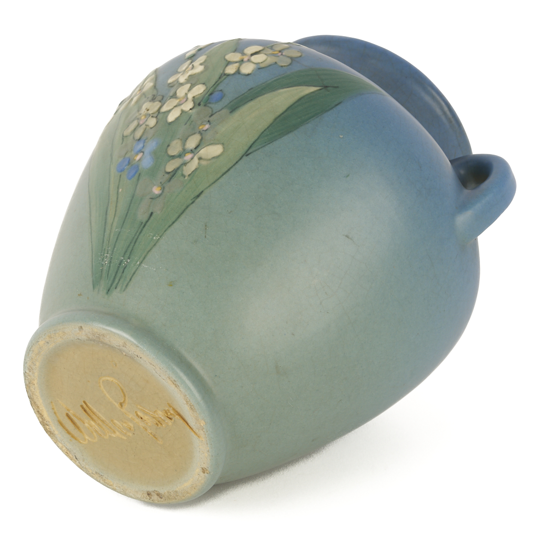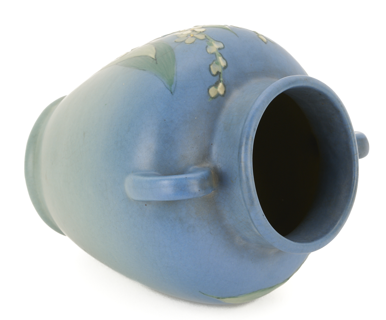 Weller Art Pottery Hudson vase with blue glaze and white floral bouquet decoration. Incised WELLER POTTERY on the base. 7 in. H x 6 1/2 in. W. Circa 1920’s.