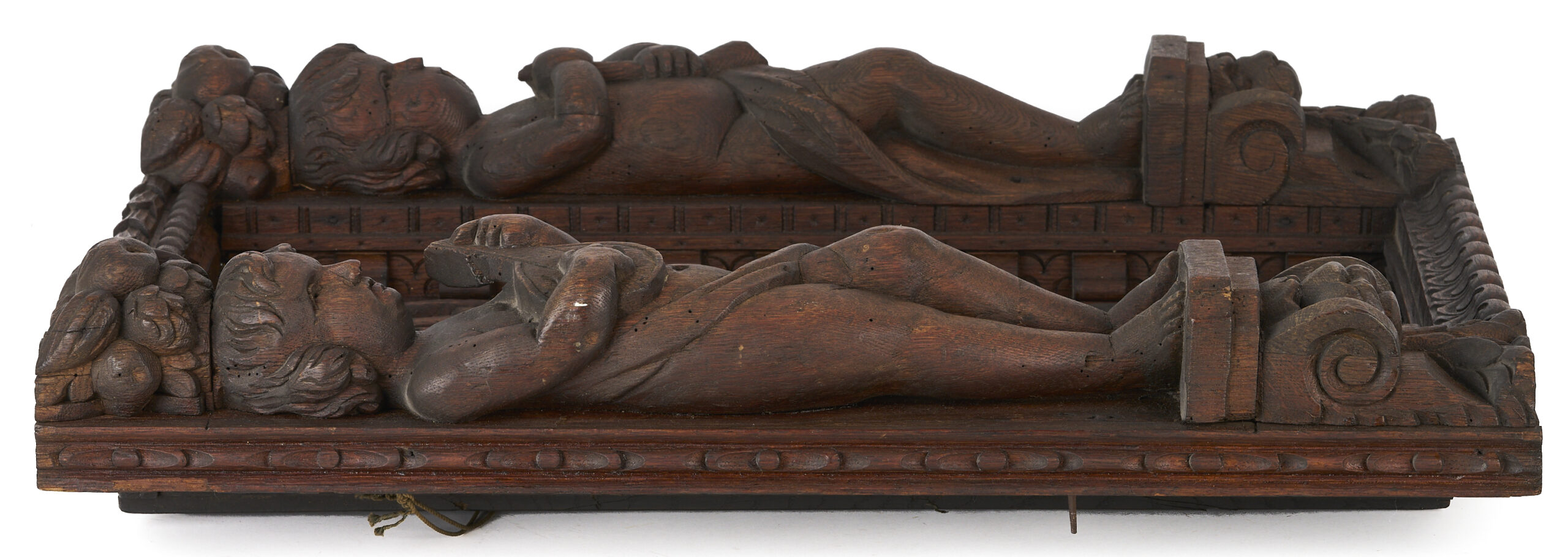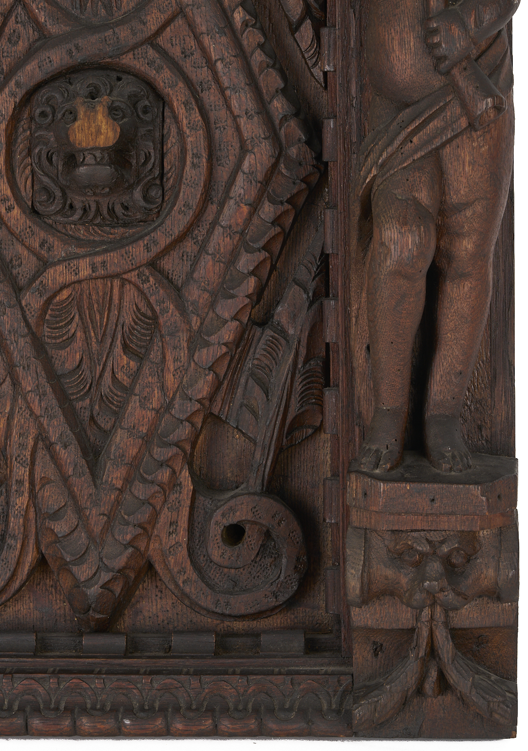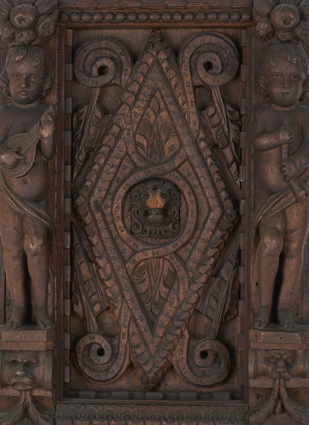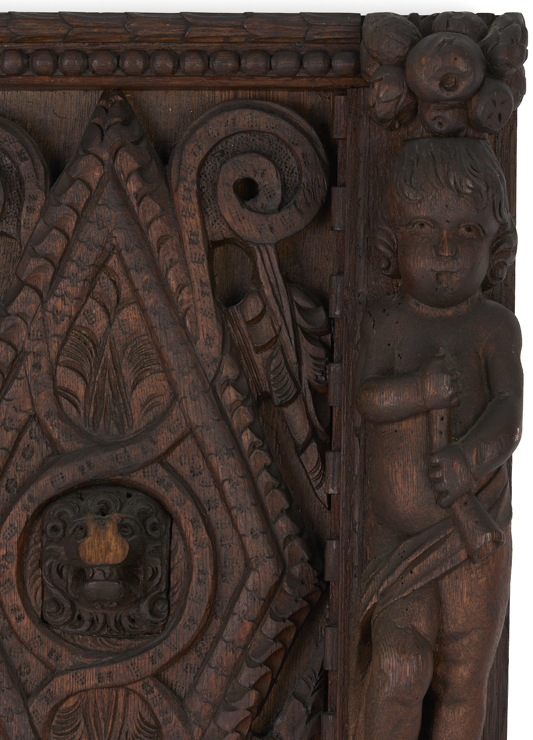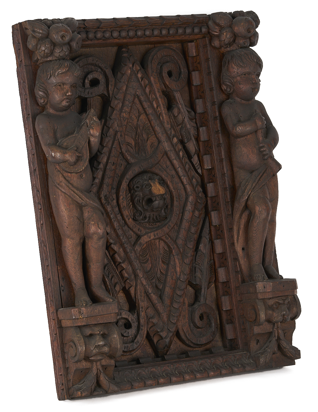 Continental carved wooden Baroque style figural door or architectural panel featuring cherubs holding musical instruments flanking a central carved lozenge with lion head mask. 26 in. H x 20 in. W x 4 3/4 in. D. Northern Europe, 19th century.