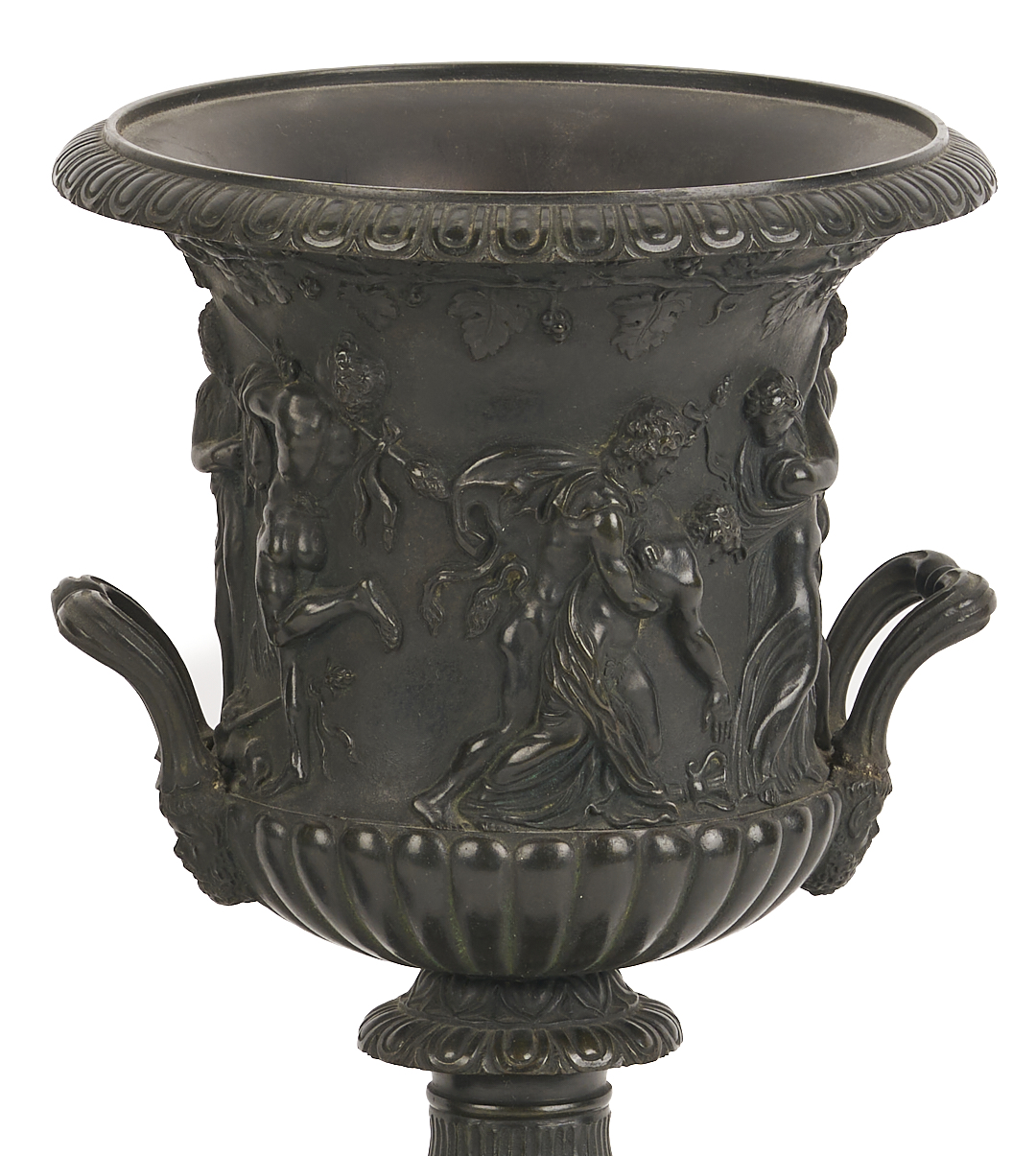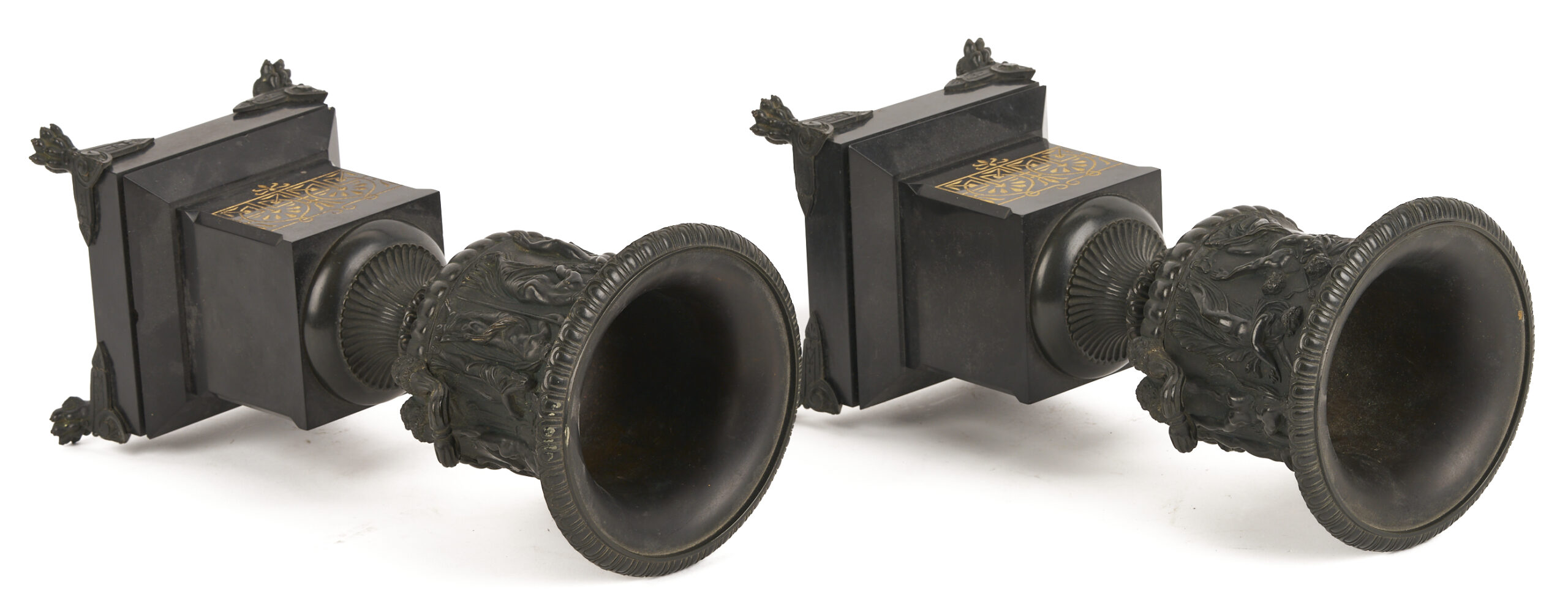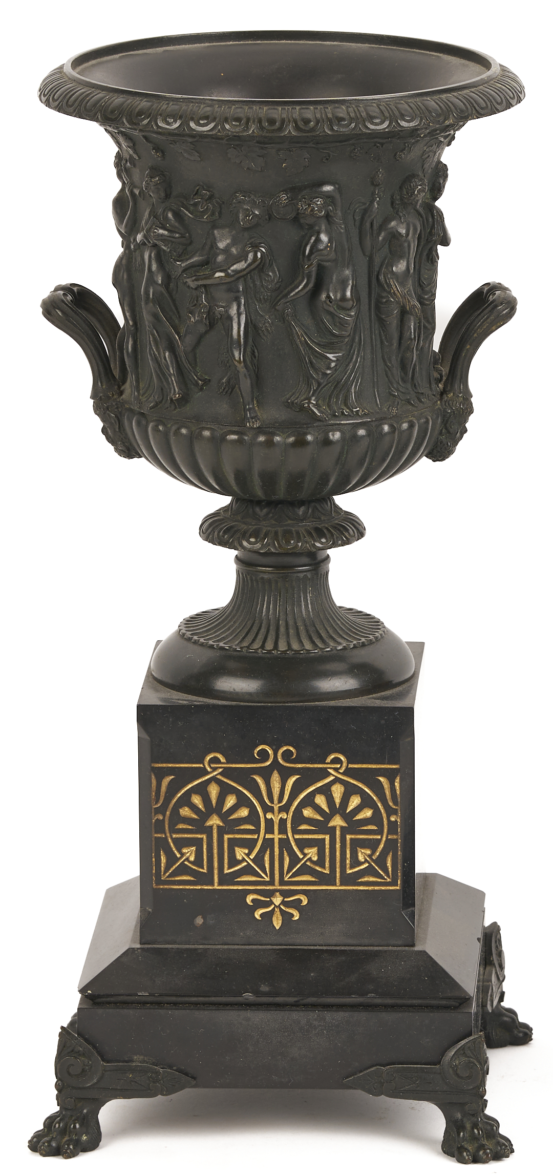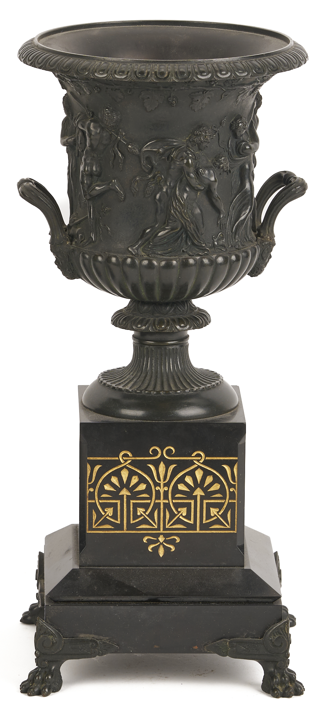 1st & 2nd items: Pair of Grand Tour bronzes depicting Mercury and Fortuna, after Giambologna (Italian, 1529-1608), each issuing from the open mouth of a cherub and mounted on red marble plinths and square slate bases. 19 1/2 in. H and 19 in. H x approx. 4 in. W. 3rd & 4th items: Pair of Grand Tour campagna form patinated bronze urns with figural decoration to the bodies. Raised on a square slate plinth with gilt decoration and square bases with patinated bronze paw feet. 13 3/4 in. H x 6 1/4 in. W. All items Late 19th/Early 20th century.