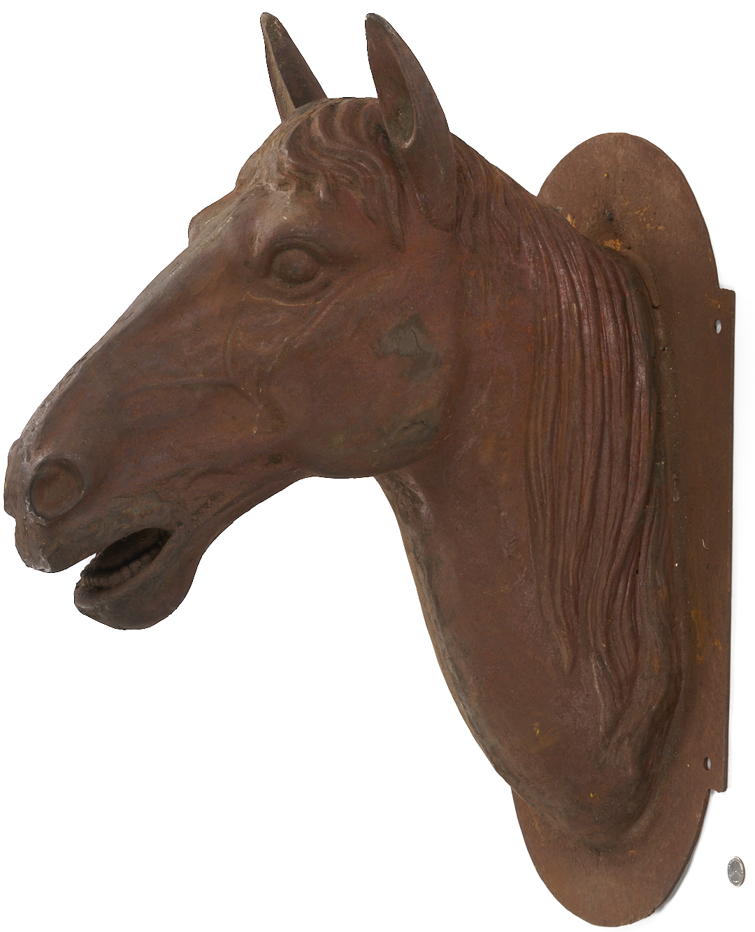A life-sized wall-mounted cast iron livery stable horse head with an oblong backplate for mounting. Unmarked. 20th century or earlier. 29 1/2 in. H x 14 1/2 in. W x 21 1/2 in. D.