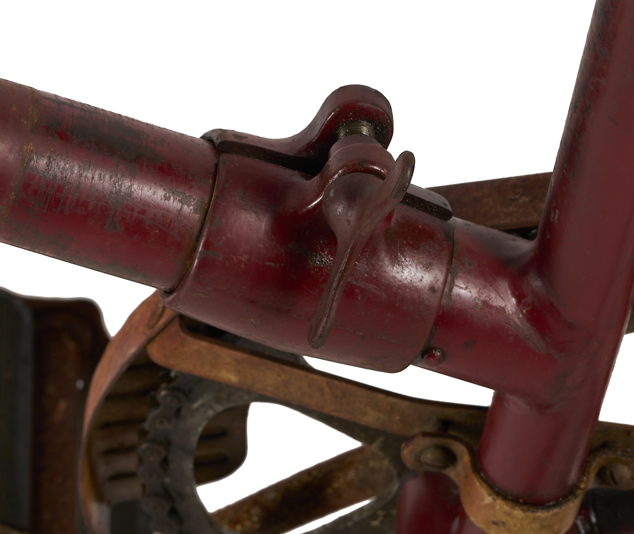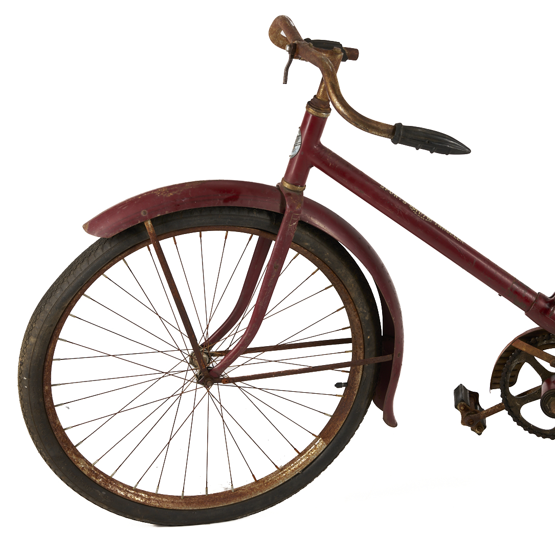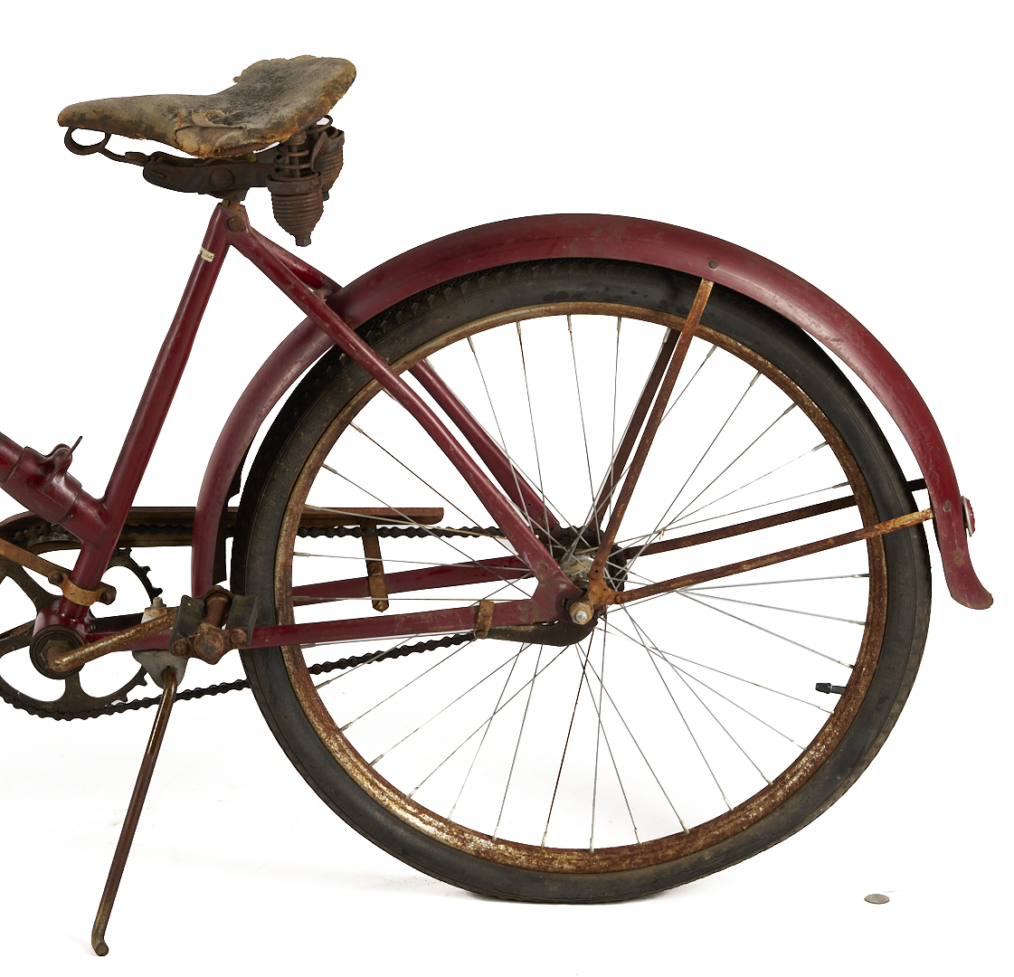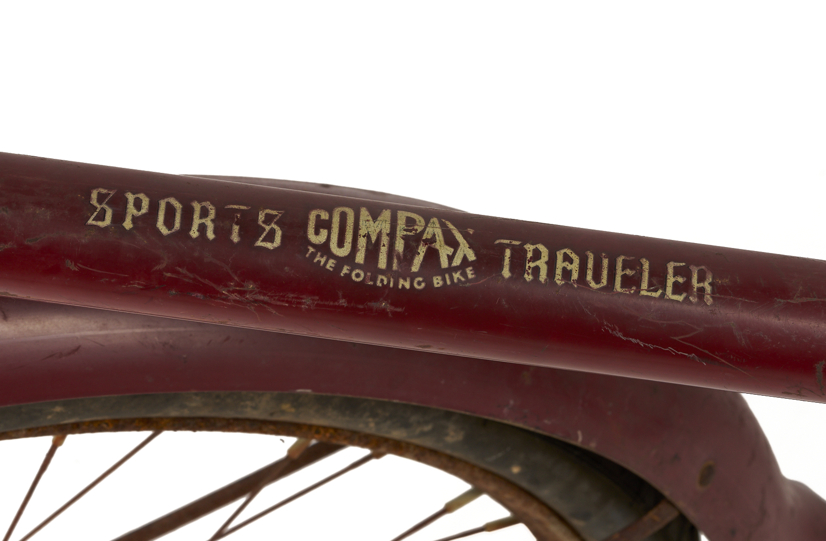 1940s Westfield Compax collapsible bicycle manufactured in Westfield, Massachusetts, with original paint. Serial #K161883, rear hub stamped “New Departure, Model D, Made in U.S.A.” Measures approximately 71 in. L and 36 in. H. Note: A U.S. Patent was filed on Dec. 23, 1937 for “the improvement of collapsible bicycles” with six unique features to allow a bike to fold into a small space for easy storage and transport, including folding handlebars and a take-apart frame. The first Westfield made Compax bikes went into production in the 1940s. Around the same time, the US military had been experimenting with take-apart bikes. The Marines used a Westfield made Compax in their Paratrooper trials, leading to the Paratrooper name and legend, which Westfield eagerly played up in their advertising. The U.S. Military never actually approved these bikes for paratrooper use, but many were purchased by the military for use on bases.