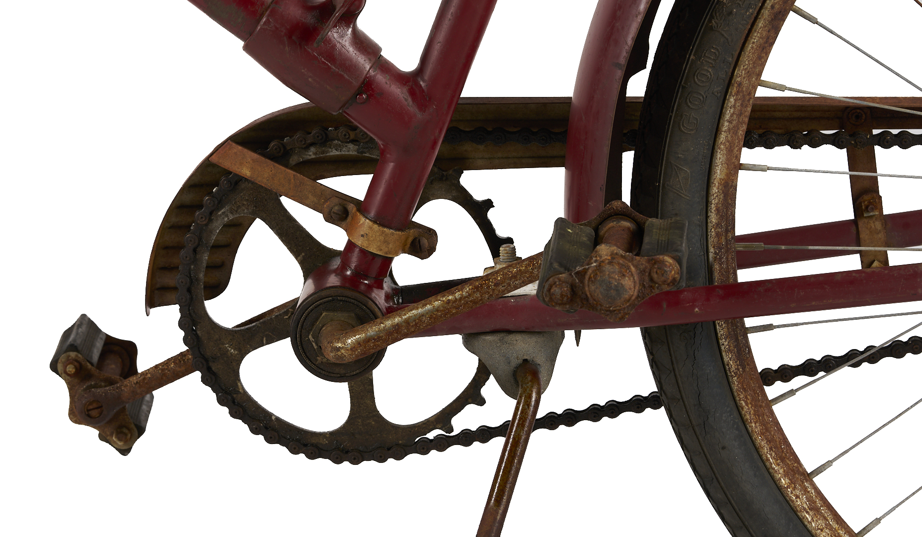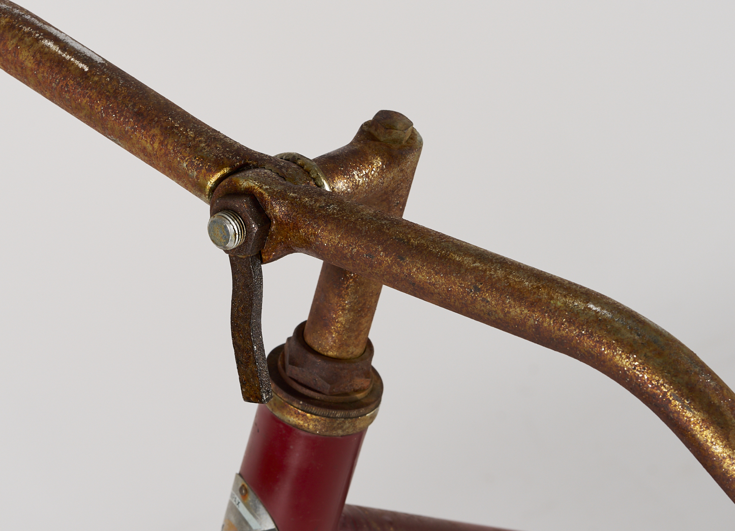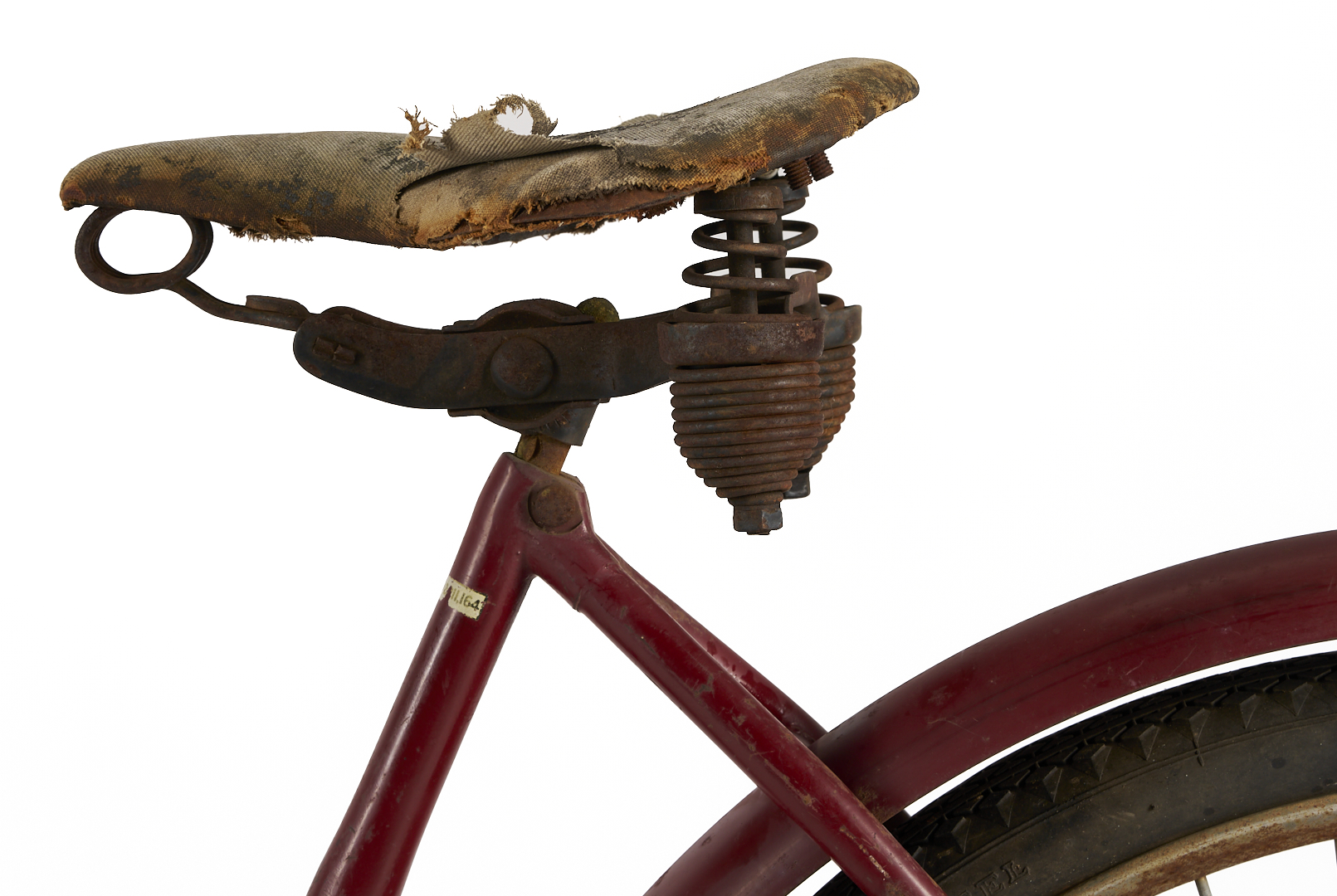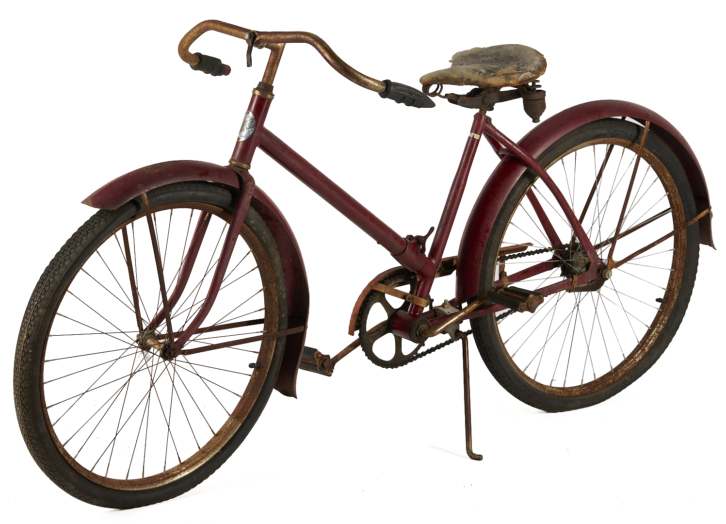 1940s Westfield Compax collapsible bicycle manufactured in Westfield, Massachusetts, with original paint. Serial #K161883, rear hub stamped “New Departure, Model D, Made in U.S.A.” Measures approximately 71 in. L and 36 in. H. Note: A U.S. Patent was filed on Dec. 23, 1937 for “the improvement of collapsible bicycles” with six unique features to allow a bike to fold into a small space for easy storage and transport, including folding handlebars and a take-apart frame. The first Westfield made Compax bikes went into production in the 1940s. Around the same time, the US military had been experimenting with take-apart bikes. The Marines used a Westfield made Compax in their Paratrooper trials, leading to the Paratrooper name and legend, which Westfield eagerly played up in their advertising. The U.S. Military never actually approved these bikes for paratrooper use, but many were purchased by the military for use on bases.