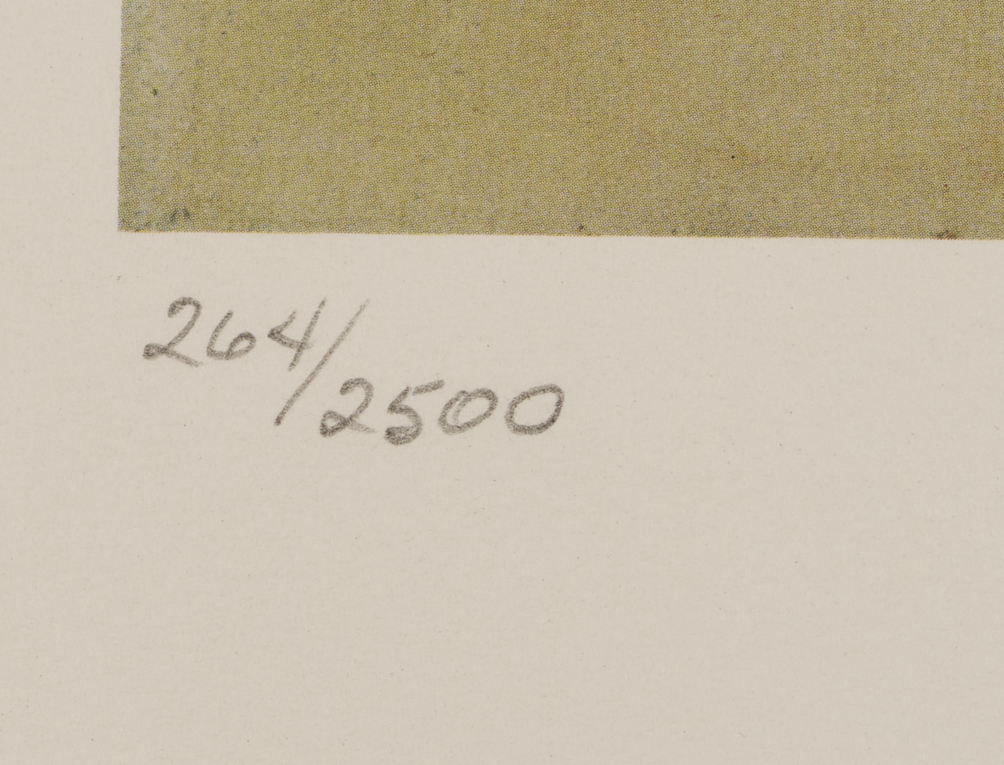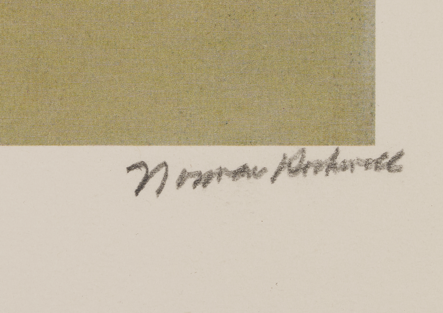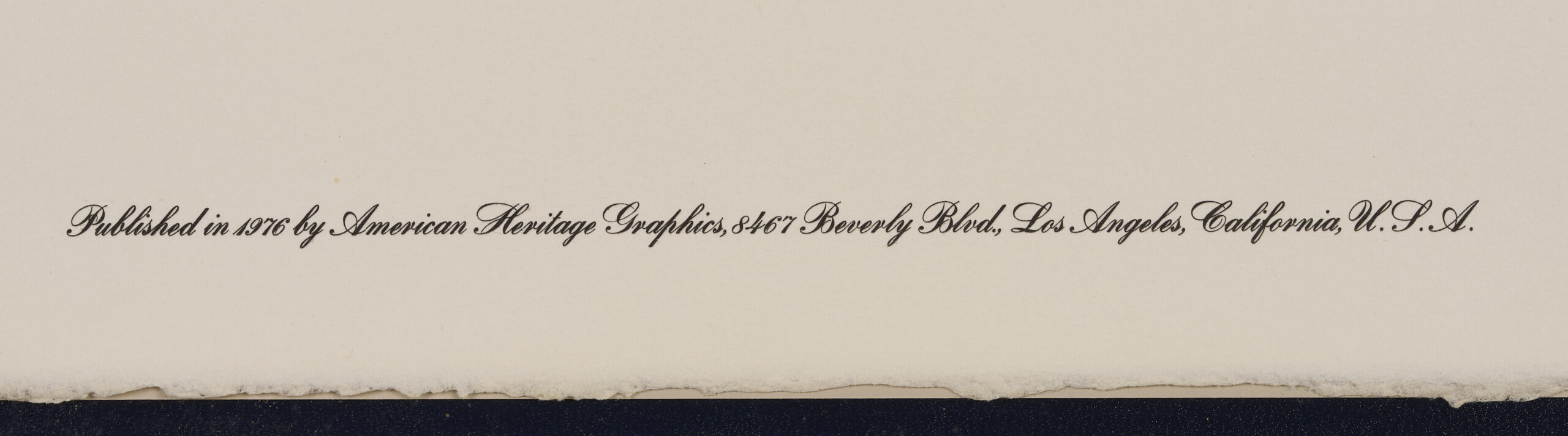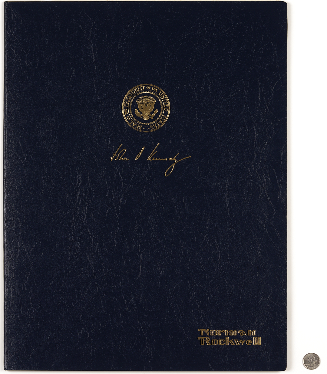 Norman Perceval Rockwell (New York/Massachusetts, 1894-1978) offset lithograph in colors depicting a bust-length portrait of President John F. Kennedy, with Rockwell’s name in block letters in the plate, lower right. On wove paper with deckled lower edge and publisher’s information printed in lower margin. Pencil signed and numbered 264/2500, lower margin. With blue, leather-grained American Heritage Graphics booklet with presidential seal and artist’s name on cover and containing a reproduction of a Rockwell letter concerning the portrait along with a note to the collector, plus a similar but larger display portfolio with interior corner fasteners. Lot also includes a certificate of authenticity which states that the print is a driograph (a form of lithography) produced by Jeffries Banknote Company in 1976 and signed by Lawrence L. Jeffries of Jeffries Banknote Company and Robert A. Drew, Director, American Heritage Graphics, along with a 1980 American Heritage Graphics letter stating that “no more than 2,550 impressions of the prints were pulled” of which “228 were signed by the artist,” signed by Robert F. Drew (by then the former Director of American Heritage Graphics) and additionally signed and dated March 11, 1980, by a Los Angeles County Notary Public. Unframed. Sheet: 19 3/4 in. H x 15 in. W. Booklet: 8 7/8 in. H x 5 3/4 in. W. Larger portfolio: 20 3/4 in. H x 15 3/4 in. W.