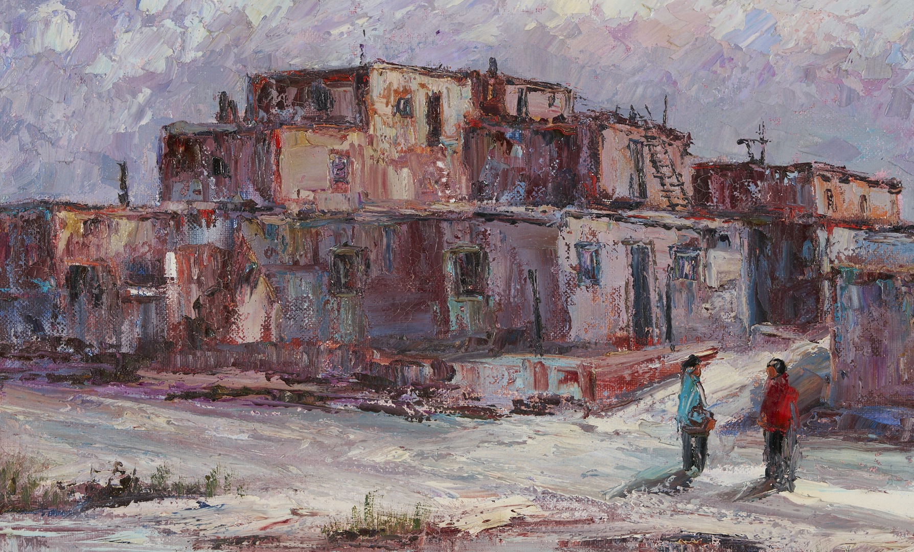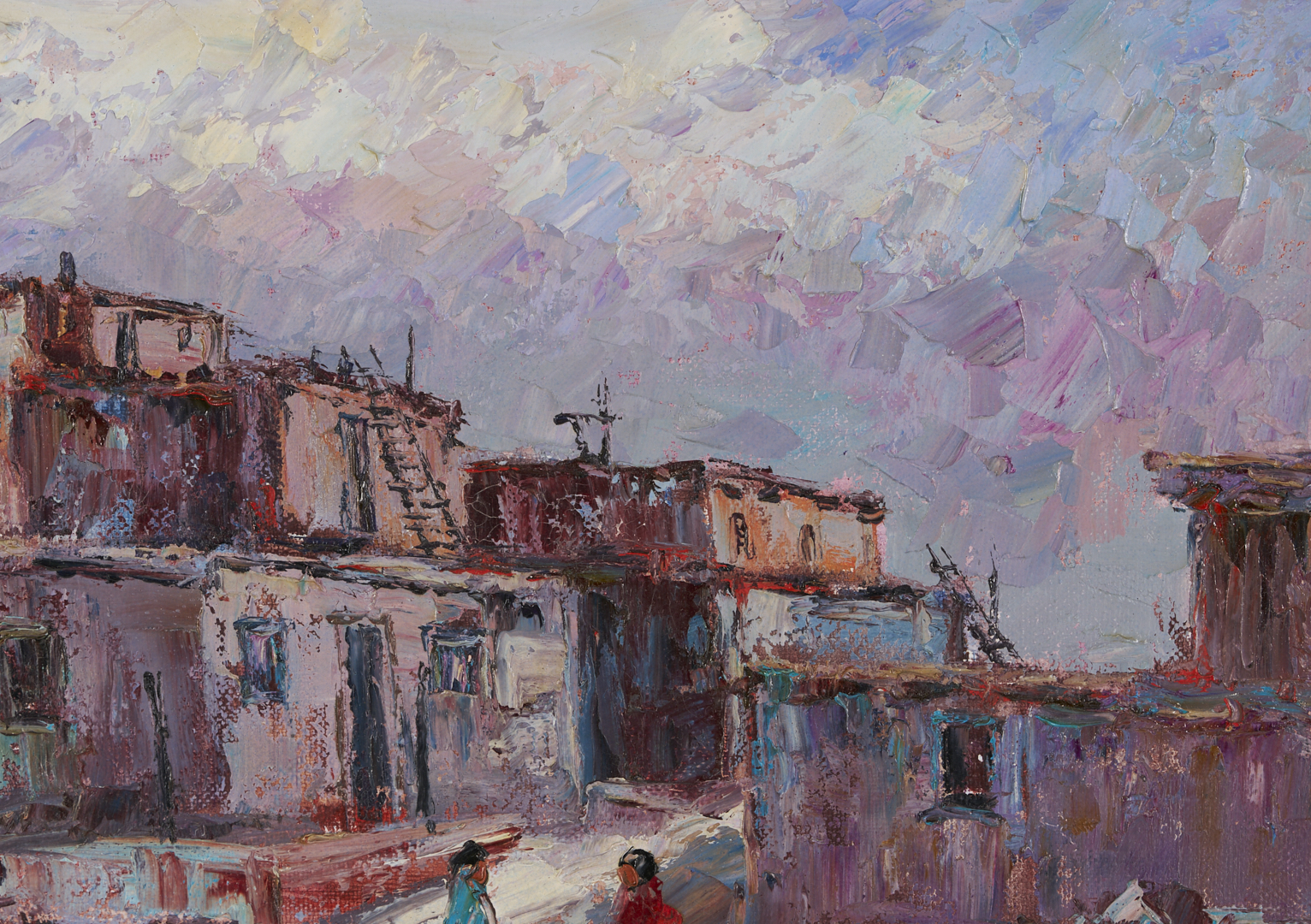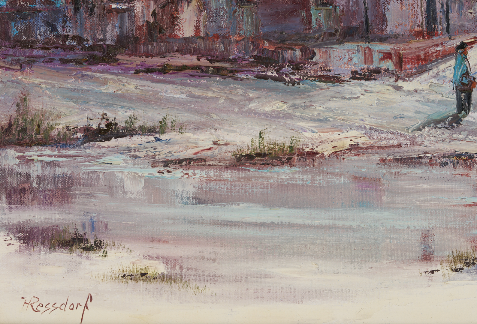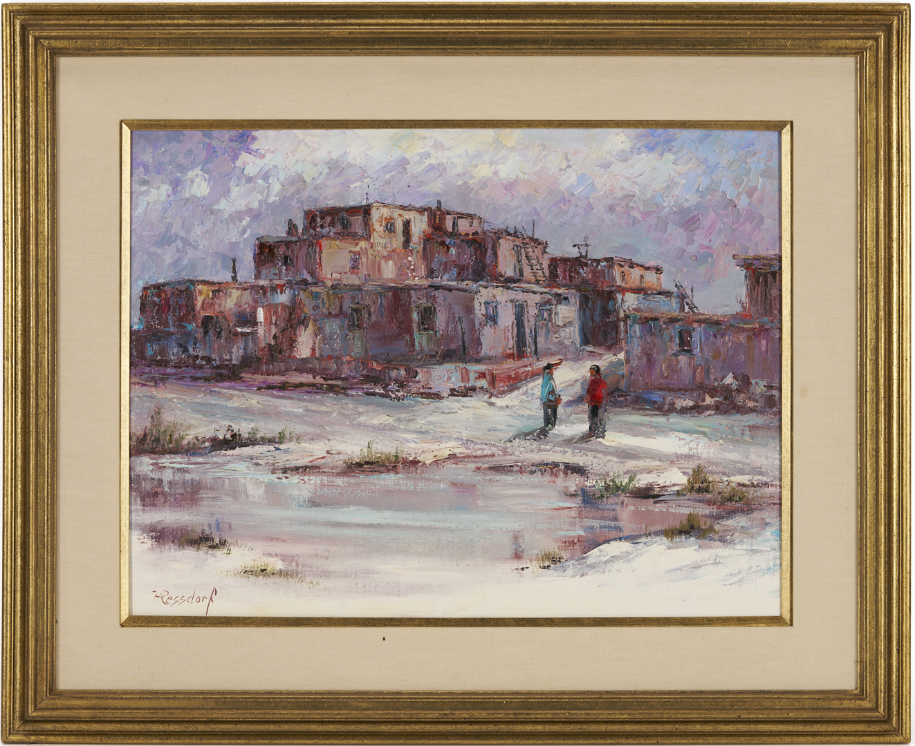 Hans Ressdorf (Arizona/Germany, 1918-2011) oil on canvas southwestern Pueblo village scene painting. Two figures converse in a road that leads through a snowy landscape, with adobe buildings in the background and a frozen pond that fills the foreground. Signed lower left. Housed in a giltwood frame with textile liner and gilt fillet. Sight: 17 1/2 in. H x 23 1/2 in. W. Framed: 26 1/2 in. H x 32 3/4 in. W.