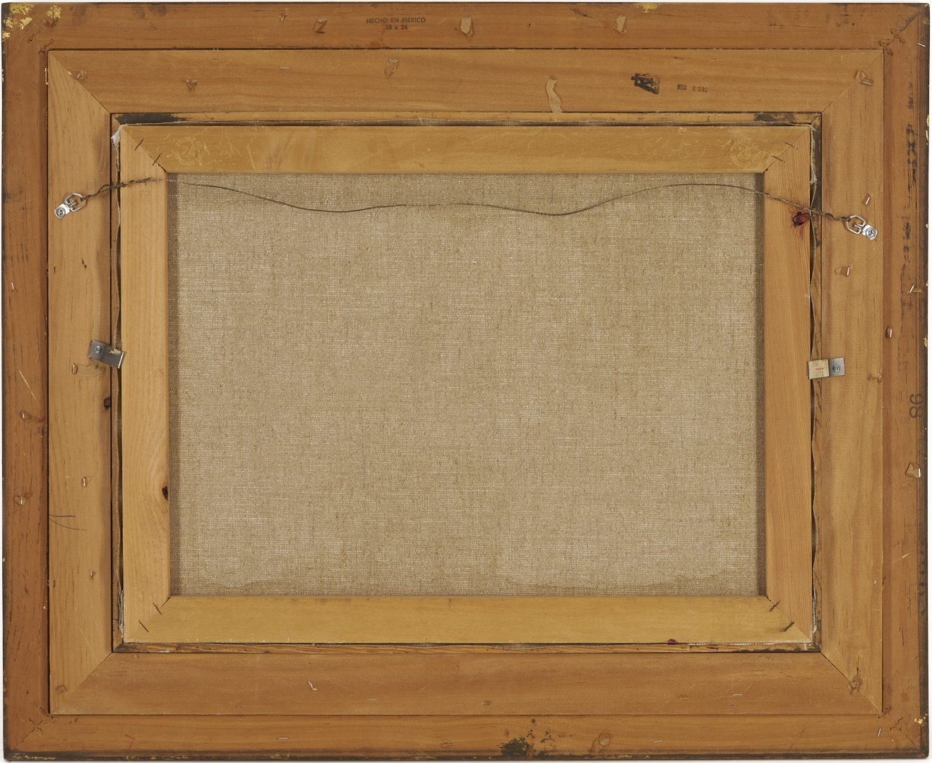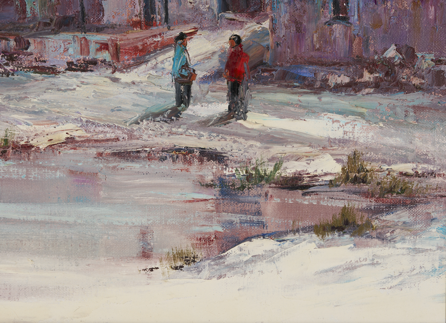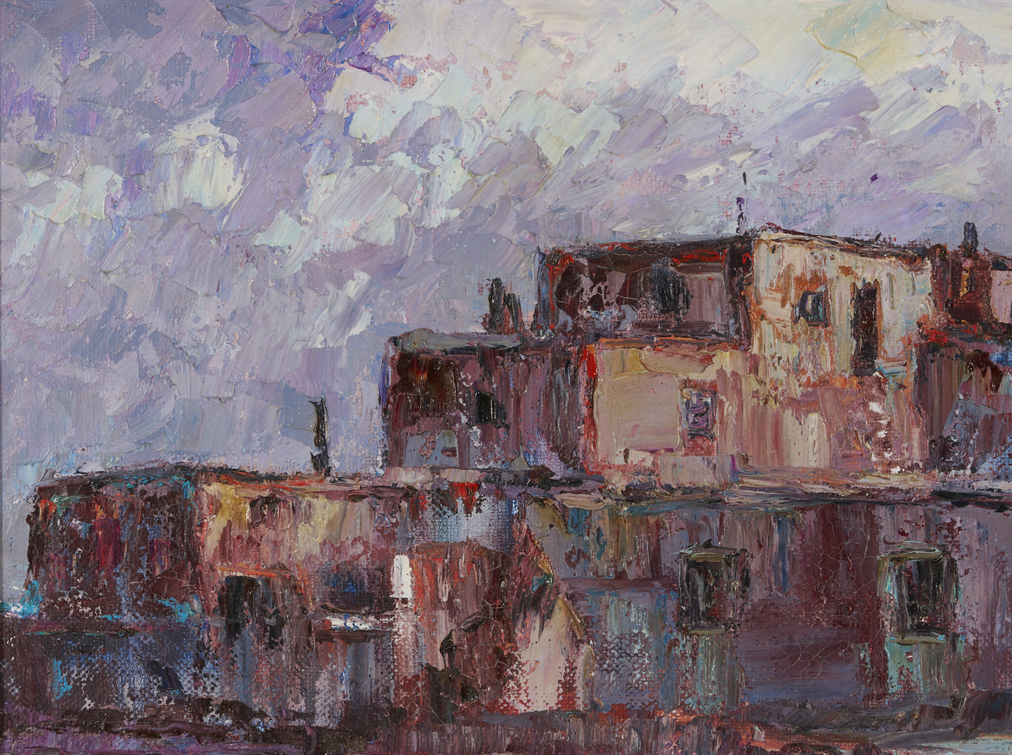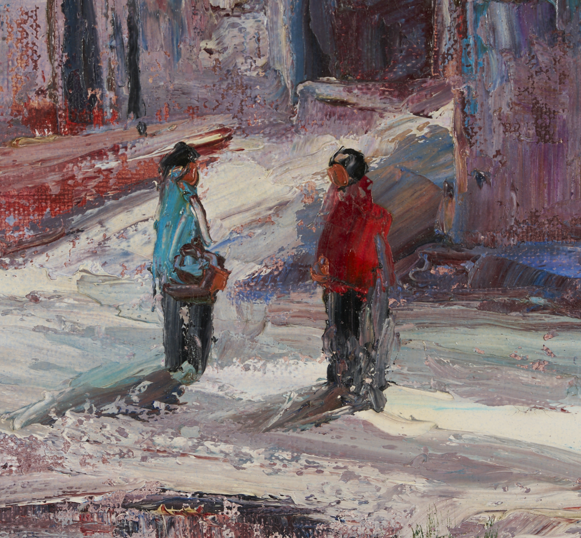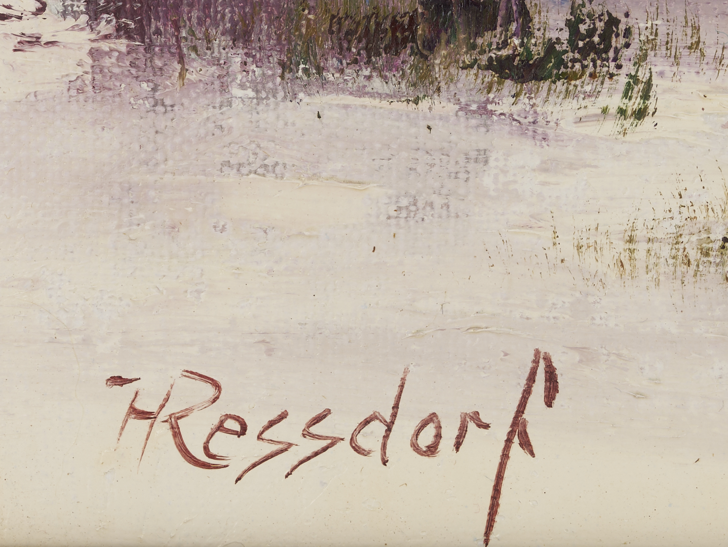 Hans Ressdorf (Arizona/Germany, 1918-2011) oil on canvas southwestern Pueblo village scene painting. Two figures converse in a road that leads through a snowy landscape, with adobe buildings in the background and a frozen pond that fills the foreground. Signed lower left. Housed in a giltwood frame with textile liner and gilt fillet. Sight: 17 1/2 in. H x 23 1/2 in. W. Framed: 26 1/2 in. H x 32 3/4 in. W.