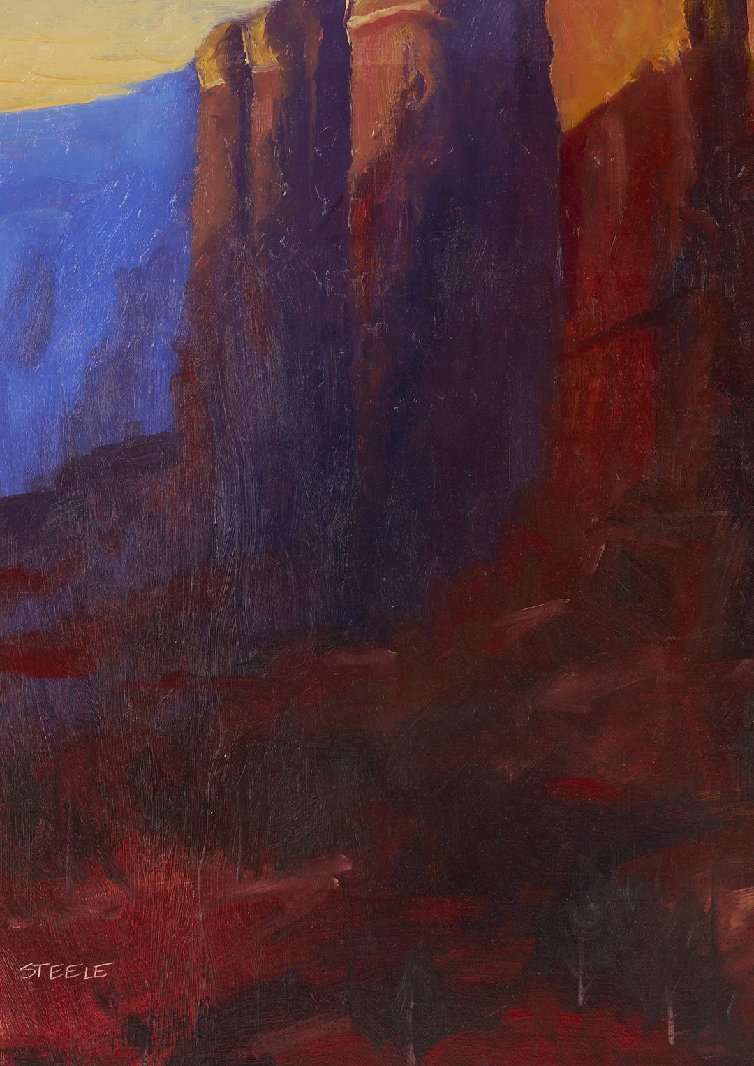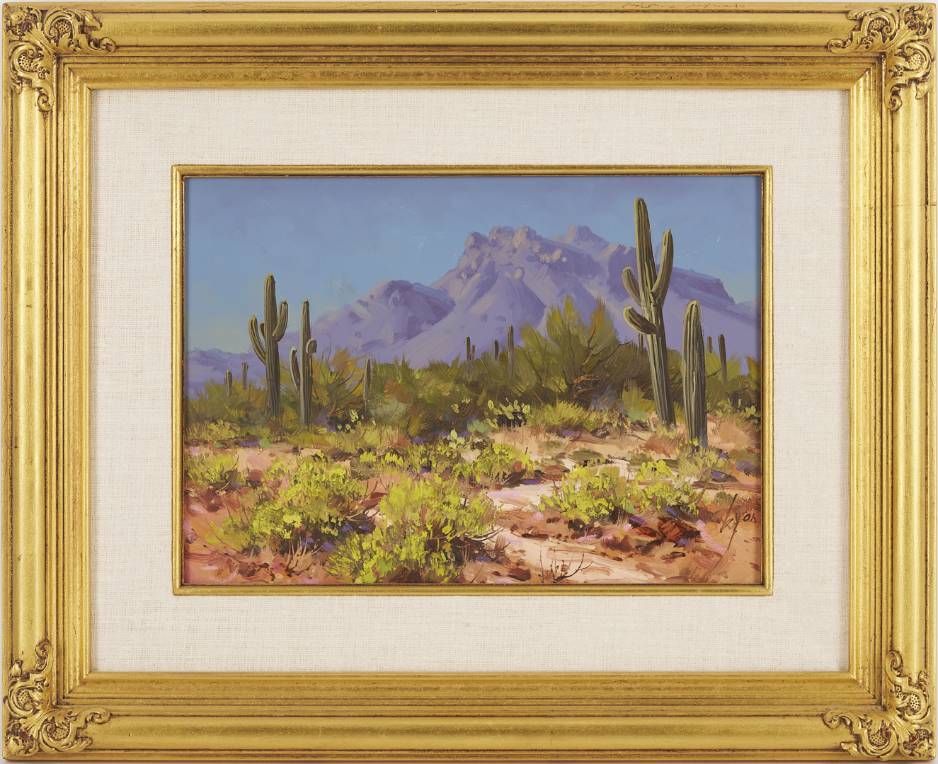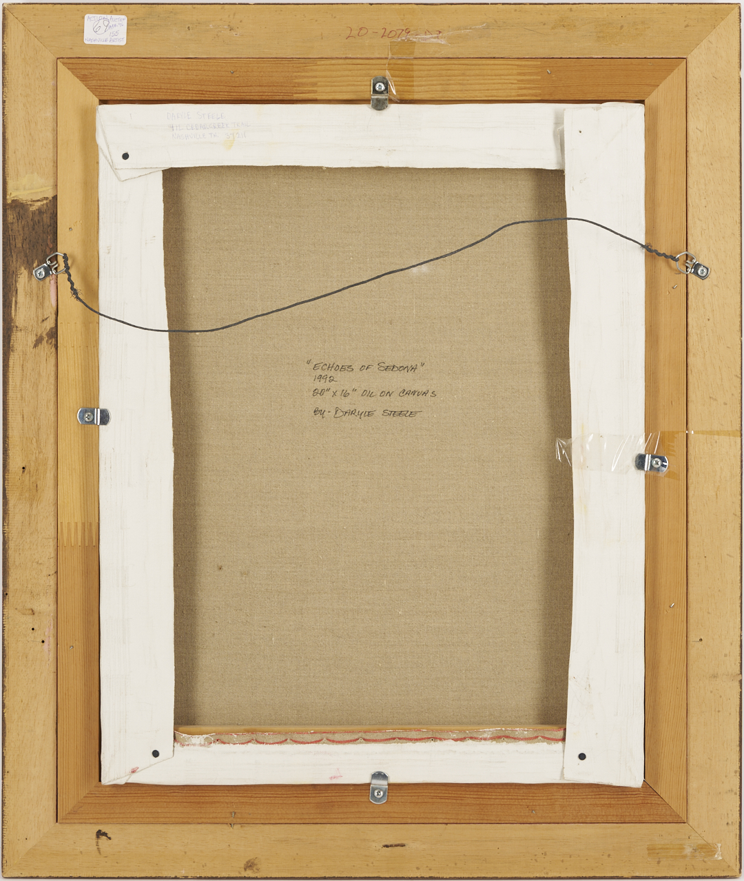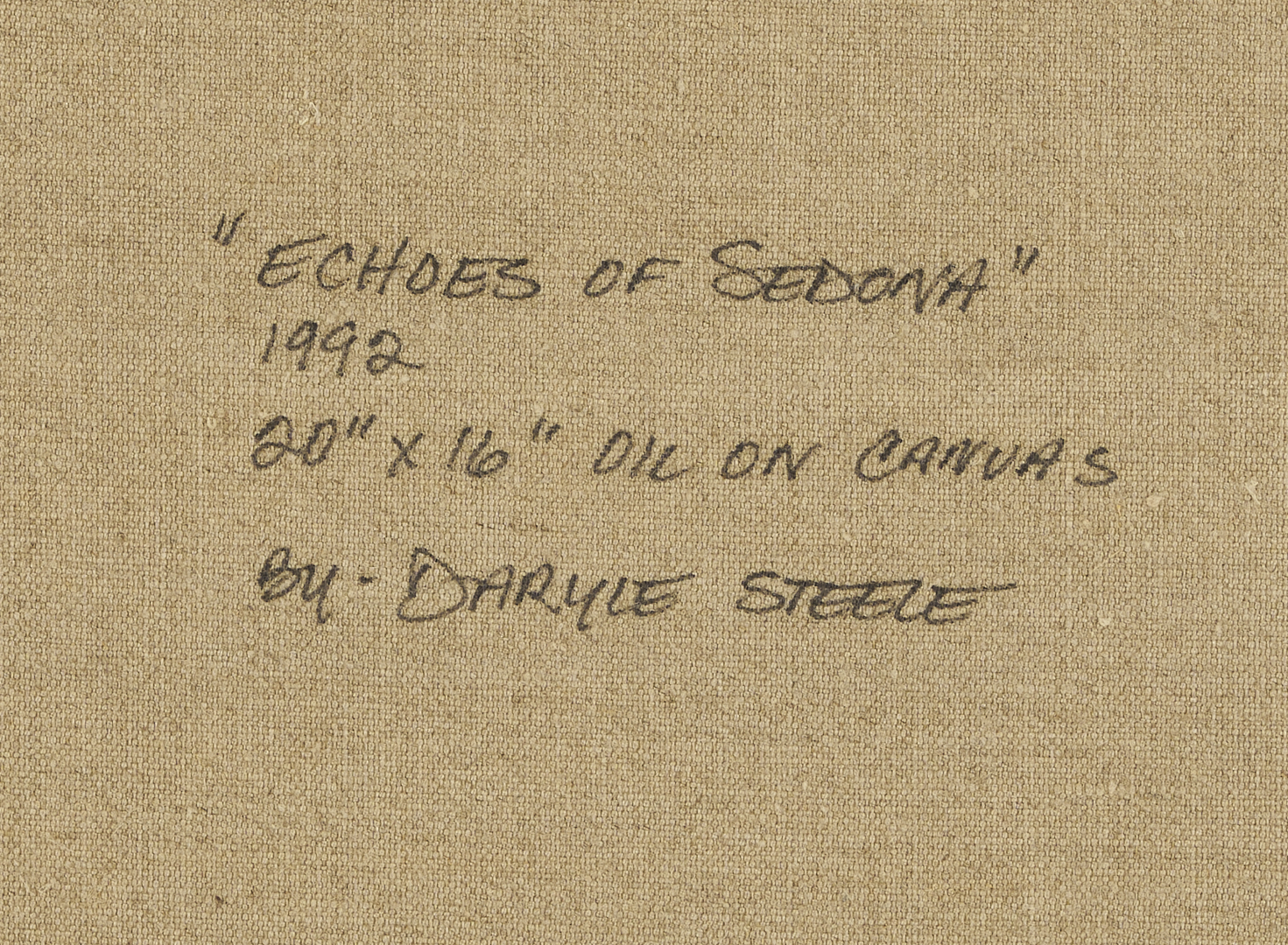 1st item: Harold Lyon (Arizona/Canada, 1930-2020) oil on board Southwest desert, likely Arizona, landscape painting with sagebrush and cacti in the foreground and purple mountains in the background. Signed lower right. Housed in a molded giltwood frame with carved corner elements and linen liner. Sight: 9 3/4 in. H x 13 5/8 in. W. Framed: 17 3/4 in. H x 22 in. W. 2nd item: Darryl Glenn Steele (Tennessee, b.1956) oil on canvas landscape painting, “Echoes of Sedona,” that depicts a steep red rock formation in front of a blue mountainous background. Signed “Steele” lower left. Additionally signed, titled, and dated “1992” en verso. Housed in a contemporary gilt frame with a linen liner. Sight: 19 3/4 in. H x 15 3/4 in. W. Framed: 26 in. H x 21 3/4 in. W.